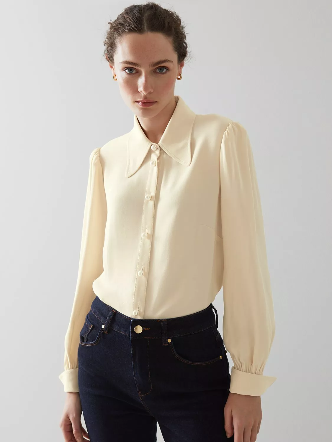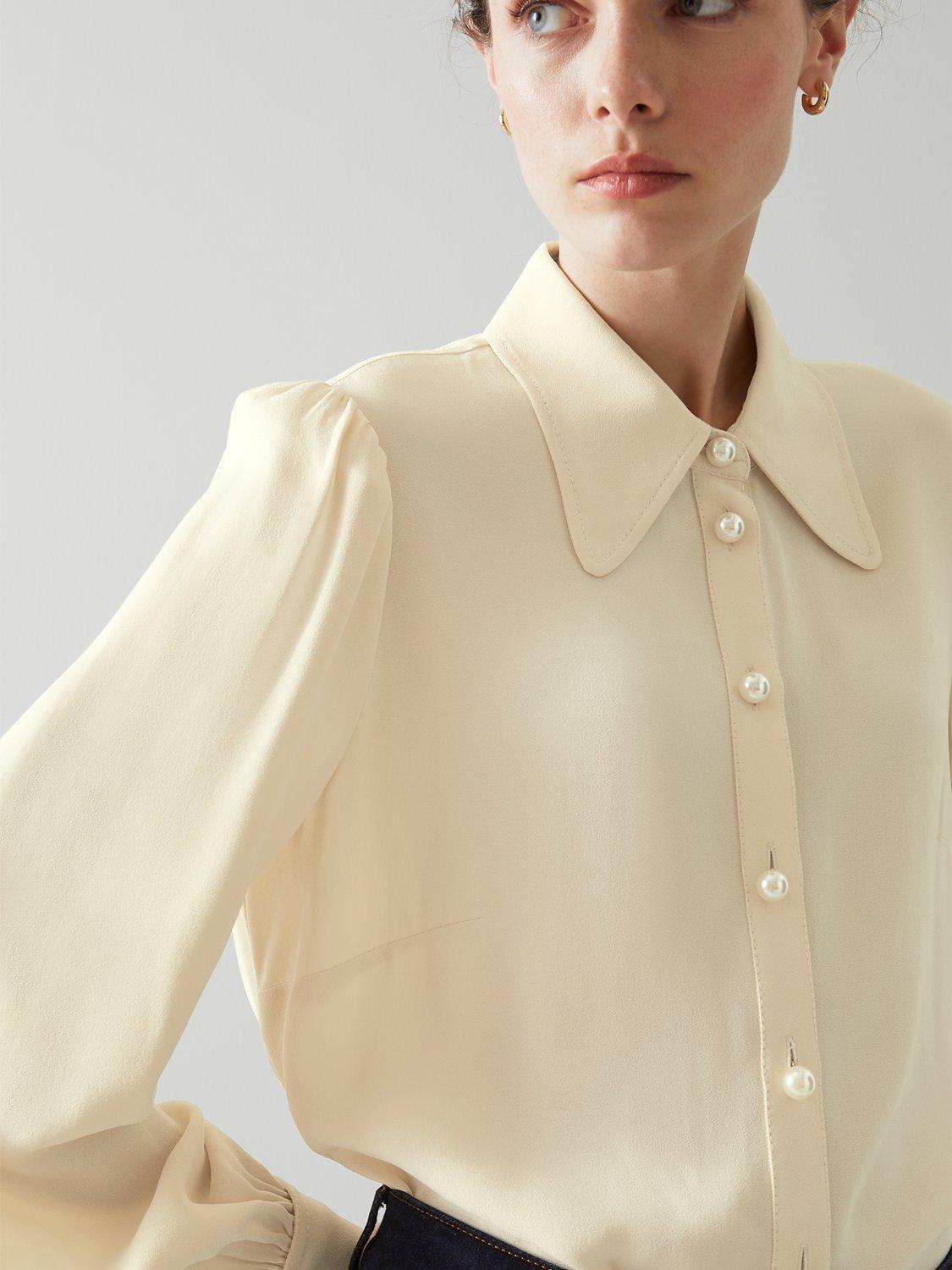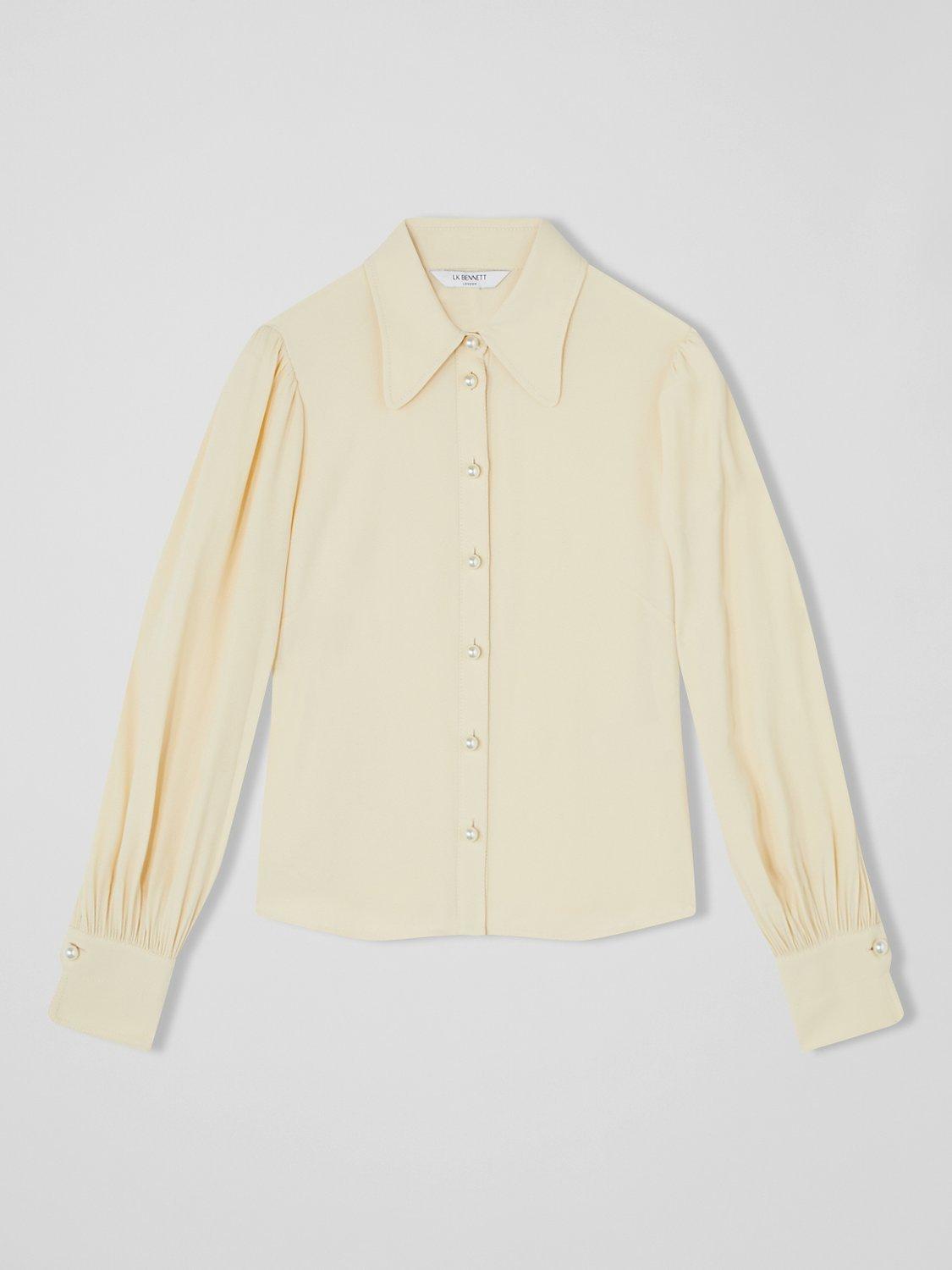 A nod to vintage, the Sonya blouse from L.K.Bennett is one to match with tailoring and evening pieces. Fastening with pearlescent buttons that lead to a rounded out collar, mini puff detail to the shoulders give it a sophisticated touch with smart button cuffs to finish.