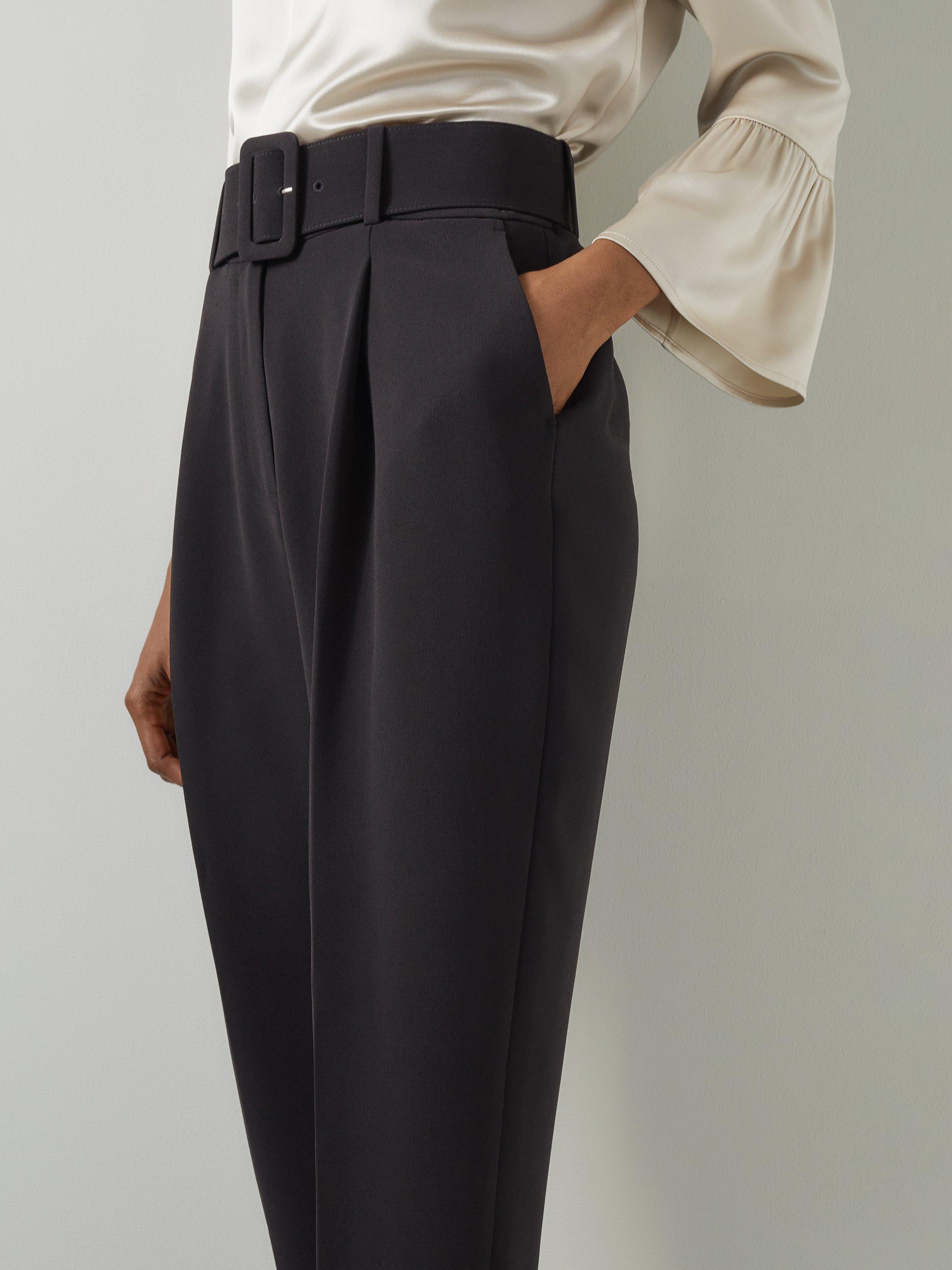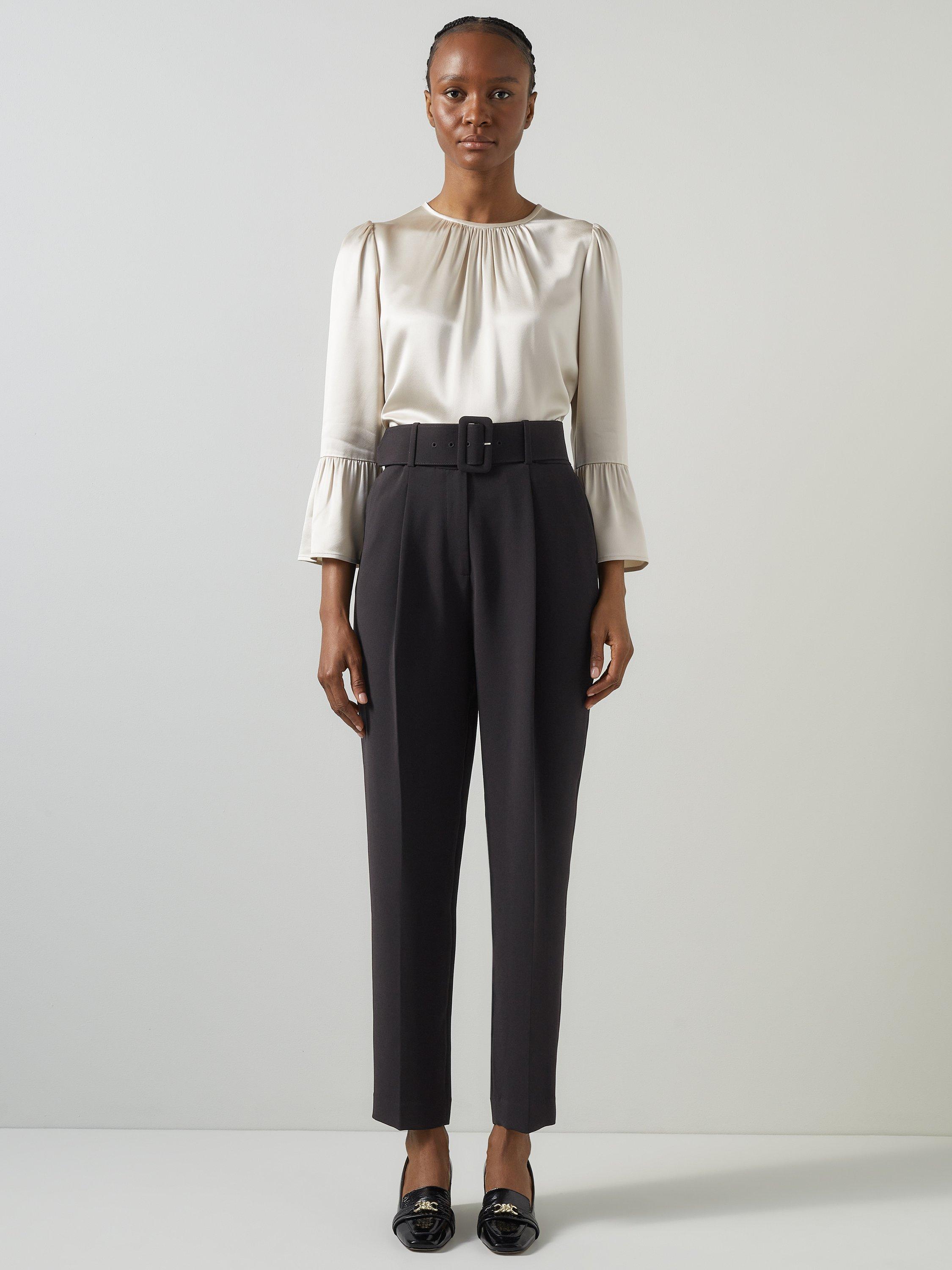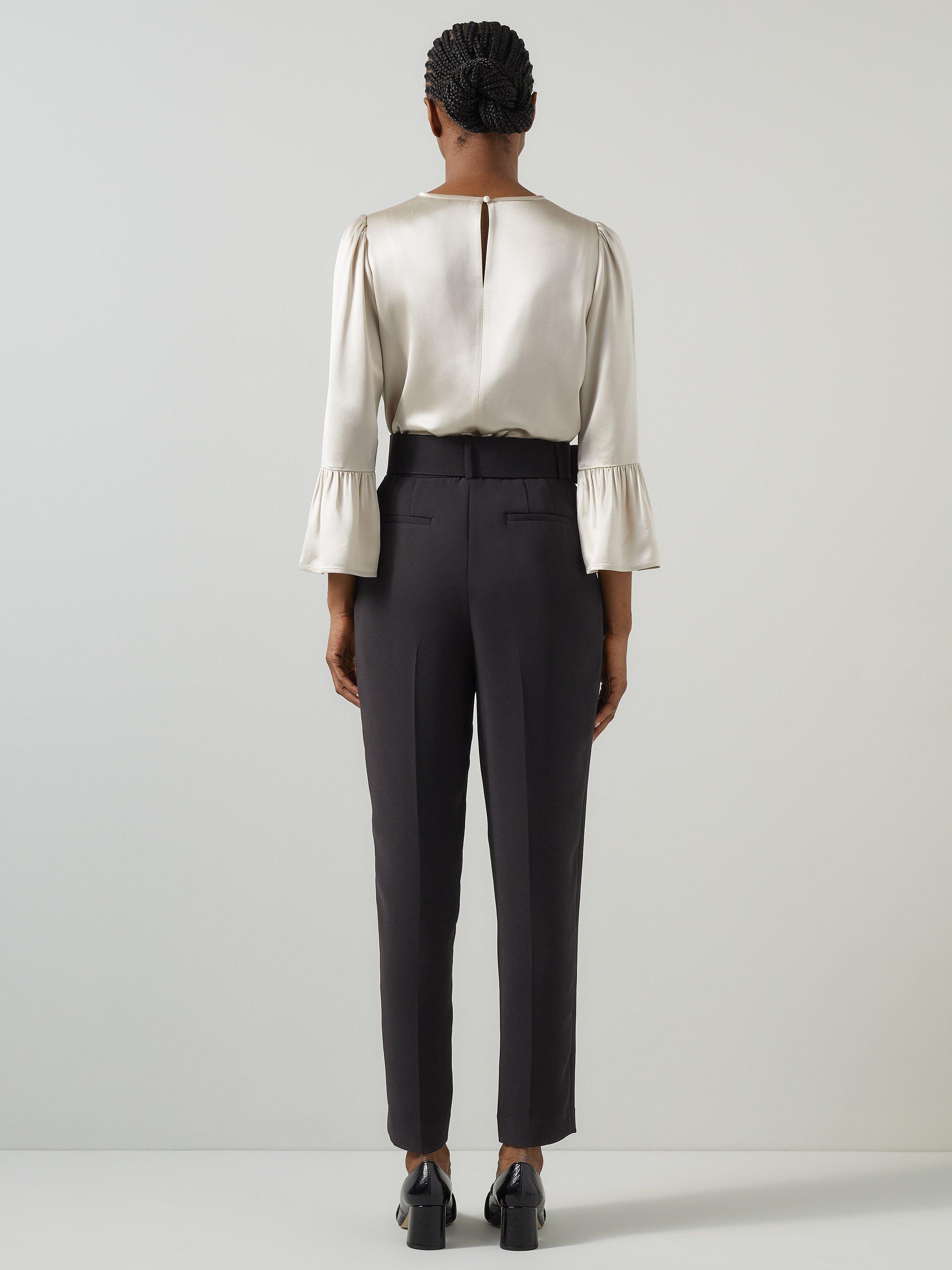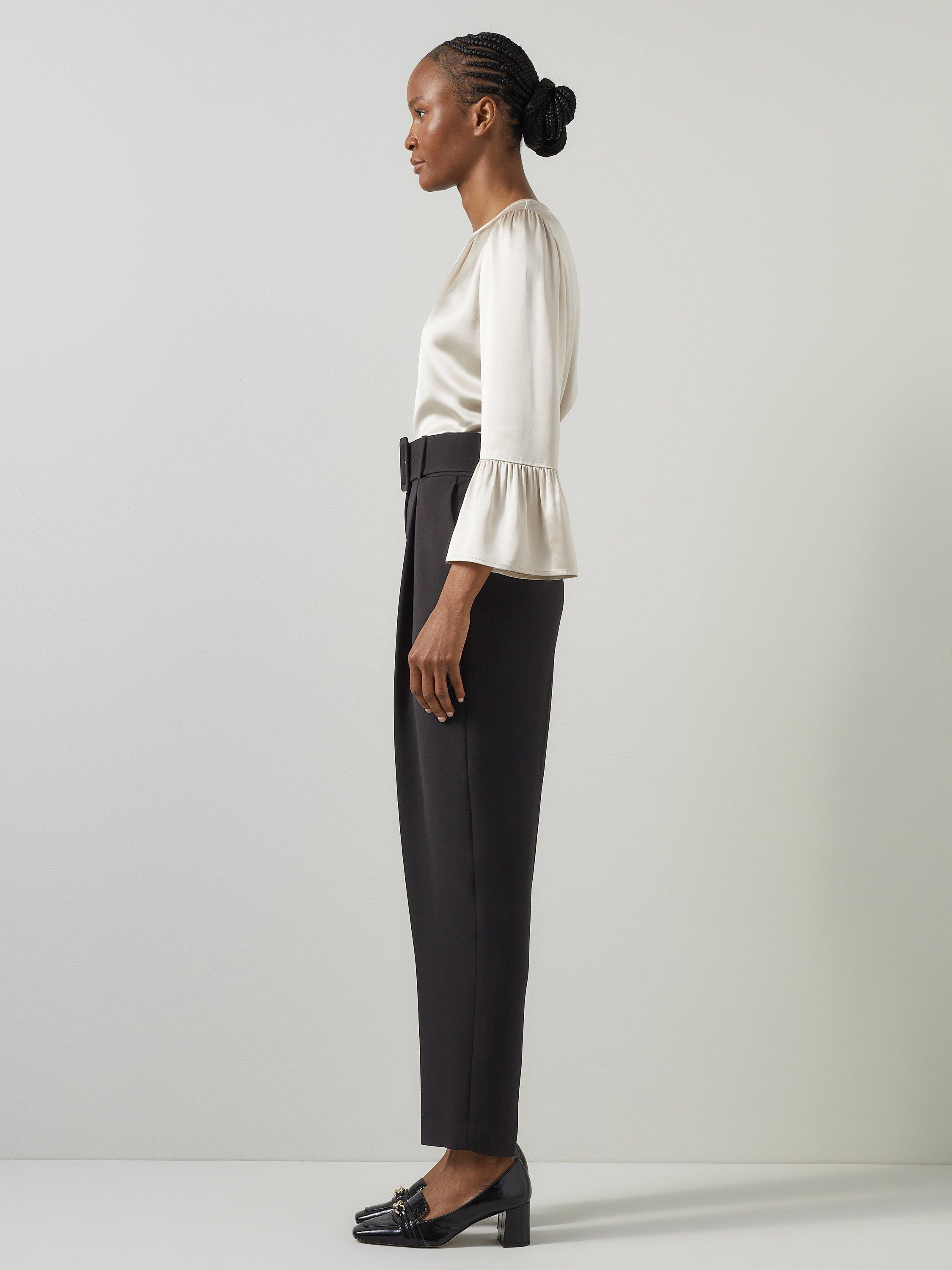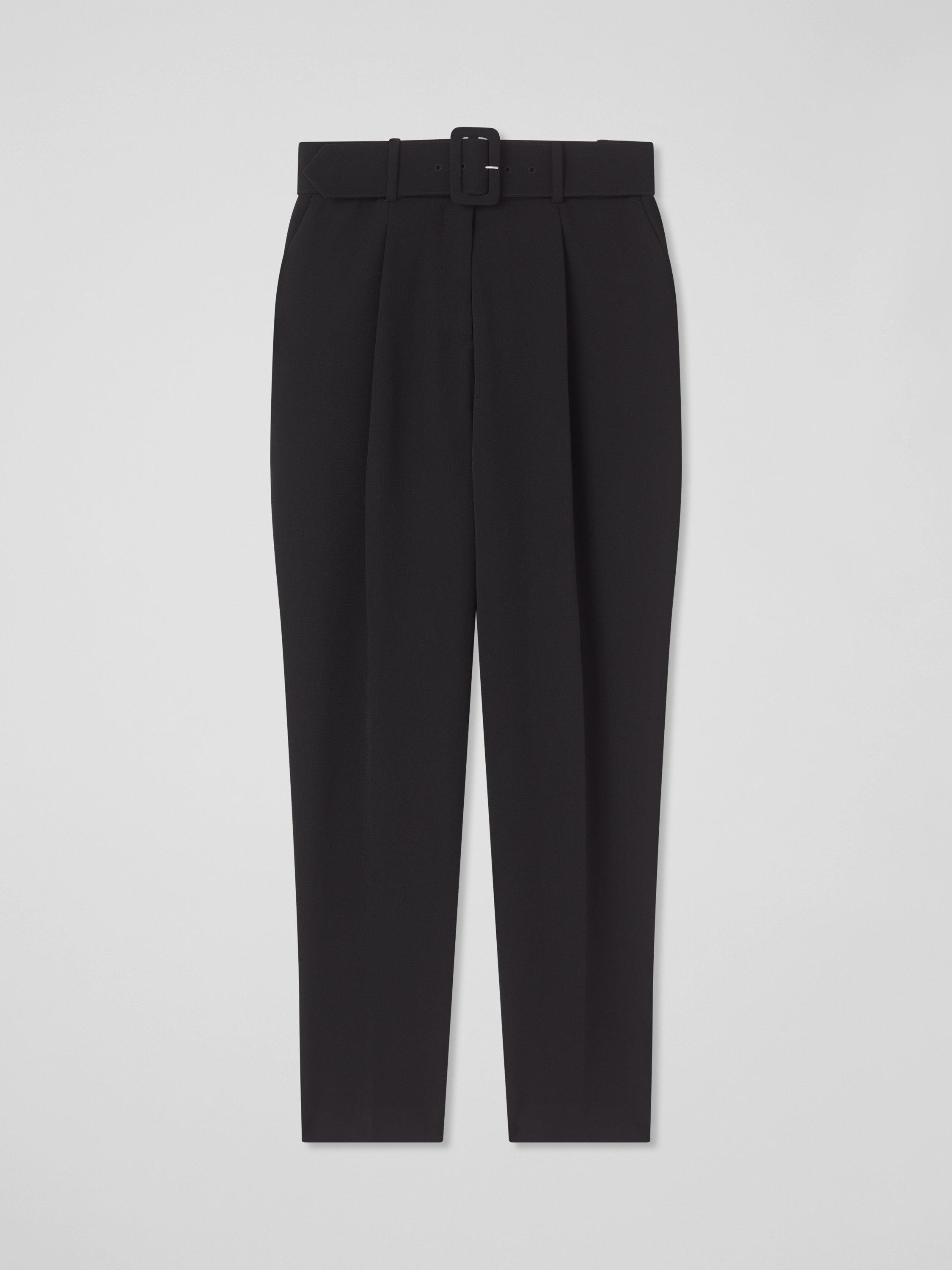 Embrace timeless elegance with the Tabitha Belted Crepe Trousers. These impeccably tailored trousers feature a removable belt, front zip, and hook and eye fastening, crafted from luxurious crepe. Perfect with a crisp blouse for the office or a stylish top for evening outings.