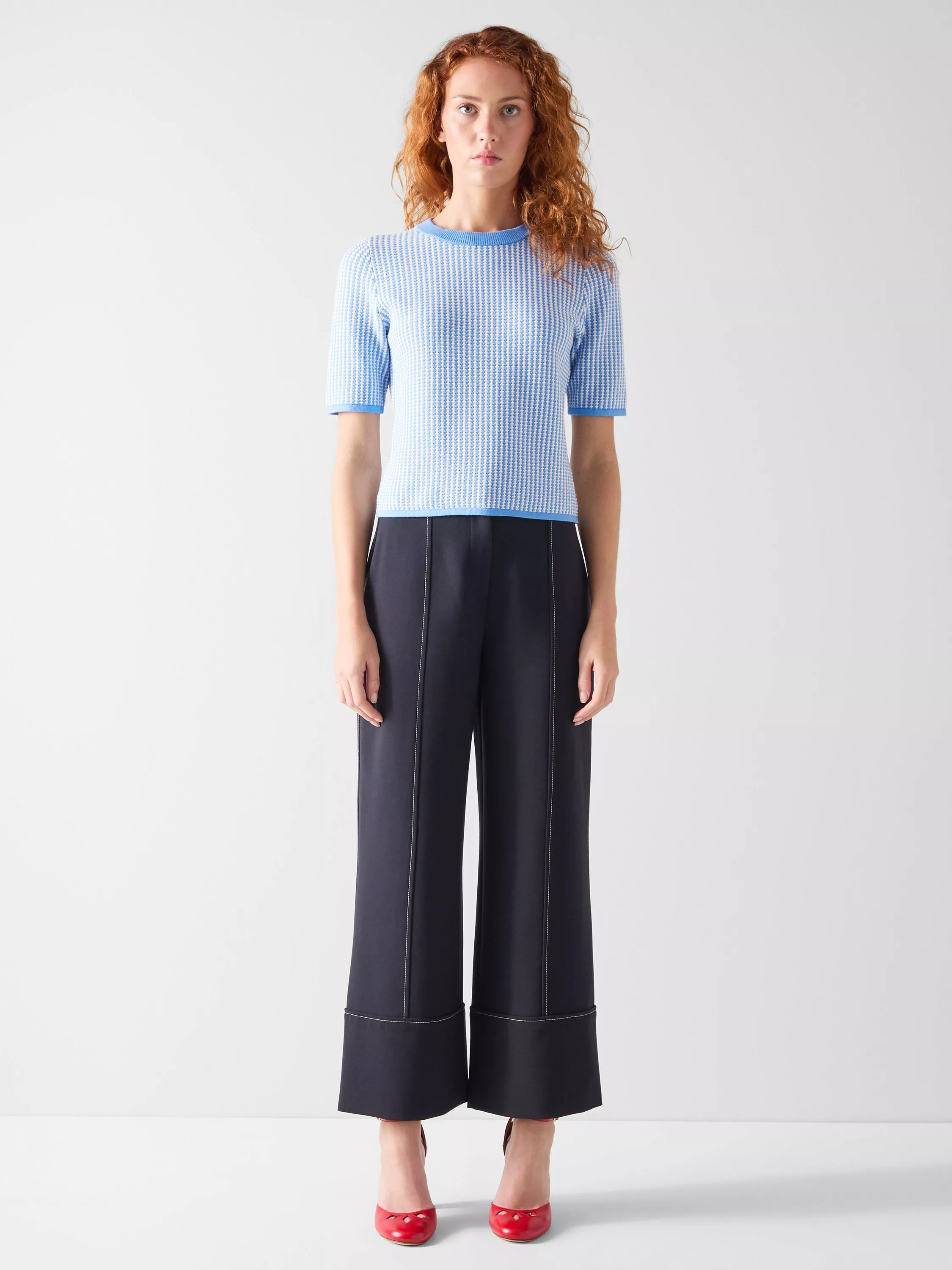 The Vella top features detailed stitching. Made from a cotton mix, this short-sleeve knit offers breathable comfort with texture. The refined crew neckline frames the face, while intricate stitch patterns add visual interest. Perfect for casual brunches or paired under tailored blazers for polished occasions. Style with wide-leg trousers and delicate jewellery for an effortlessly stylish look.