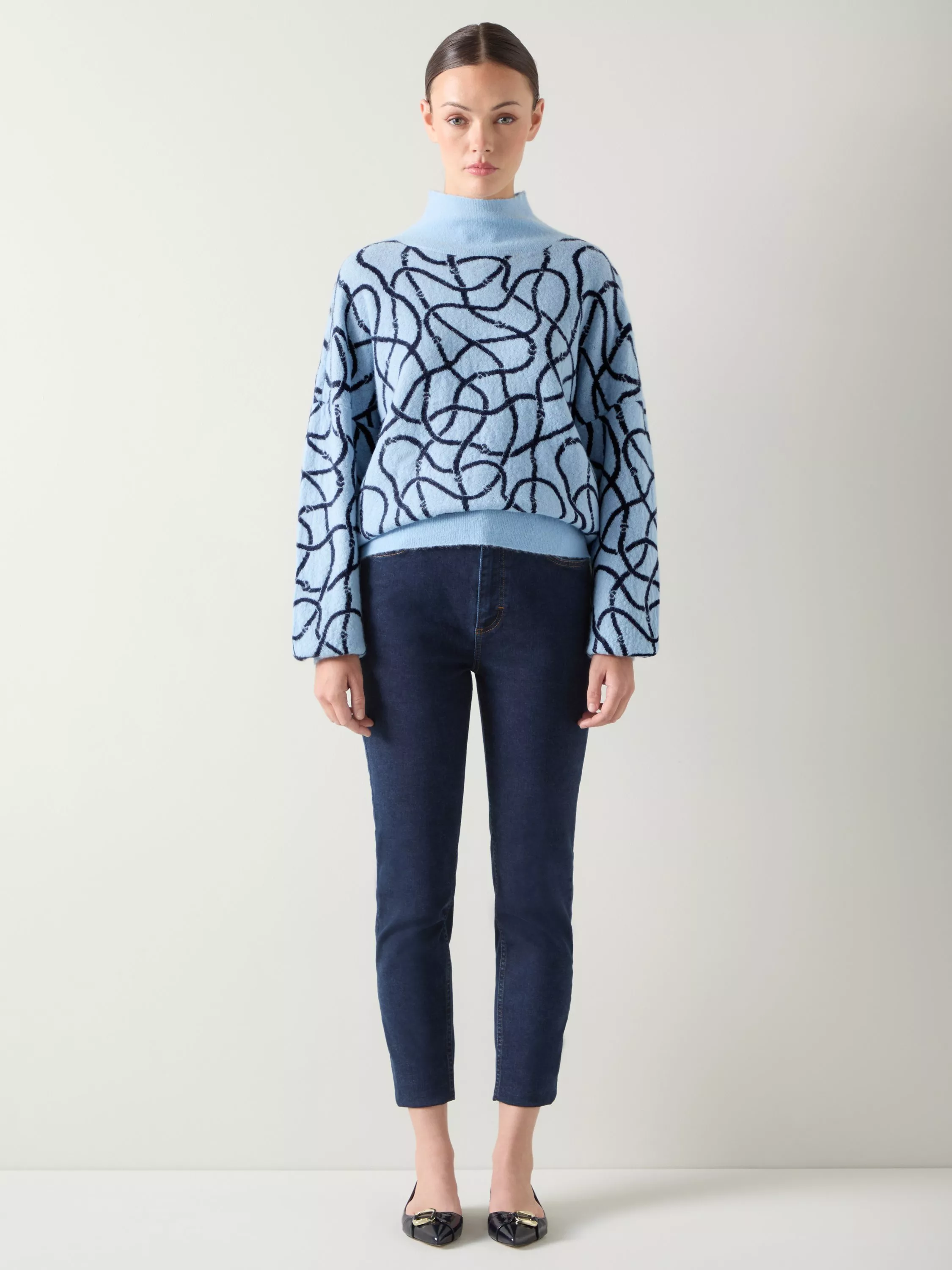 The Willa knit jumper showcases an exclusive in-house rope print in a luxurious wool mix. This warm, long-sleeved pullover features a cosy funnel neck and combines mohair and cashmere for irresistible texture. The conversational jacquard pattern adds distinctive character to this fluffy, cosy winter sweater. Perfect for smart casual occasions and stylish fashion wear—style with tailored trousers for a polished look or pair with denim for elevated weekend wear.