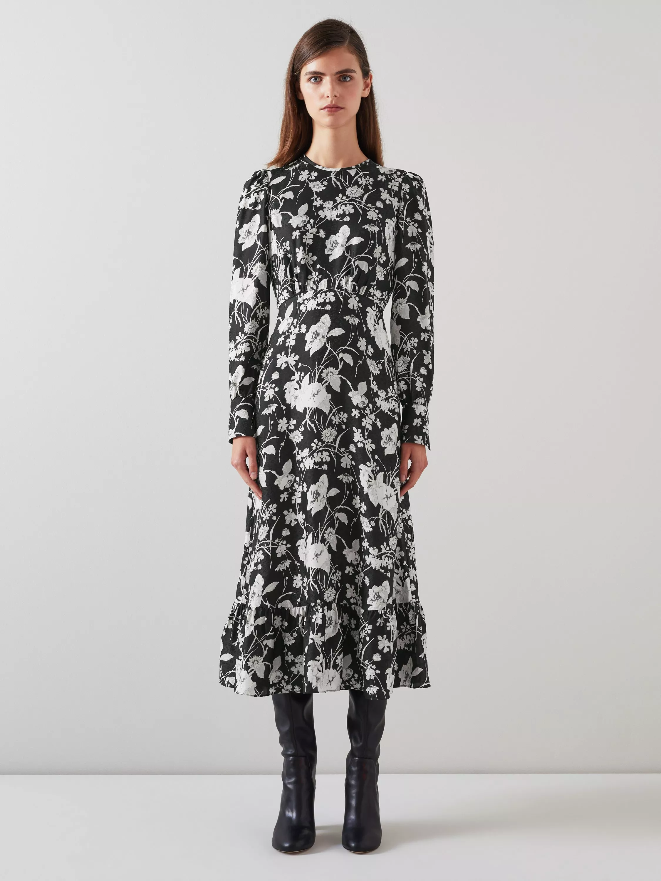 Embrace a night of elegance with the Winona mono meadow print jacquard dress. This silk mix beauty features a sophisticated floral design, complete with back buttons, a zip, and a timeless crew neck. Pair it with your favourite heels or statement jewellery for a truly captivating look.