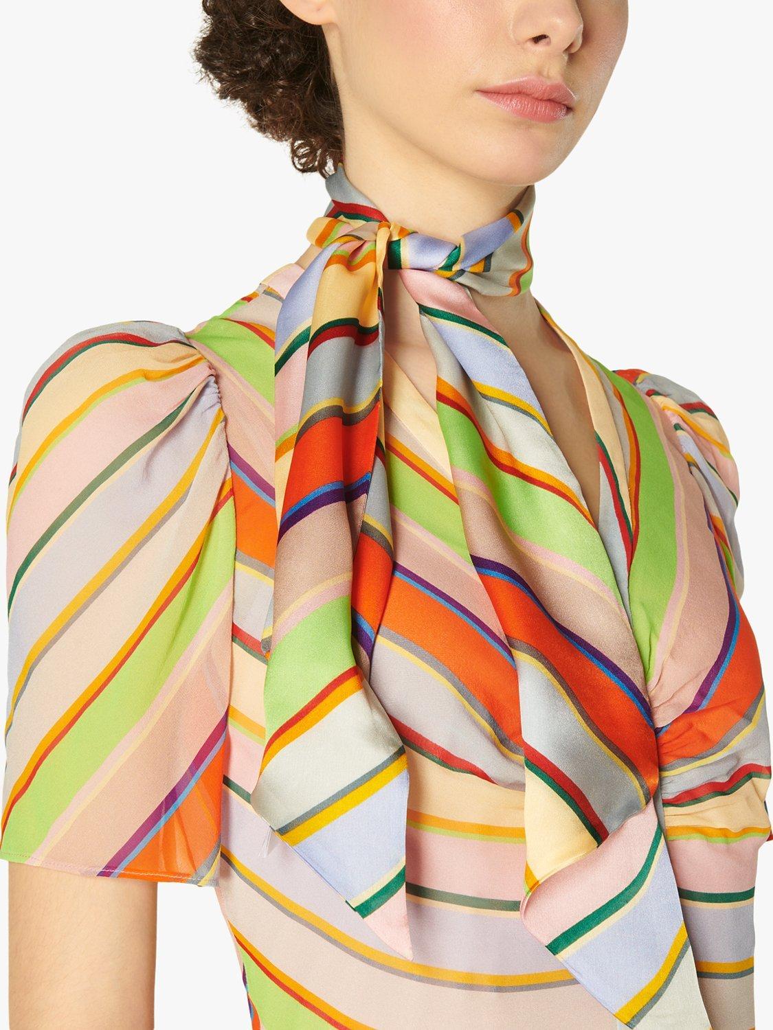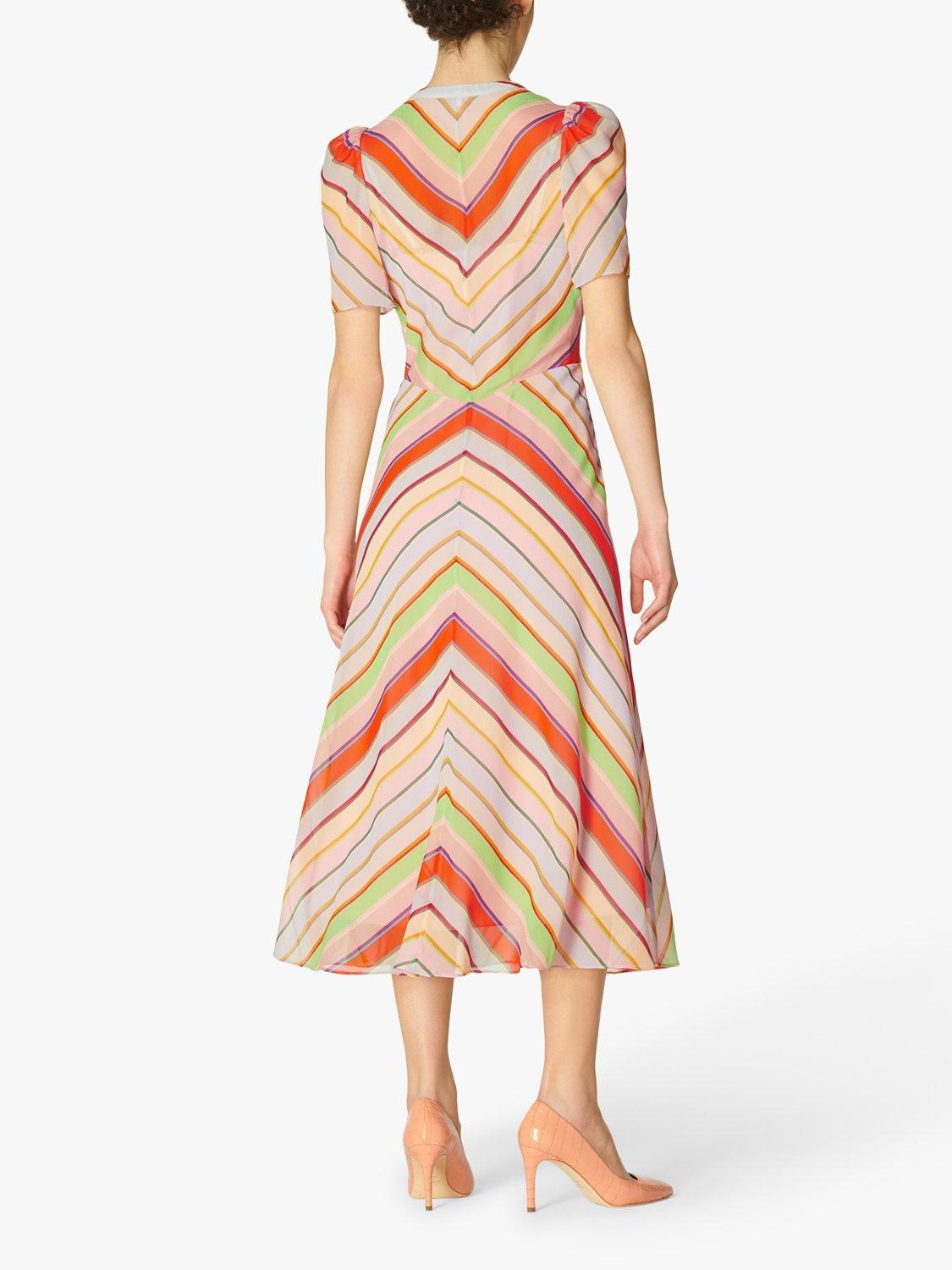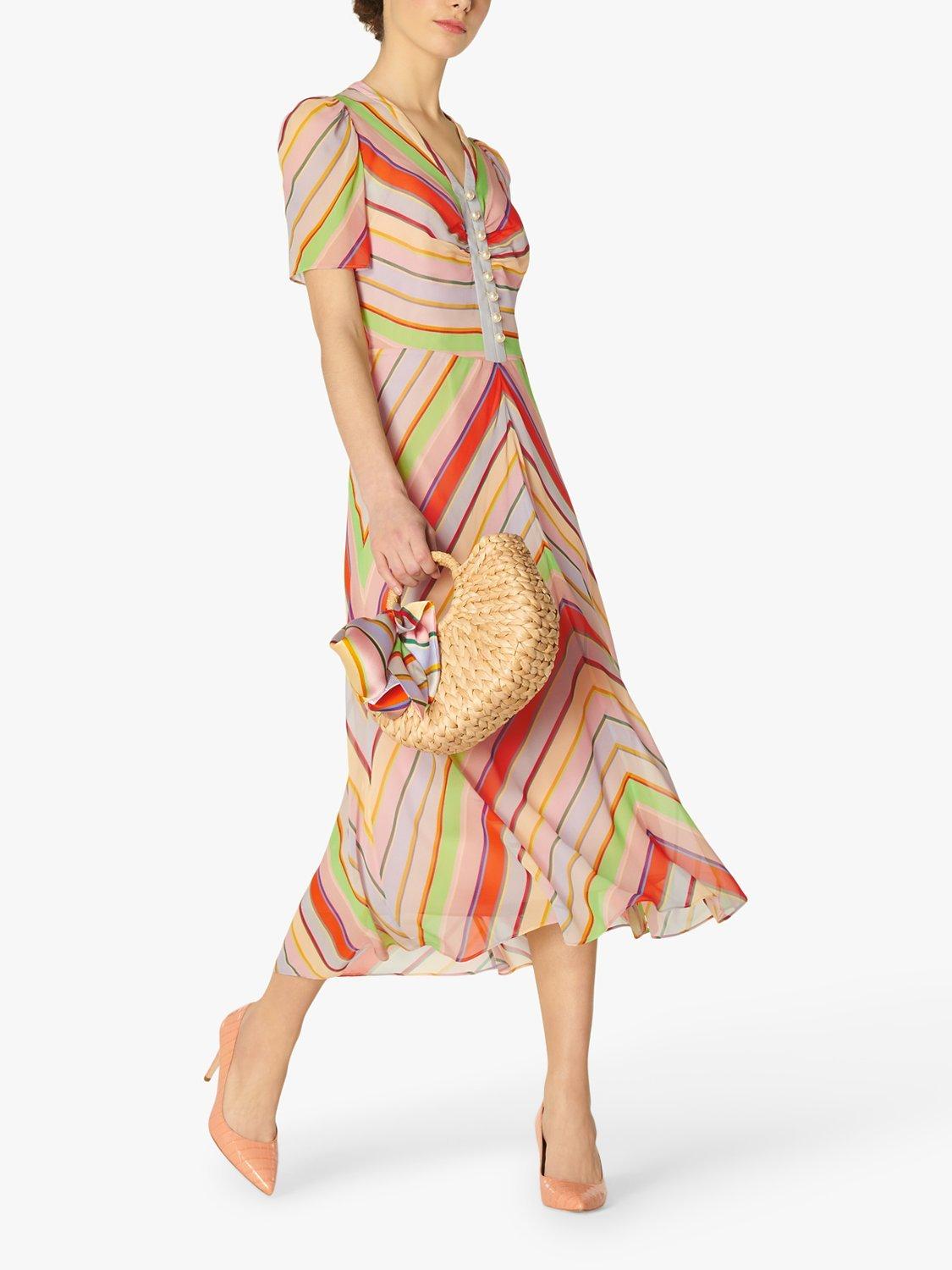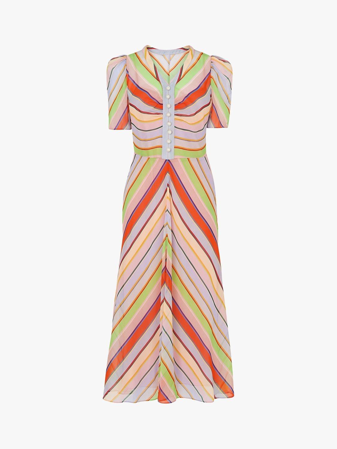 Discover the collection.Featuring vintage-inspired stripes in pastel hues, the Holzer dress will stand out at any event. It's made from pure silk and has a Thirties-inspired shape with subtle pleating at the shoulders, a V-neck, oversized pearl buttons and a long floaty cut. Wear it with strappy sandals for instant elegance.