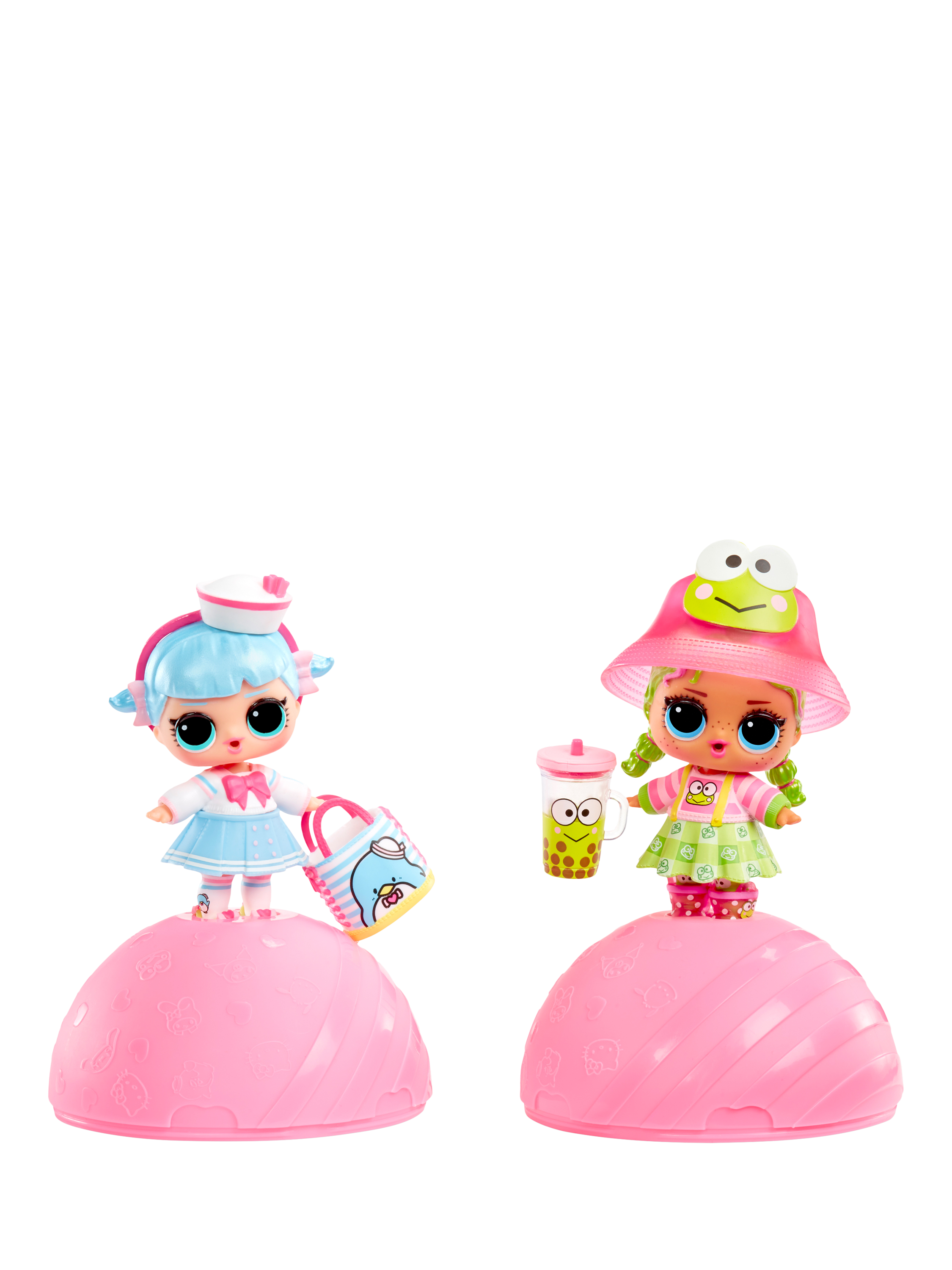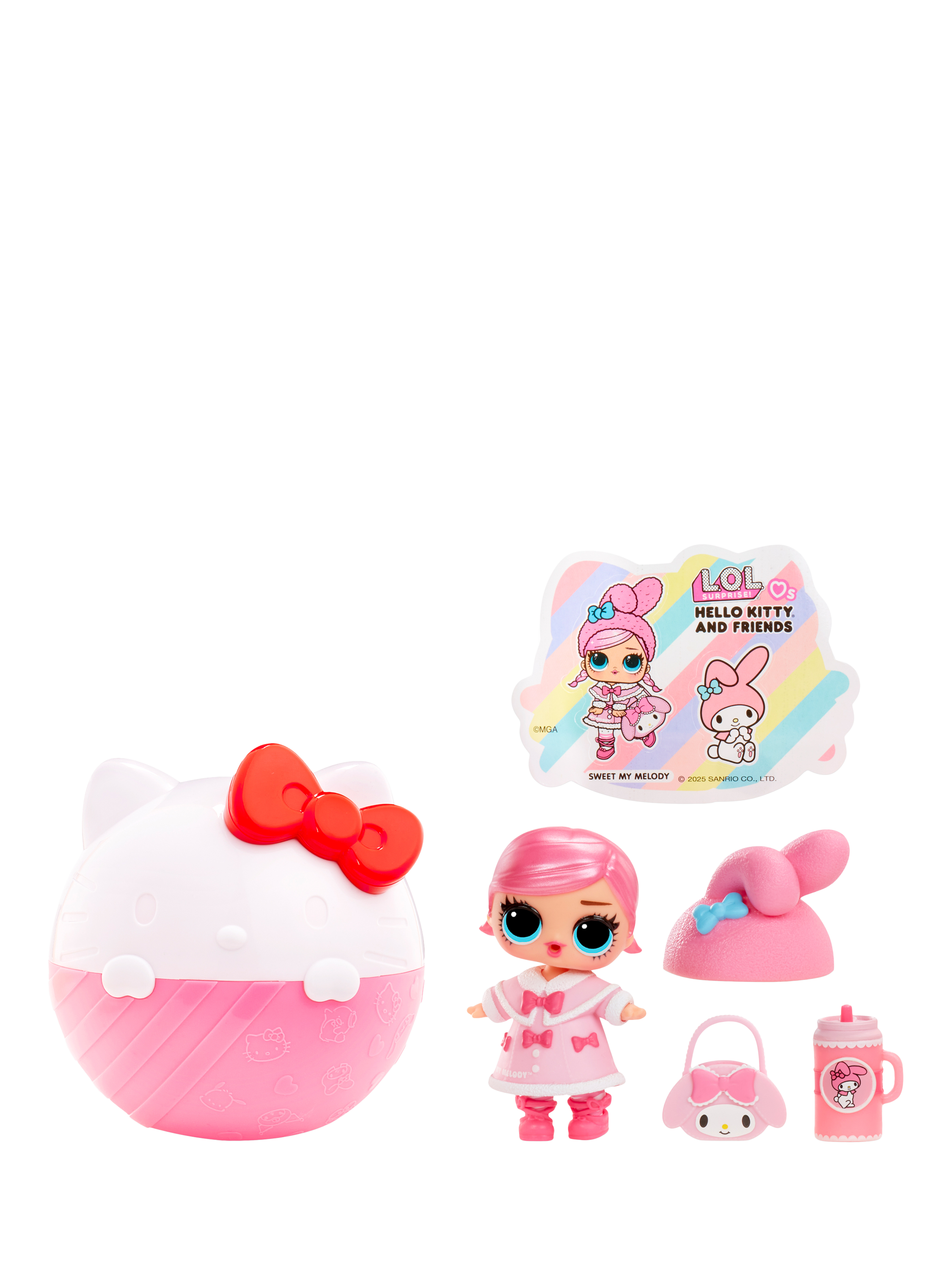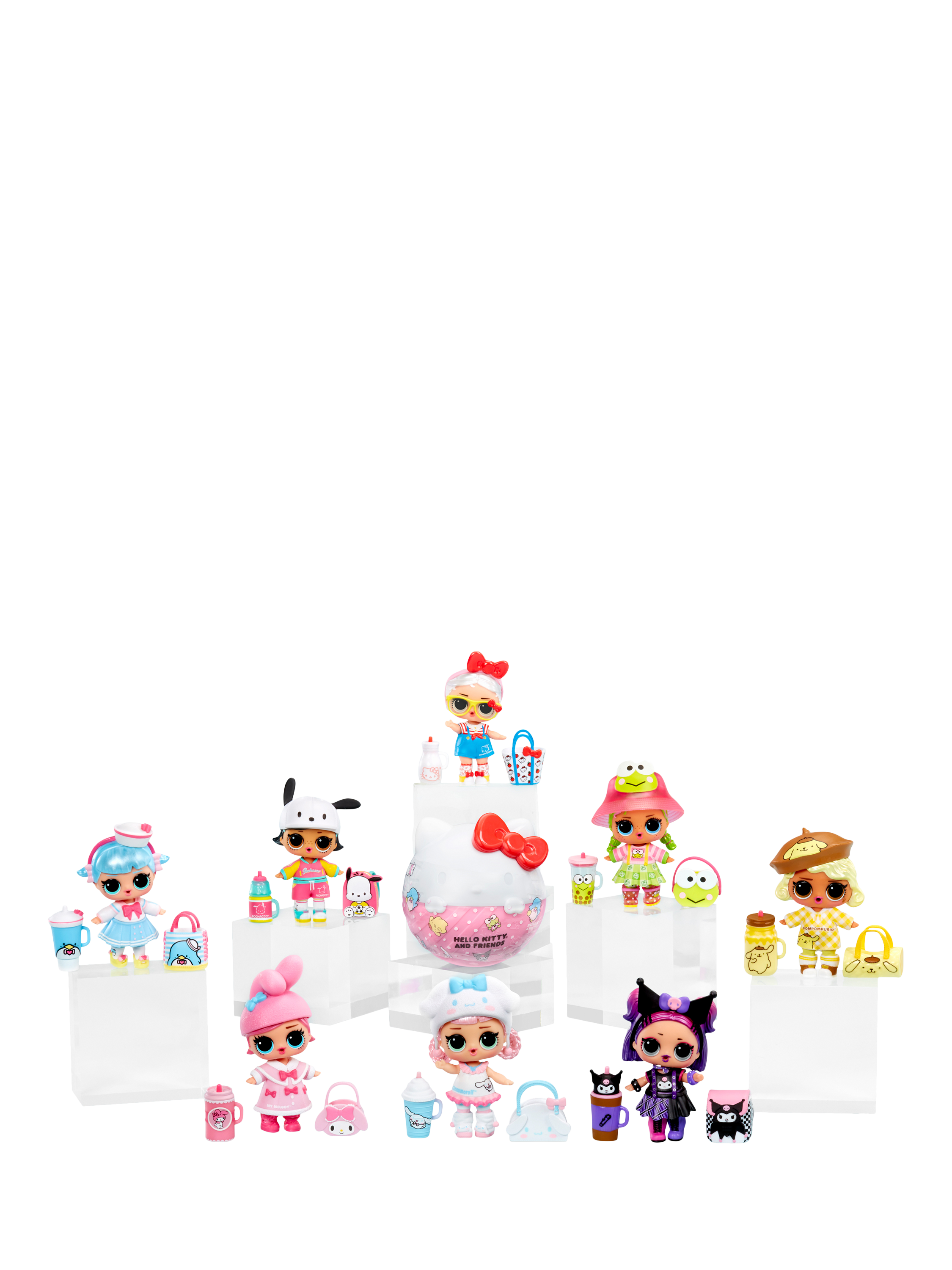 Make new friends with LOL's newest Tots inspired by Hello Kitty® and Friends characters. Each ball includes a collectable doll, outfit, headpiece, bottle, purse, shoes and sticker.