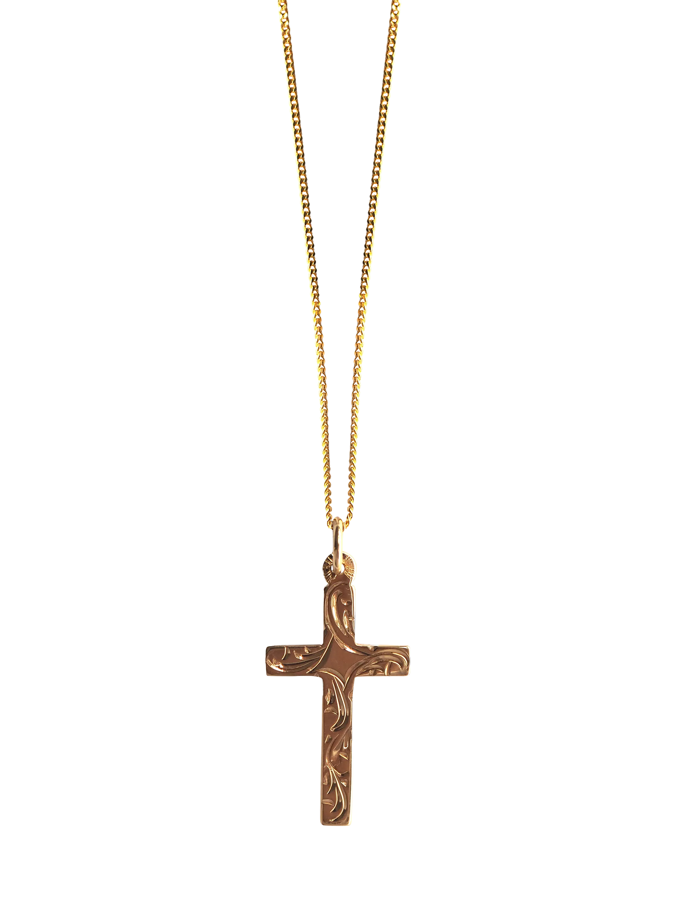 This 9ct yellow gold cross-shaped pendant is engraved with a delicate pattern. The pendant is presented on a diamond cut 9ct gold-plated silver curb chain. From the Assay date stamp, we believe this item dates back to Circa 1993 making it 31 years old.