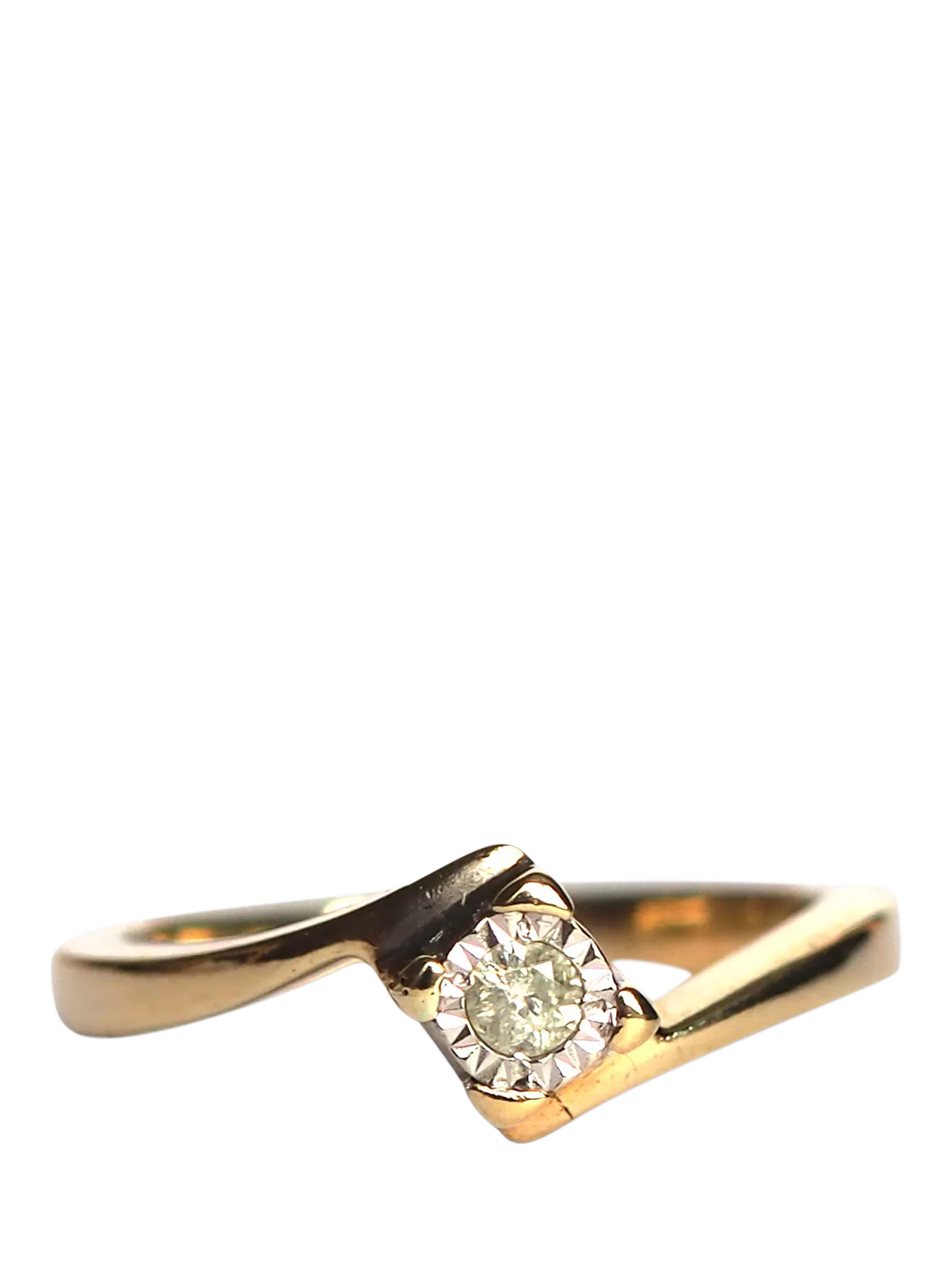 Made from 9ct yellow gold, this ring has a twist design with a solitaire diamond as its centrepiece.