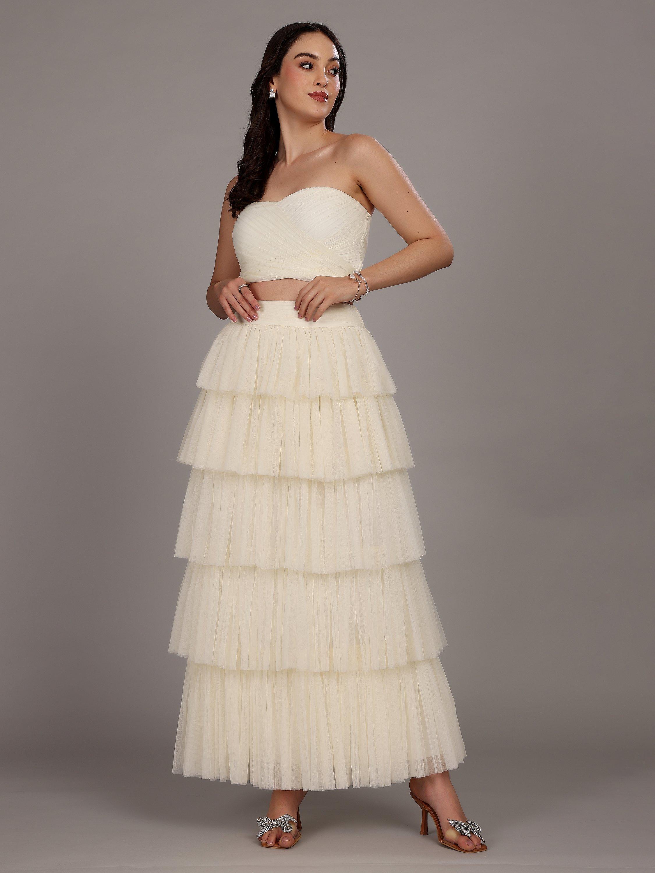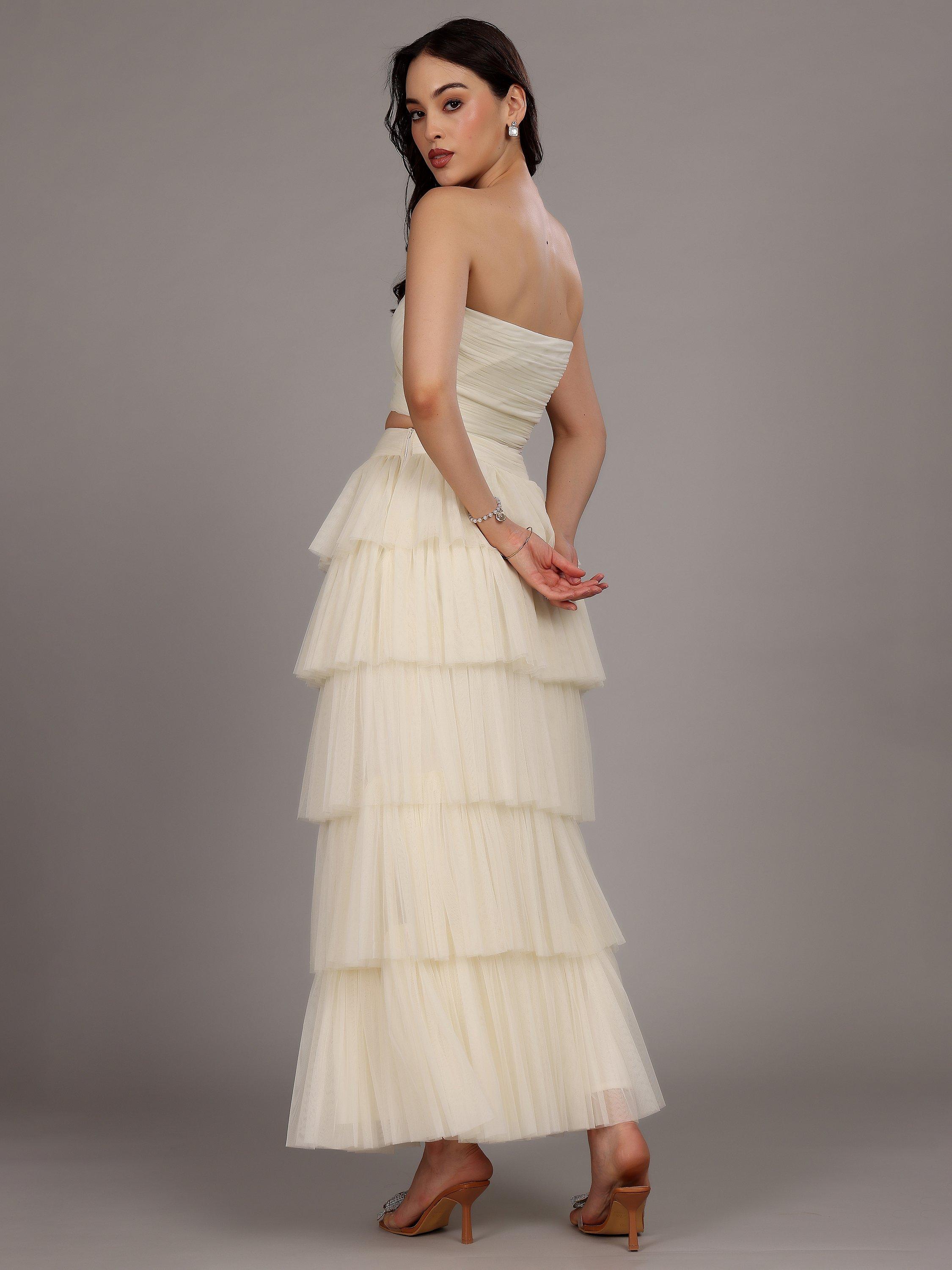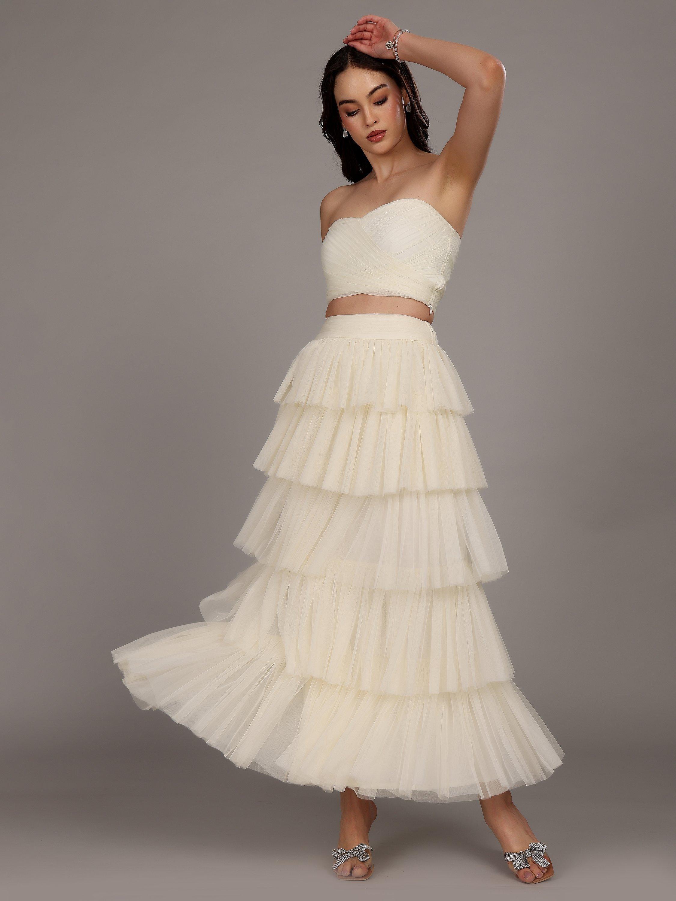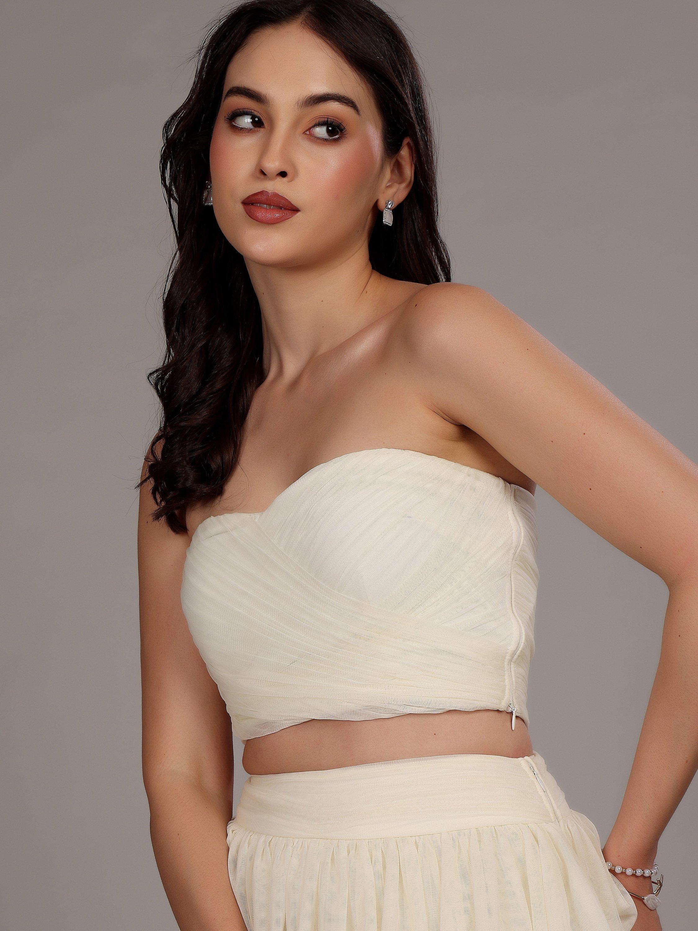 The strapless Haifa top from Lace & Beads is crafted from layered, textured tulle, and designed in a cropped style with a zip-side fastening.