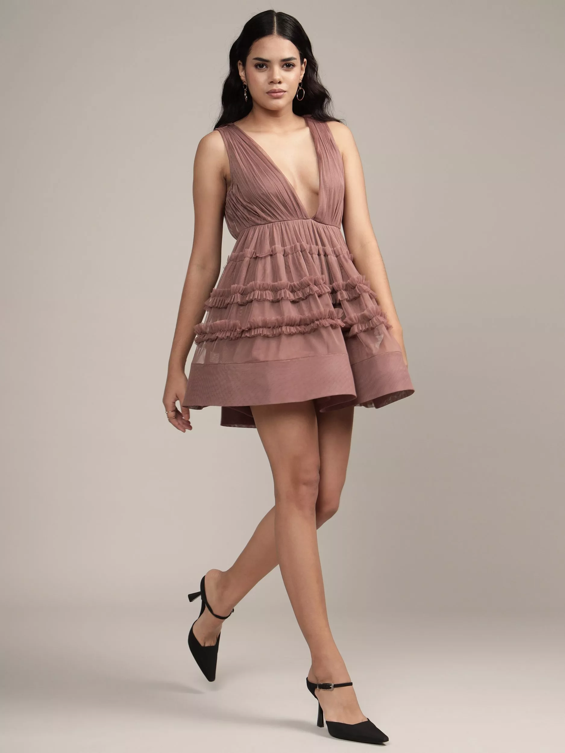 Flattering in all the right places, this thigh-grazing dress from Lace & Beads is made from soft tulle with a deep plunge v-neckline and plenty of ruffles through the skirt.