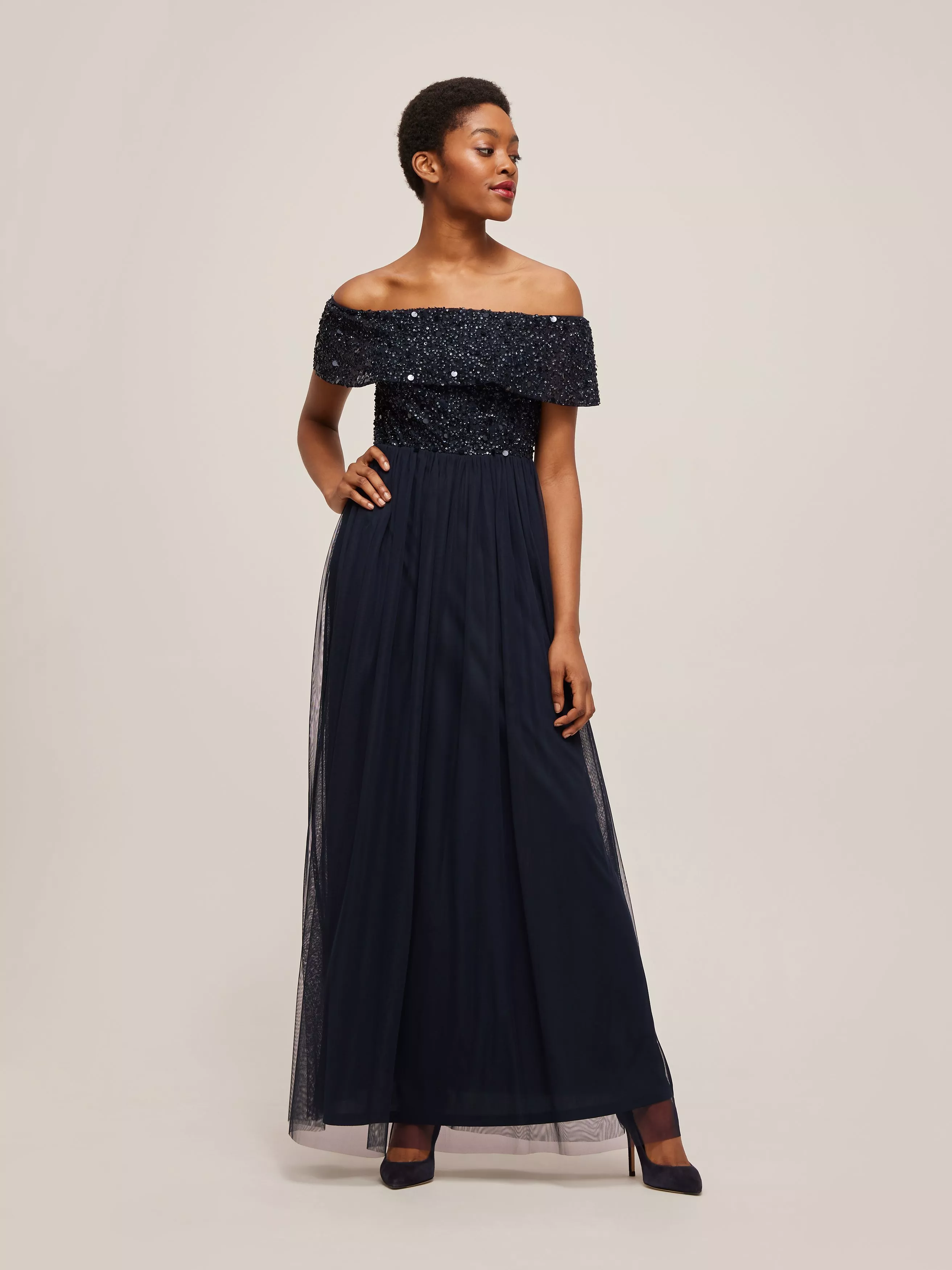 Timelessly classy with its bardot silhouette and lightly flared hem, this maxi dress by Lace & Beads makes an impact with embellished detail.