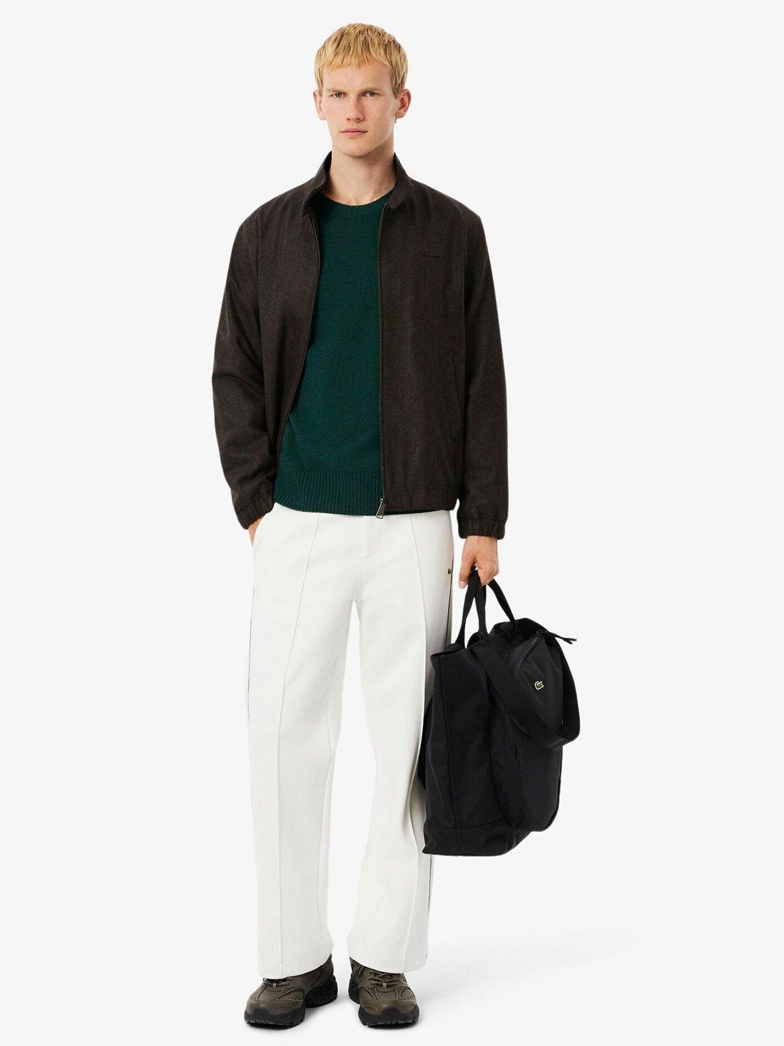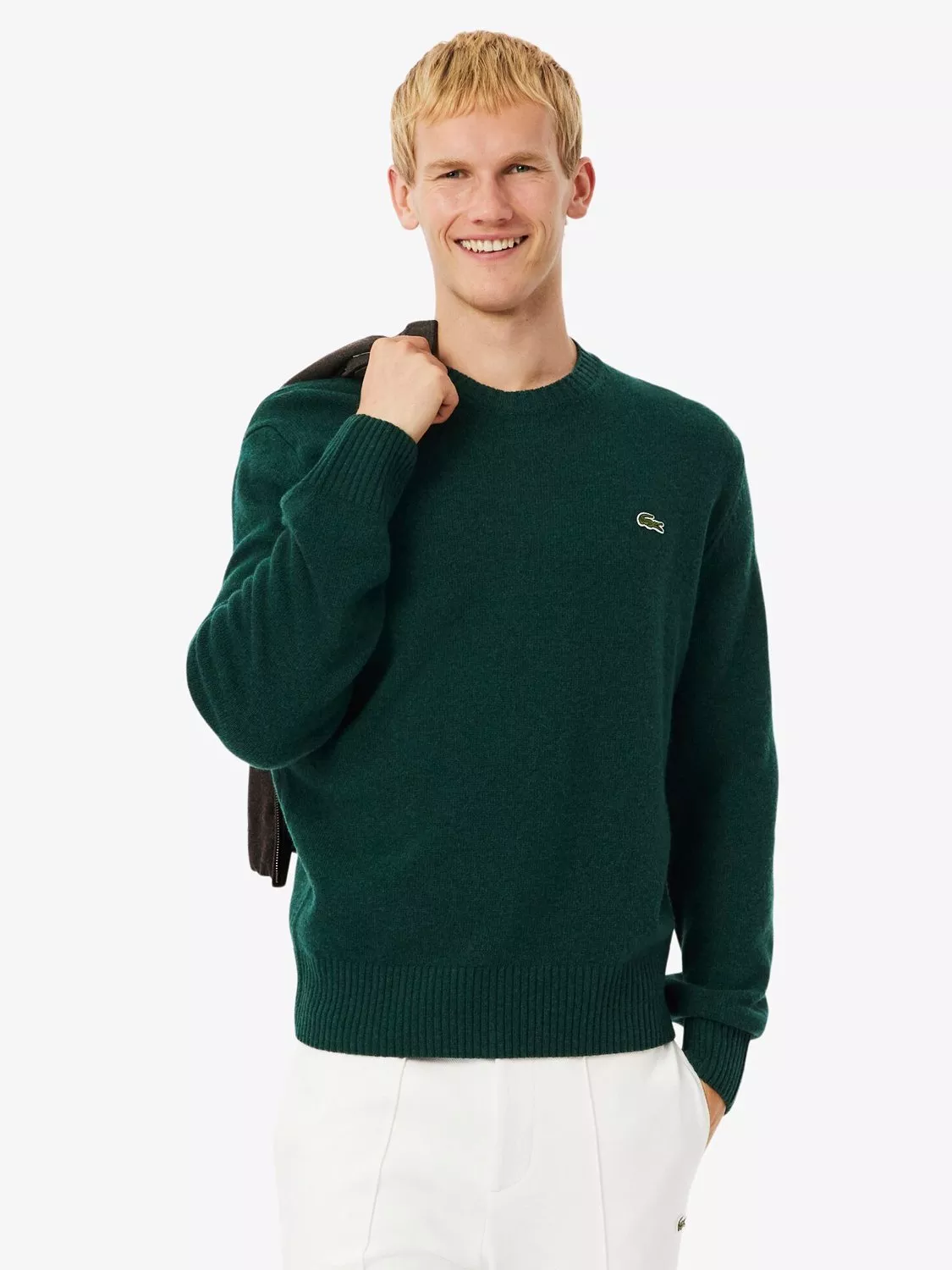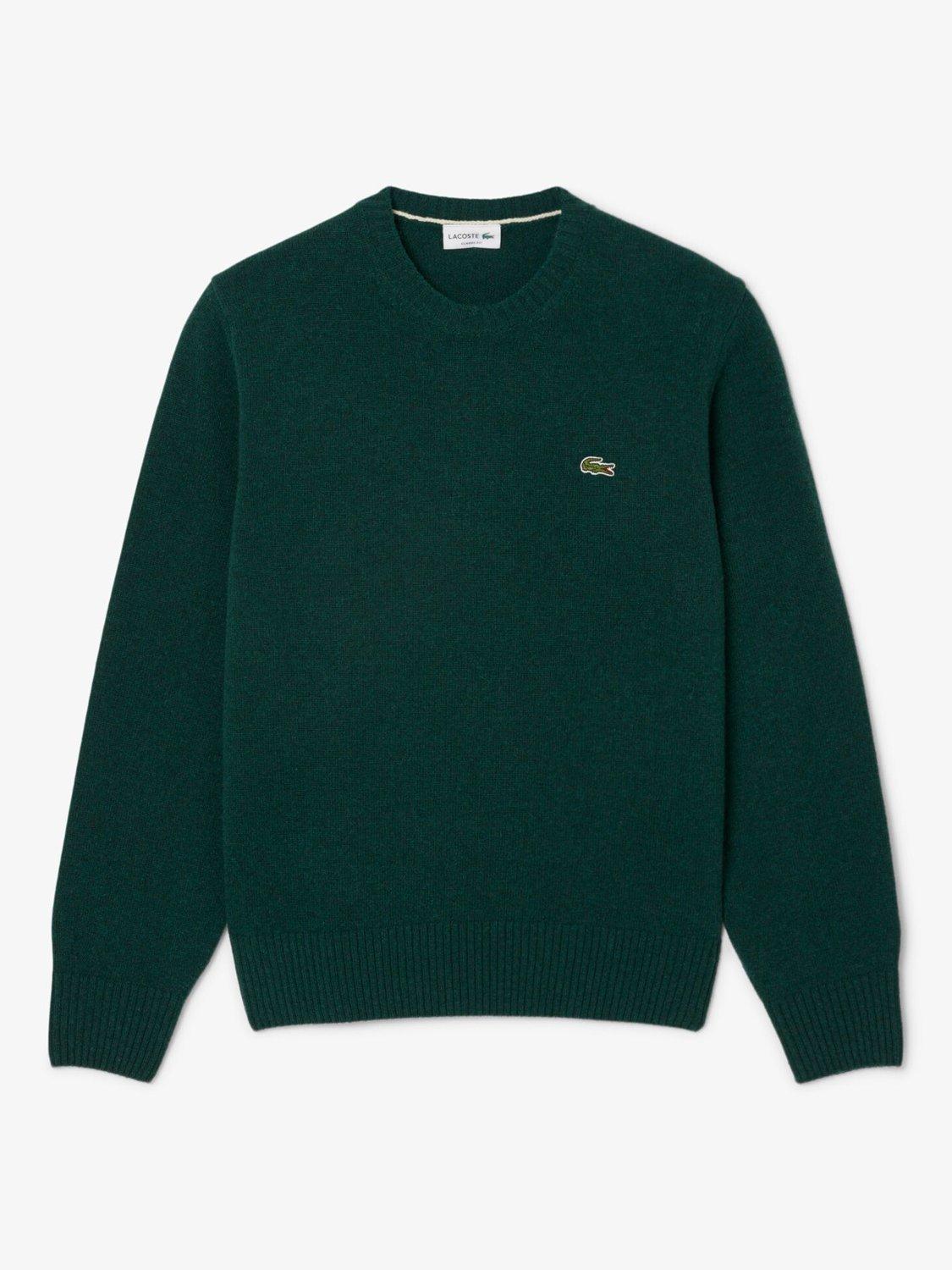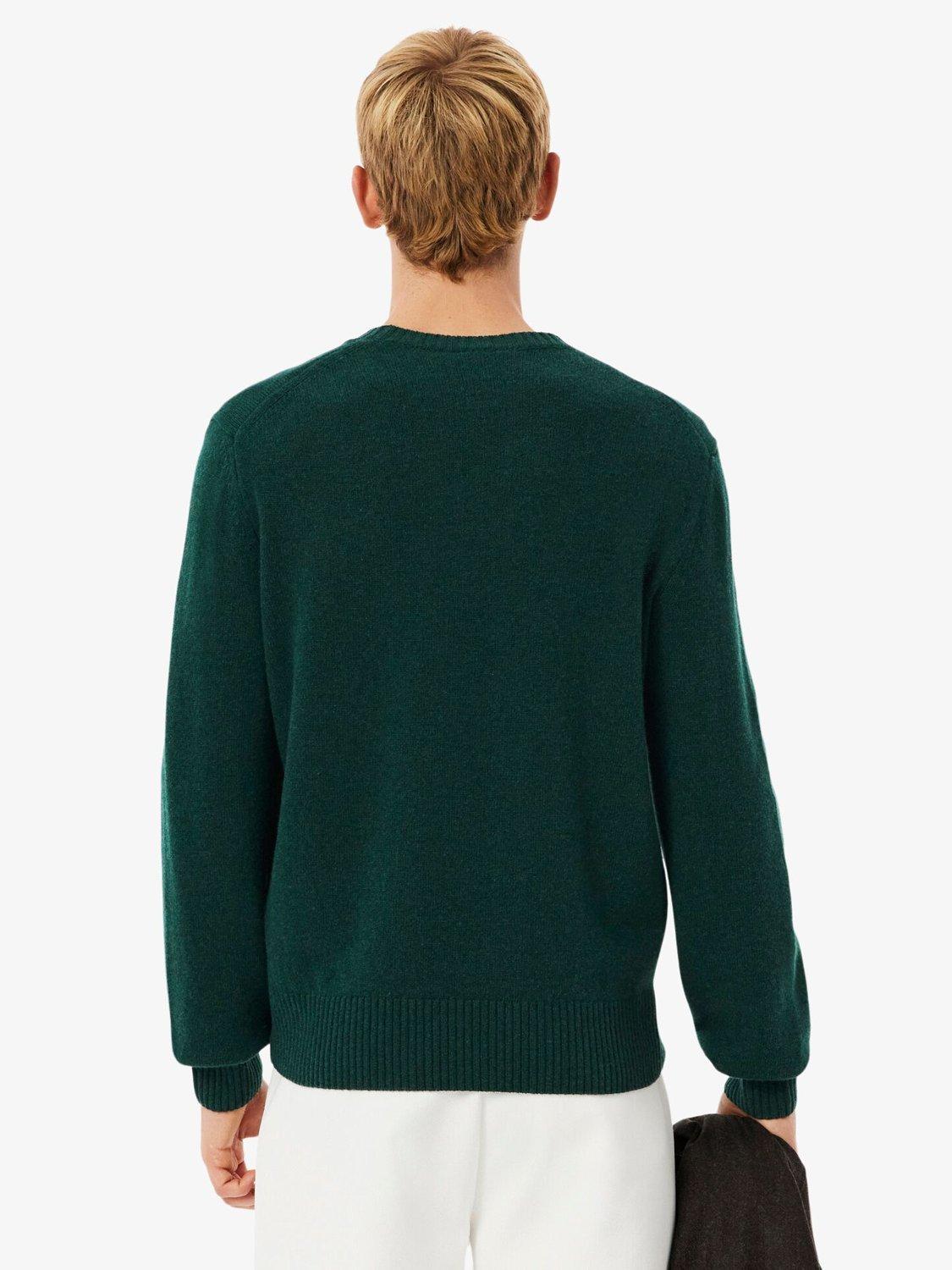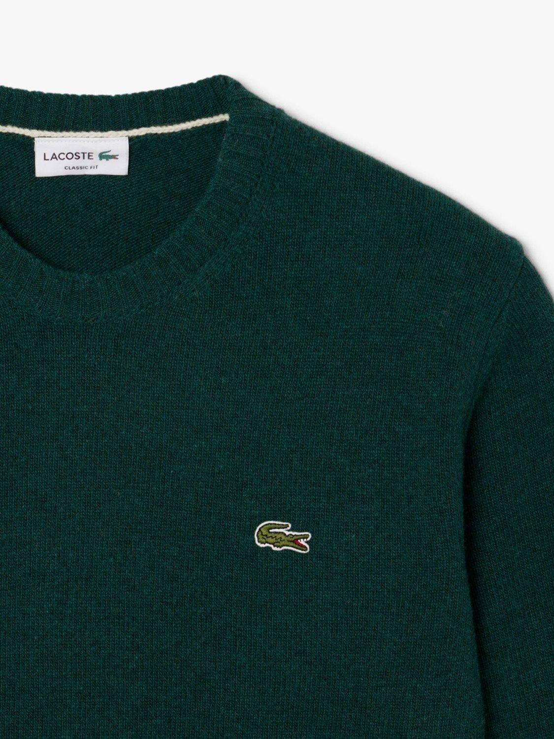 Made in a classic fit for a natural ease on the body with comfortable sleeves and French shoulders. The silhouette is structured with tighter, longer ribs at the cuff and waistband, while the single rib collar gives a modern and sportswear touch. Knitted in a carded wool yarn in a tight jersey in gage 7, for a dense, material and warm feeling. The signature green crocodile on the chest adds an iconic finishing touch.