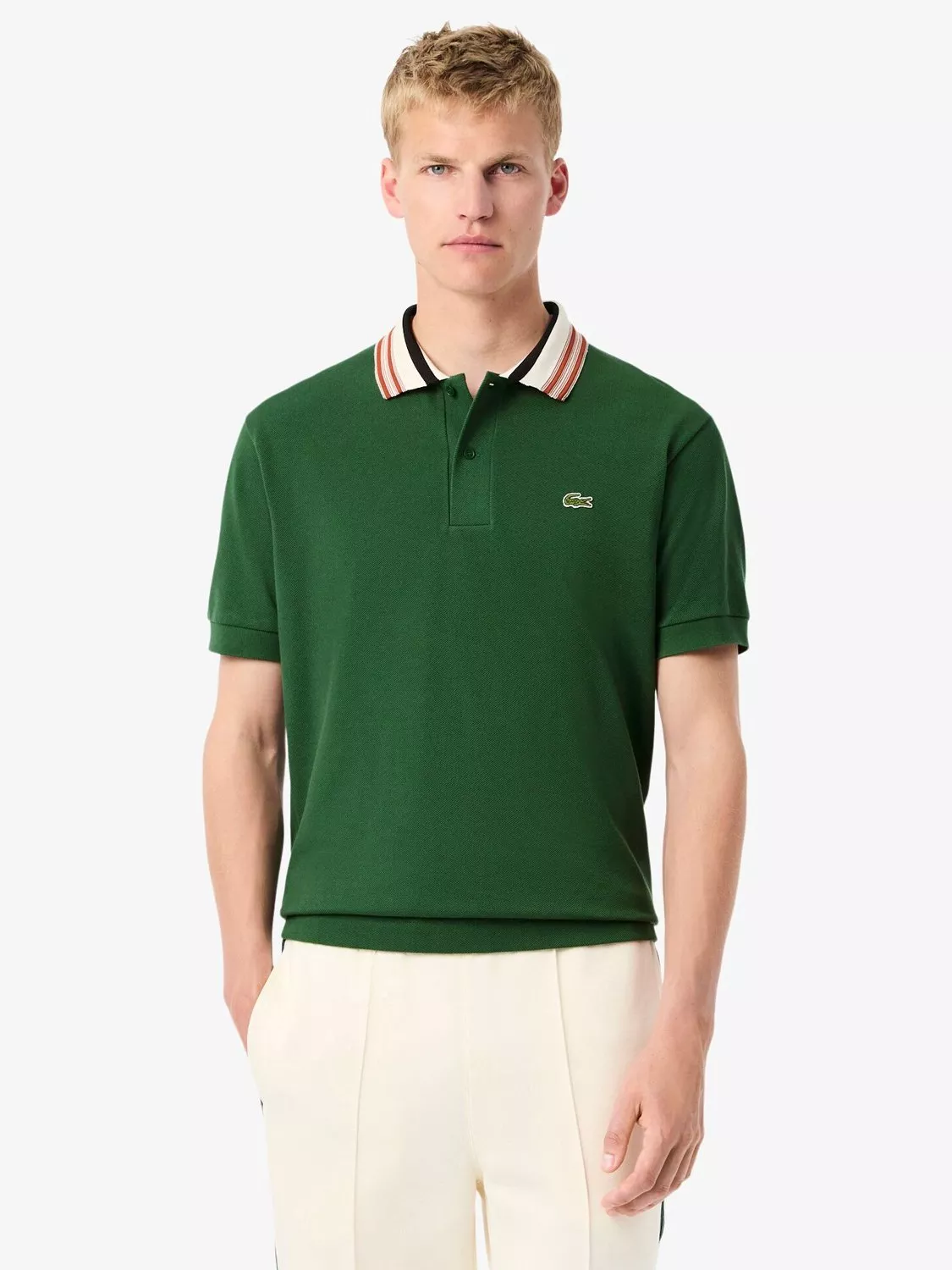 Rooted in its French heritage, this polo shirt is a modern take on a classic. It’s made in France, a true showcase of authentic French craftsmanship and Lacoste know-how. The shirt has a classic fit for comfort, with slightly dropped shoulders and short sleeves. It's crafted from the heavy piqué knit cotton and features a ribbed collar with a unique multicoloured pattern. Finishing details include a herringbone neck tape in the signature green, rubber-touch tone-on-tone buttons, a 'Made in France' badge at the front, and the iconic green crocodile embroidered on the chest.