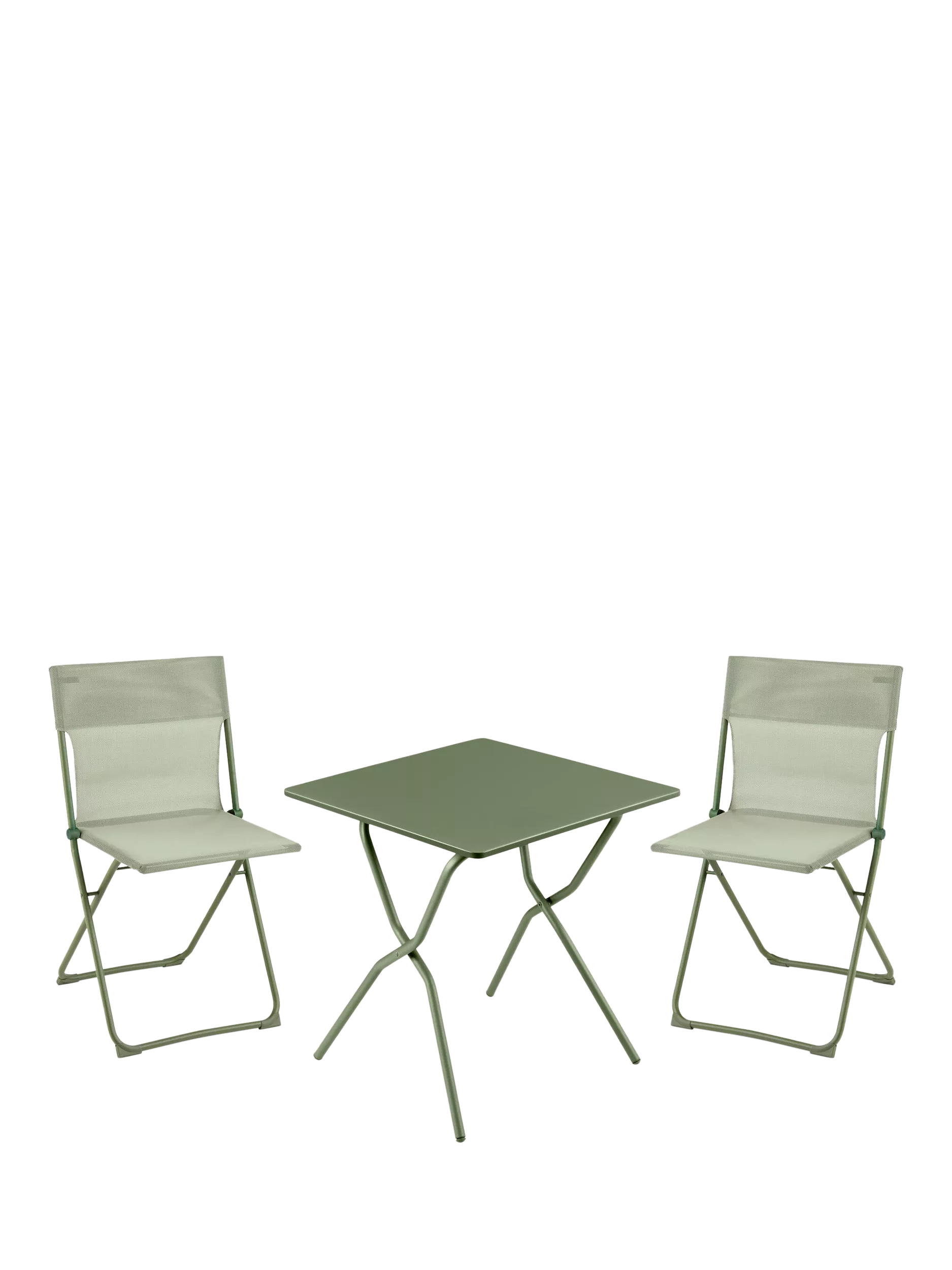 The square table can stand on its own when folded and has adjustable feet for uneven floors. The two chairs combine comfort and style. Comfortable and lightweight, these chairs unfold and fold easily. Although compact, they are very robust with a steel frame and a tough canvas fabric seat and backrest.