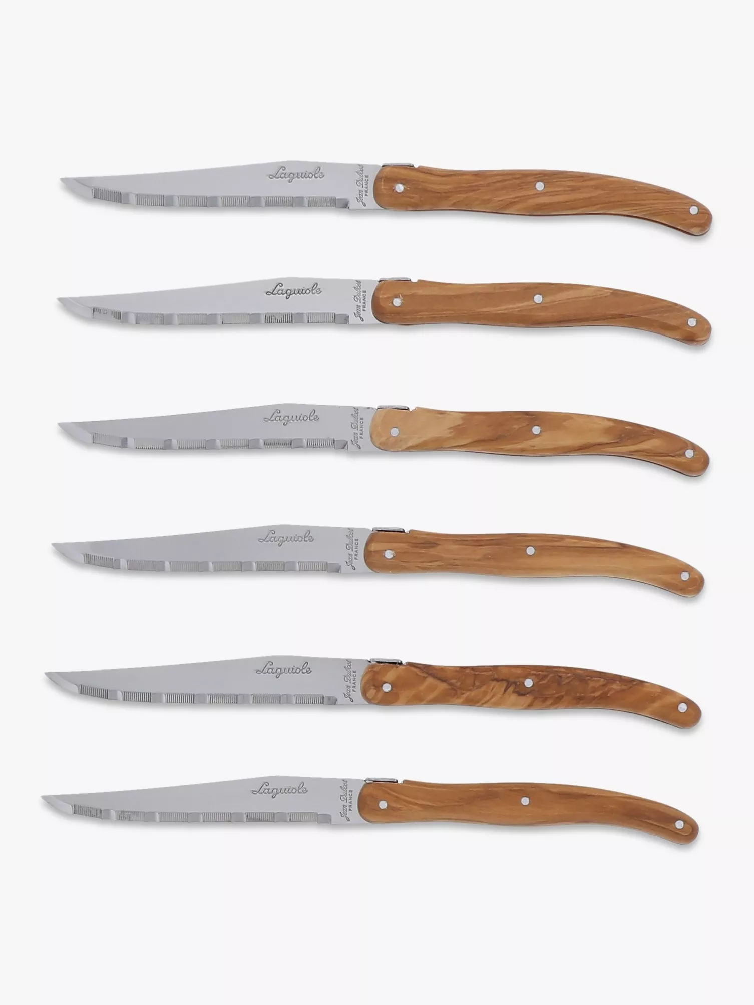 Six serrated steak knives from Laguile, made of durable stainless steel with beautiful olive wood handles. The knives are held securely in a wooden knife block.