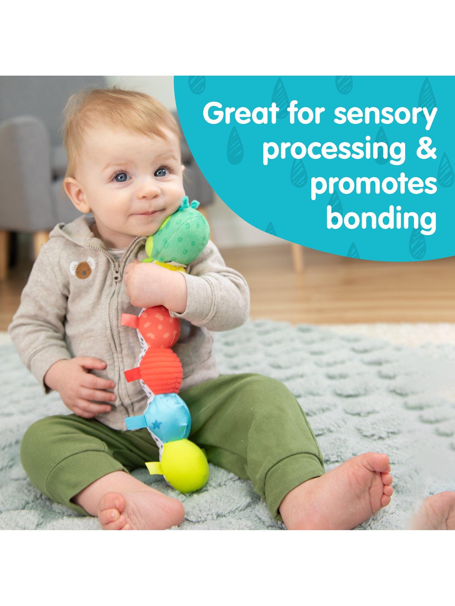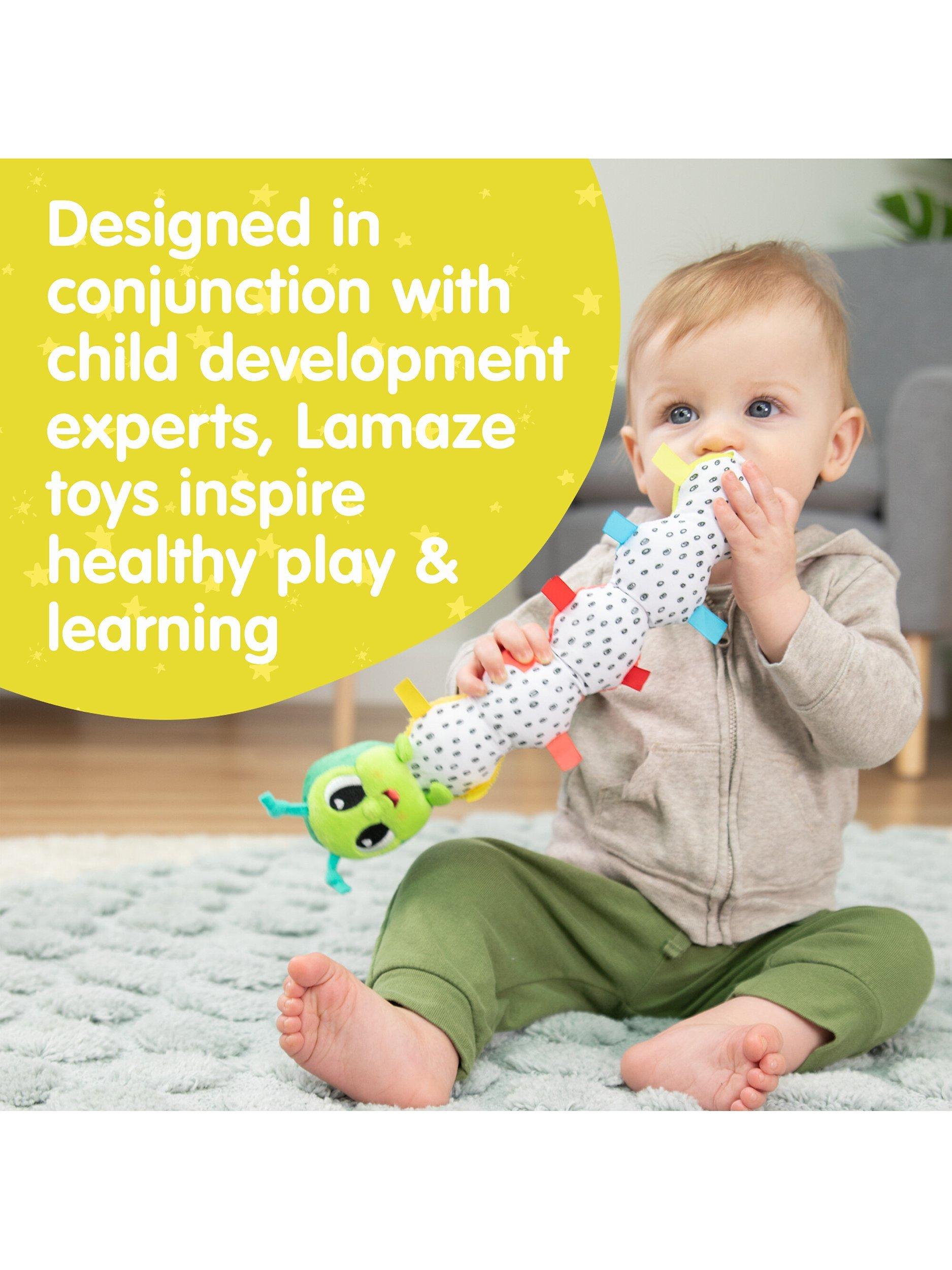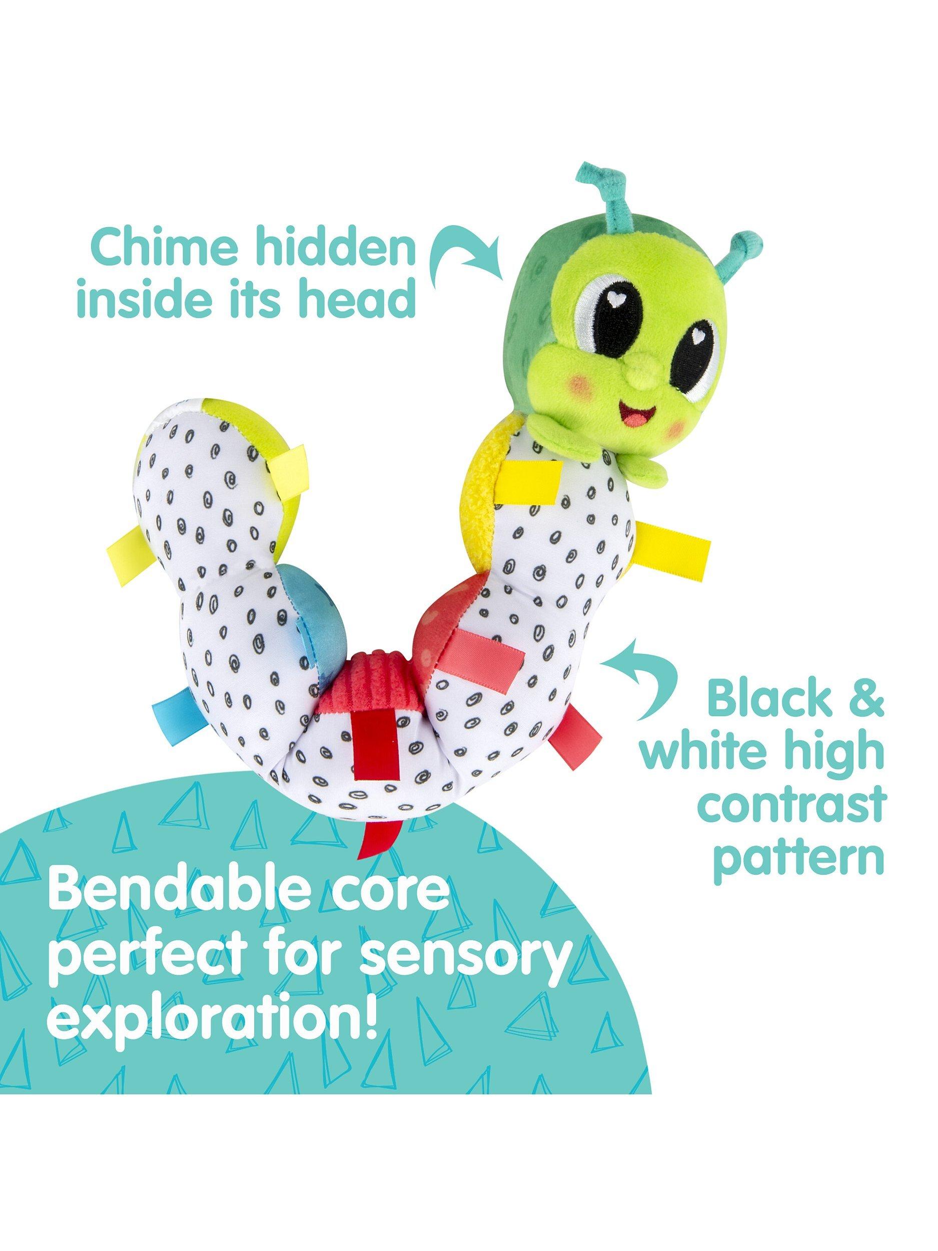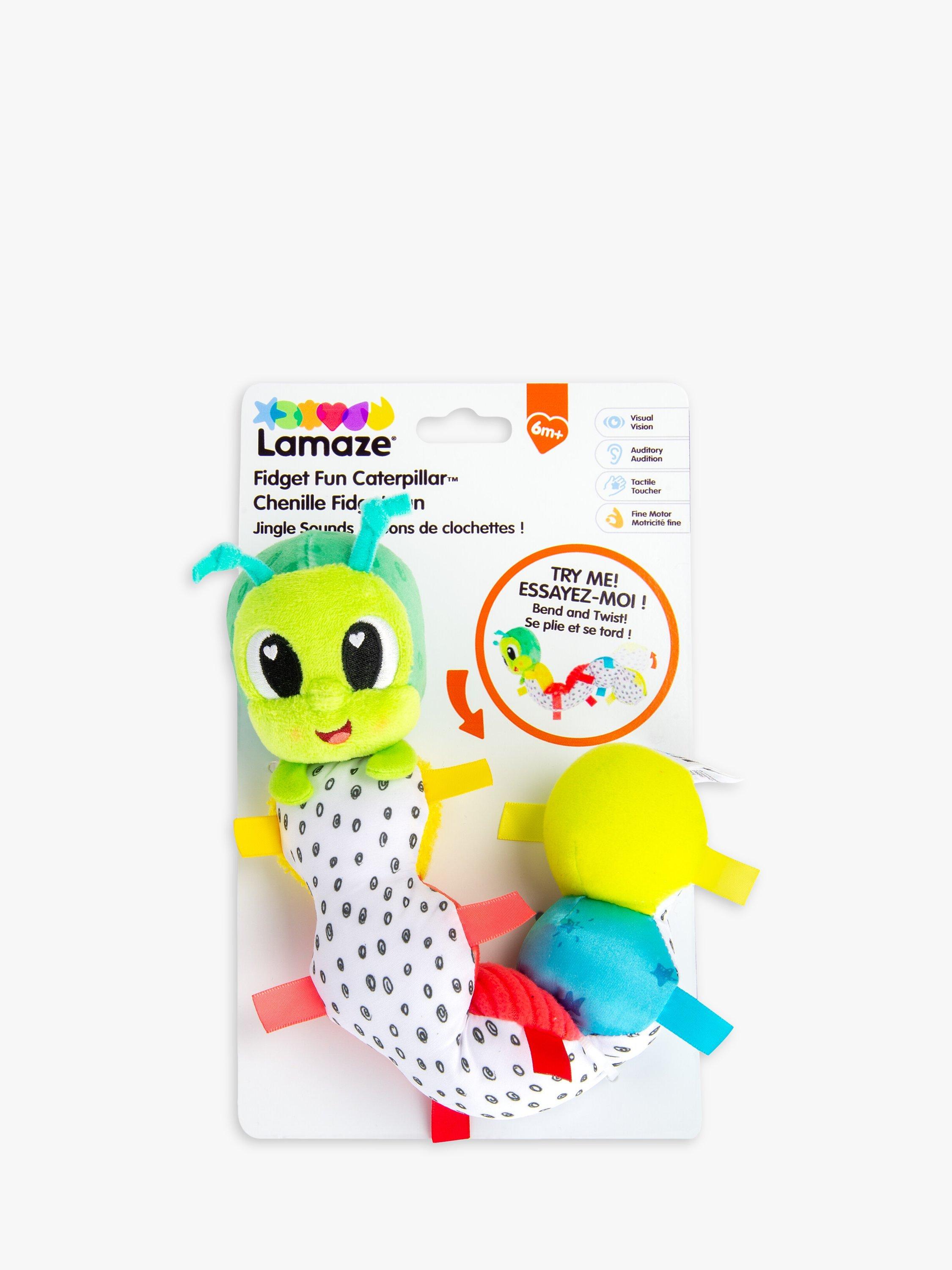 This bendy buddy will fill their fingers with wonder! On its belly is a unique, black-and-white high-contrast pattern. On its back are brightly coloured, textured fabrics. But the real fun is hidden inside... A bendable core that little ones will love to twist this way and that, plus a chime in its head that will delight their ears. Engage the senses and elasticize the mind with the Lamaze Fidget Caterpillar.