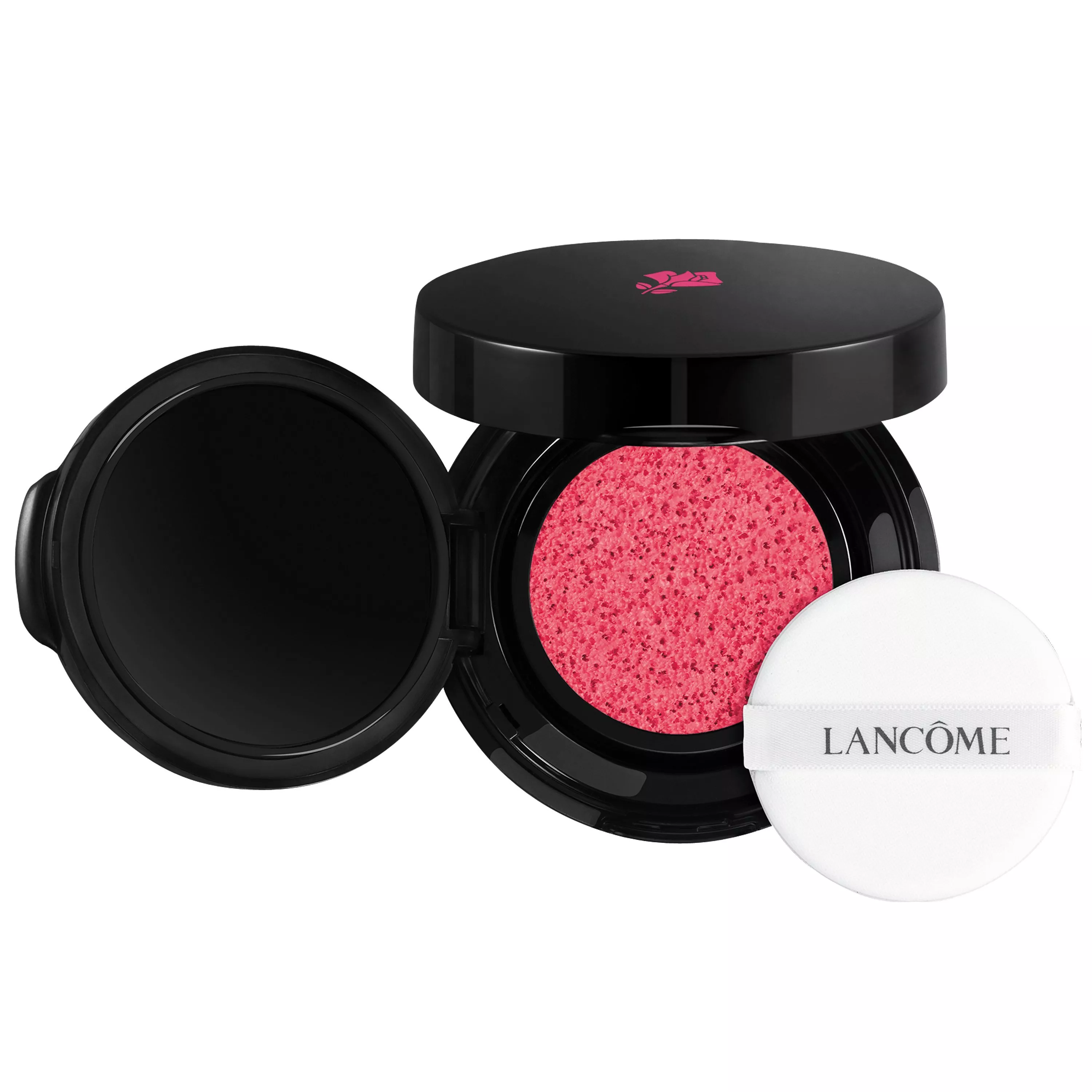 Vibrancy and freshness of a liquid blush in a portable cushion.