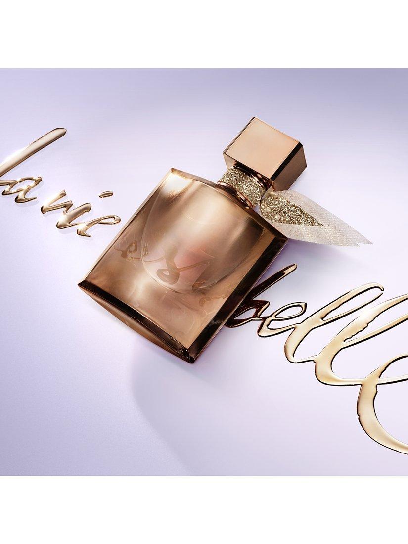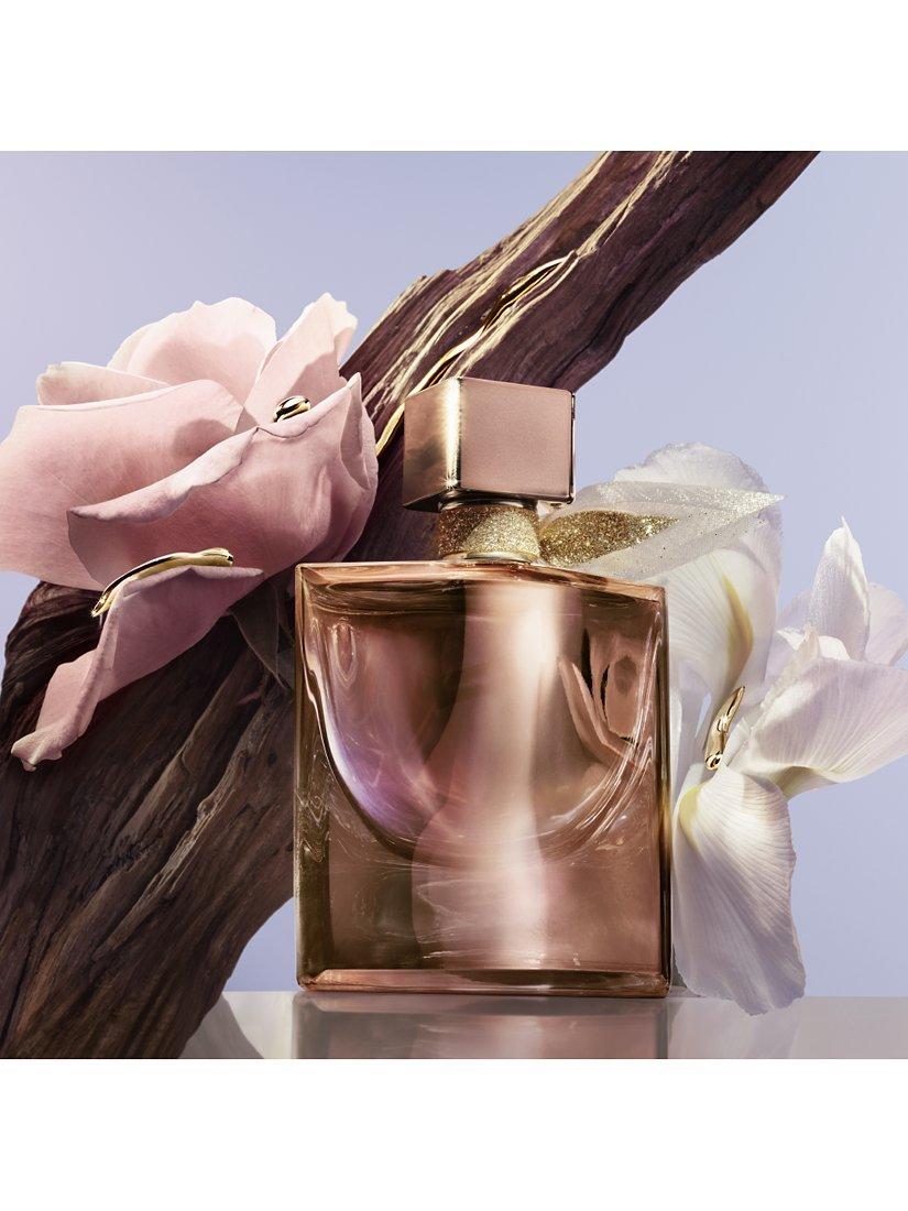 La vie est belle L'Extrait, an Extrait de Parfum composed of a voluptuous floral heart (Damascena Rose Petal, Iris Pallida Butter, Jasmine Notes, Orange Blossom Notes) heightened by an Oud Wood accord that brings signature, strength and olfactory richness.