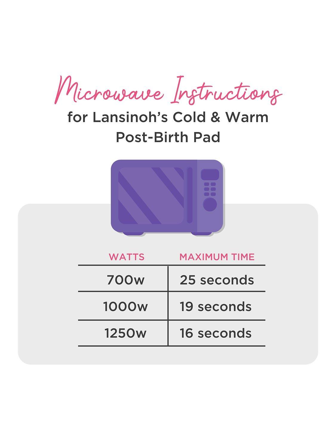 - For Heat Therapy: Microwave for 25s (700W)/ 19s (1000W)/ 16s (1250W). Gently massage pad to evenly distrubute heat as indicated by colour-changing pearls and test pack prior to use. Add time in 5 second increments until desired temperature is reached. Alternatively, submerge in a water bath that is no longer boiling for 1-2 minutes. Gently massage the warm pad to evenly distribute heat as indicated by the colour-changing pearls. Always test your warm pad’s temperature prior to use. Place the pad into a disposable sleeve and apply to the abdomen for 20 minutes for soothing relief postnatal uterine cramping