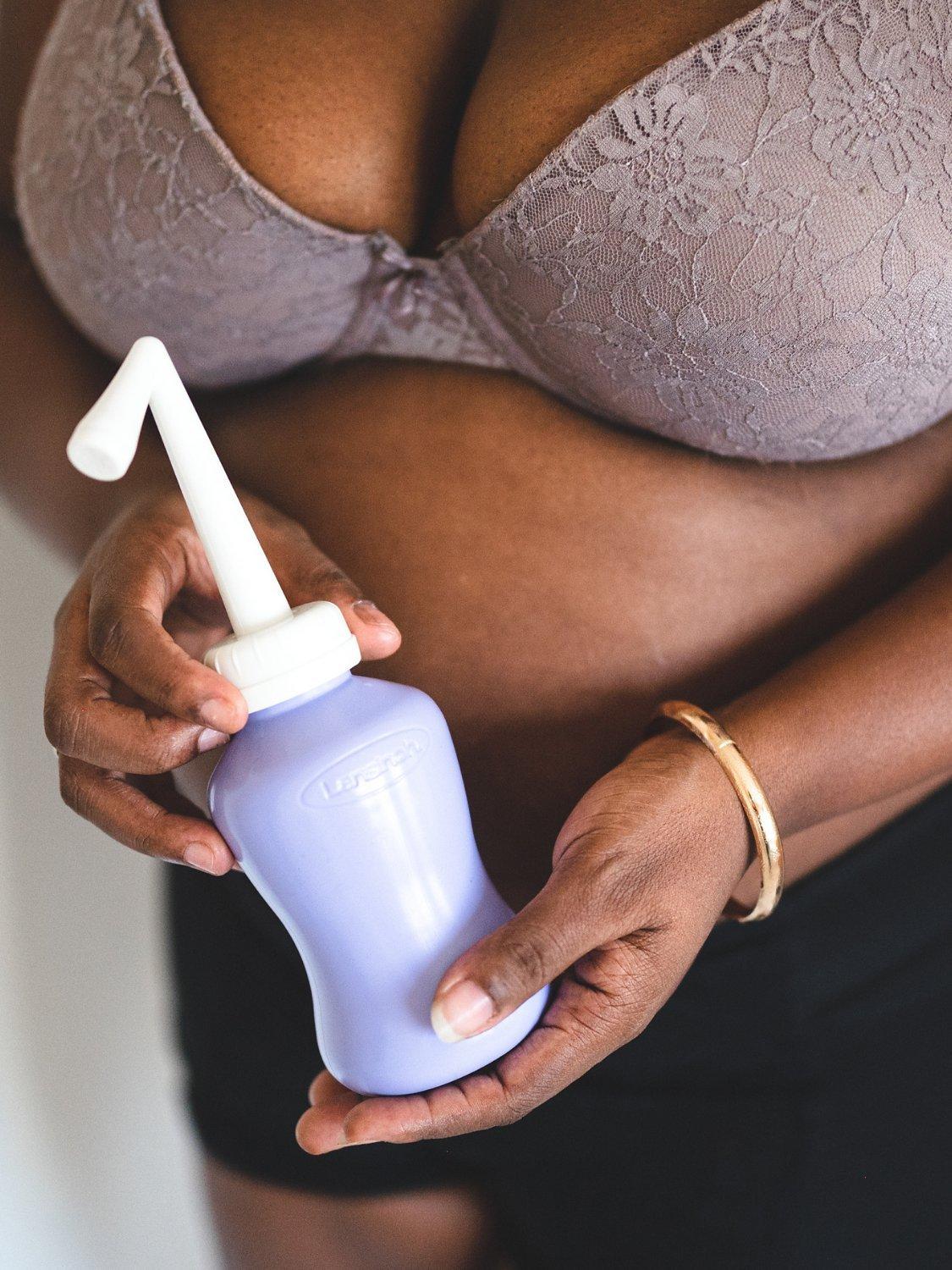 - Fill bottle with warm water. Screw cap on securely and extend nozzle firmly. While on the toilet, invert bottle between legs and aim the tip towards the perineal area. Squeeze bottle gently and repeat as needed.