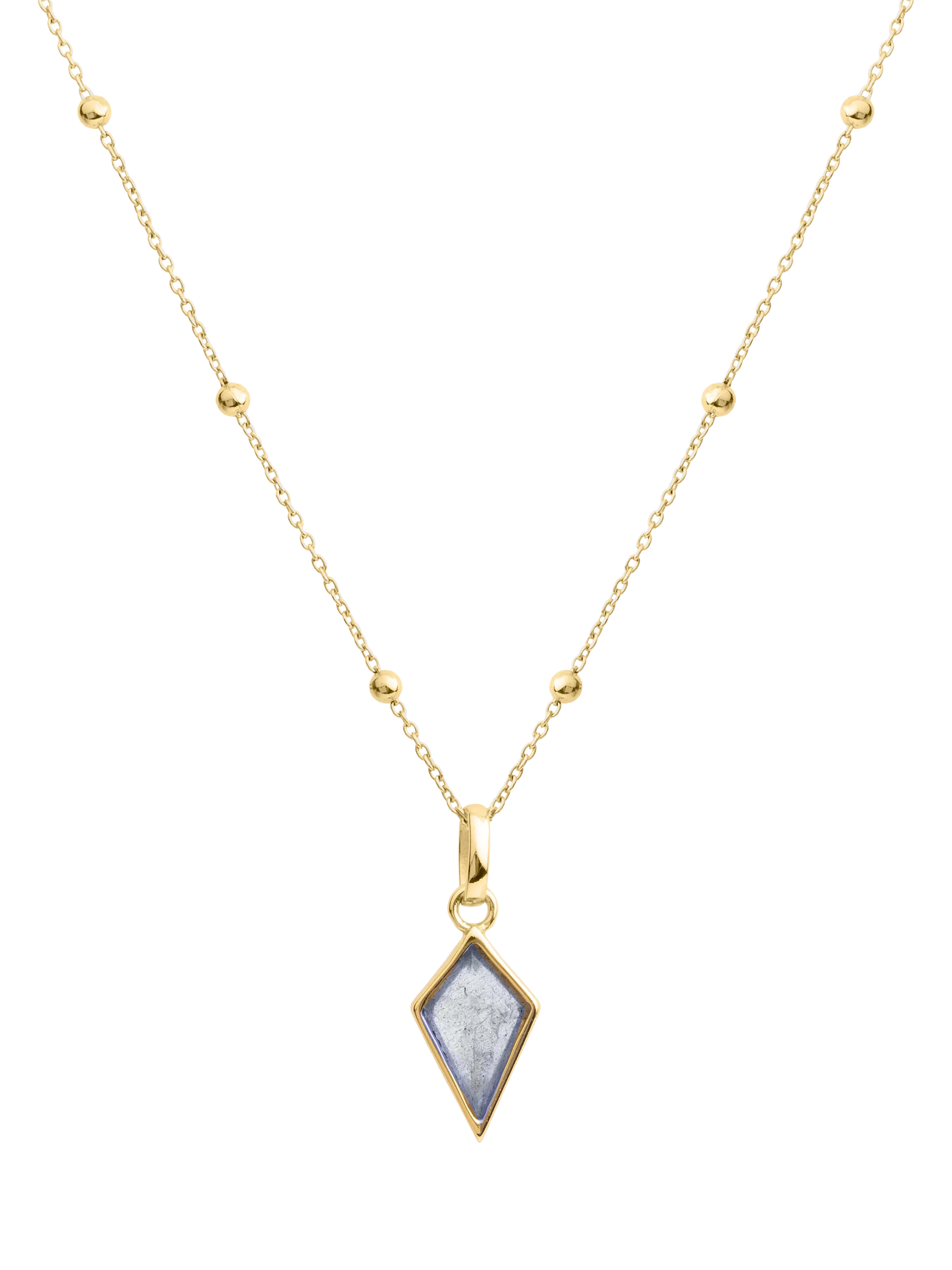 Larnauti's signature pyramid shape translates effortlessly into this striking pendant, suspended from a delicate beaded chain. At its centre, a labradorite stone filters soft grey-blue light. Thoughtfully designed in Nottingham and expertly handcrafted in Italy from 100% recycled sterling silver with a radiant 18ct gold plating.