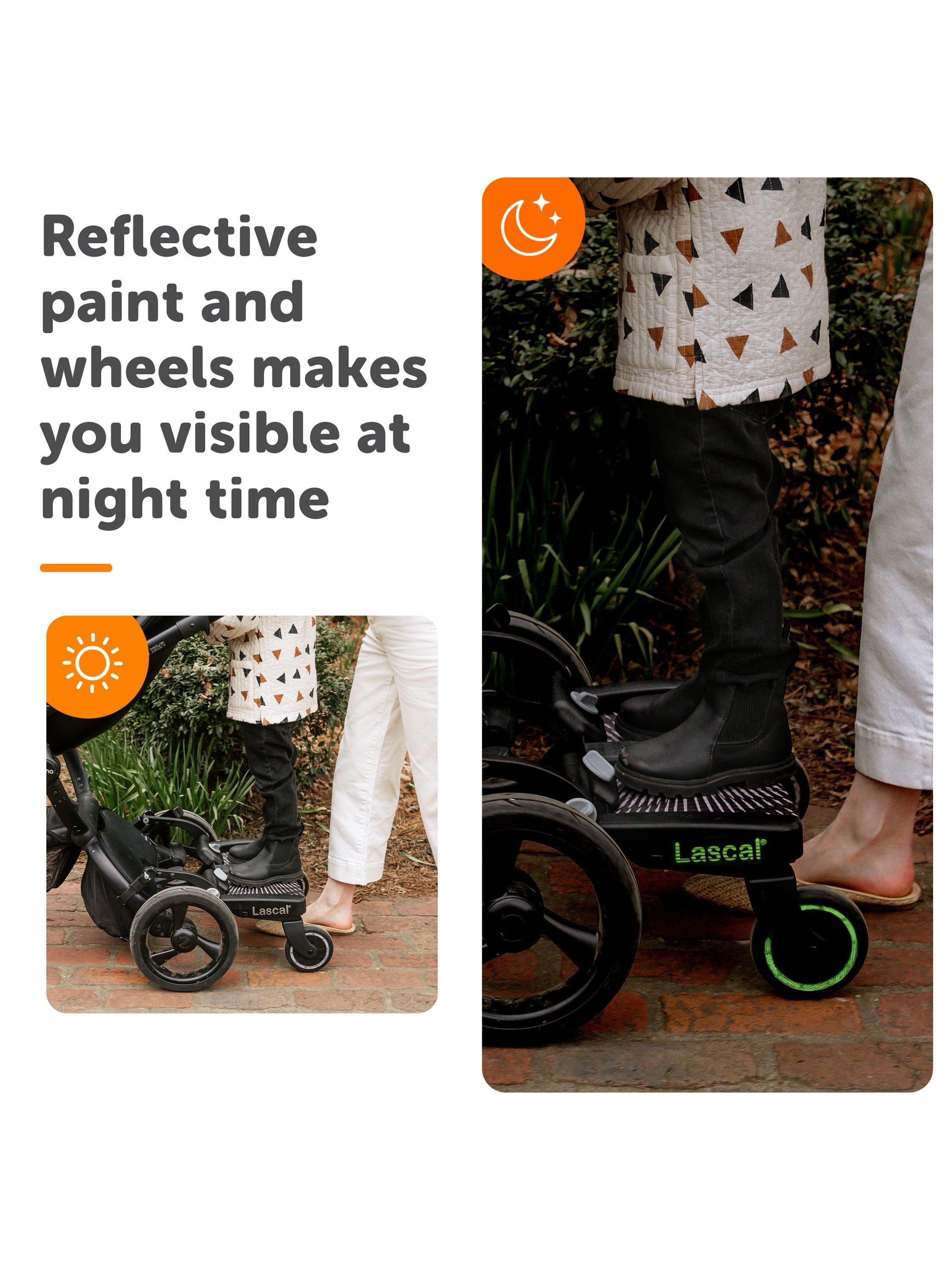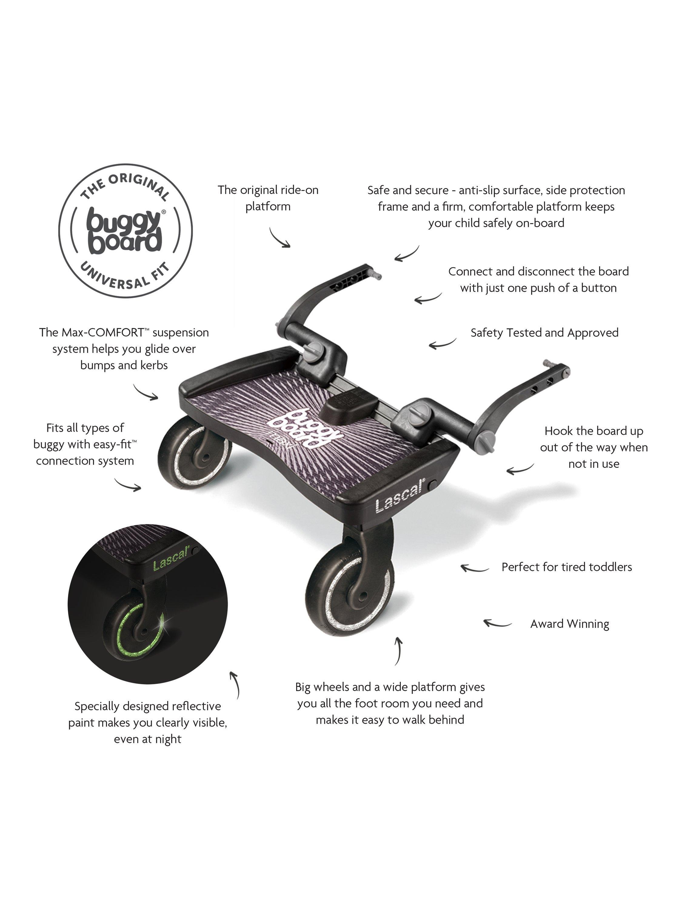 - Extra large wheels make it easy to manouver the BuggyBoard® over kerbs and around corners, and also allow plenty of space for parents feet when walking beind the BuggyBoard®.