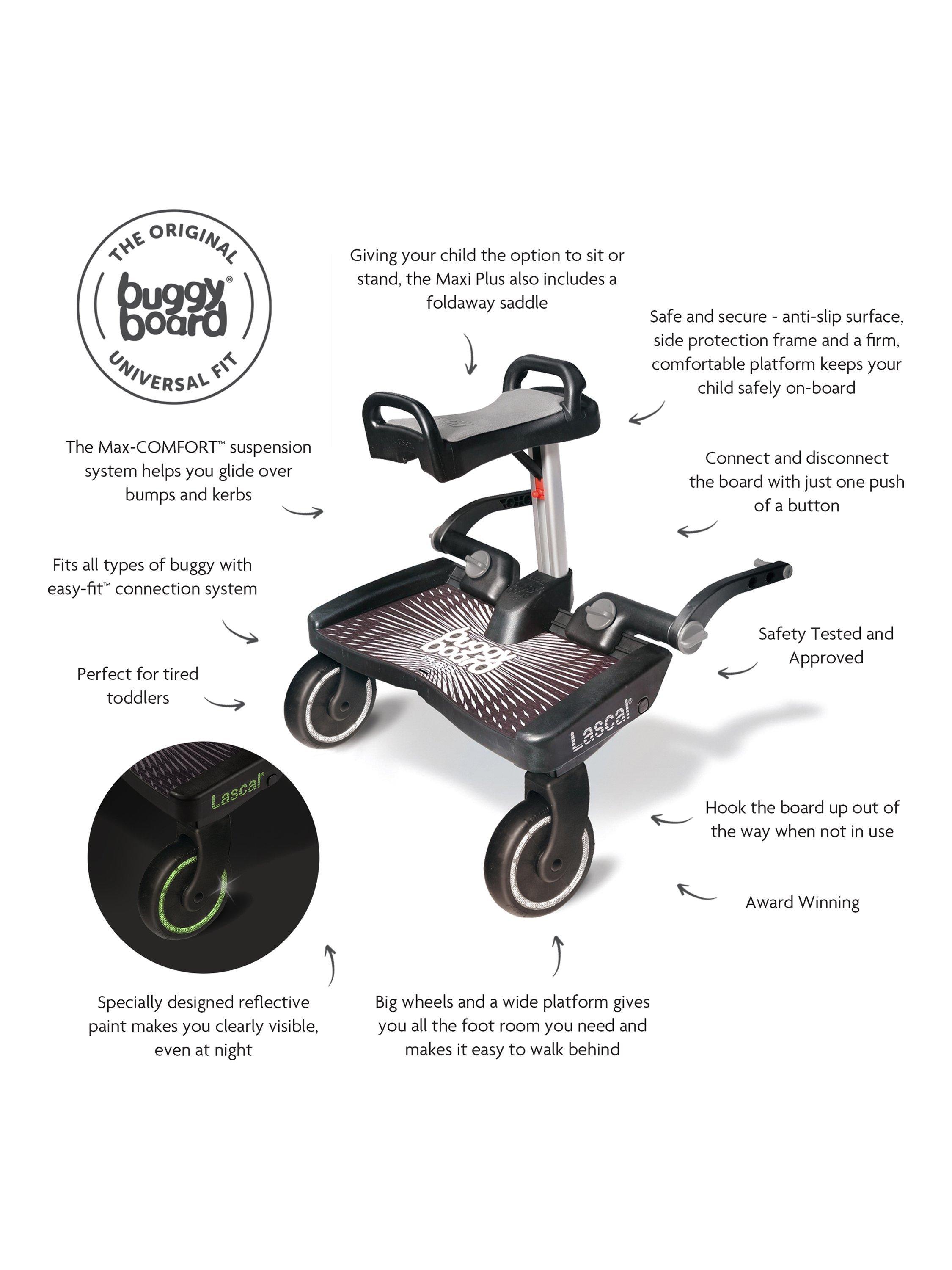 The Maxi BuggyBoard® is the perfect solution for getting around with more than one child. Packed full of ground-breaking design features, it is easy to fit to evolving pram and pushchair designs. Maxi BuggyBoards are easy to connect to virtually any pram or pushchair, including almost all single and double buggies, 3-wheelers and combination travel systems. It is compatible with 99% of pushchairs.