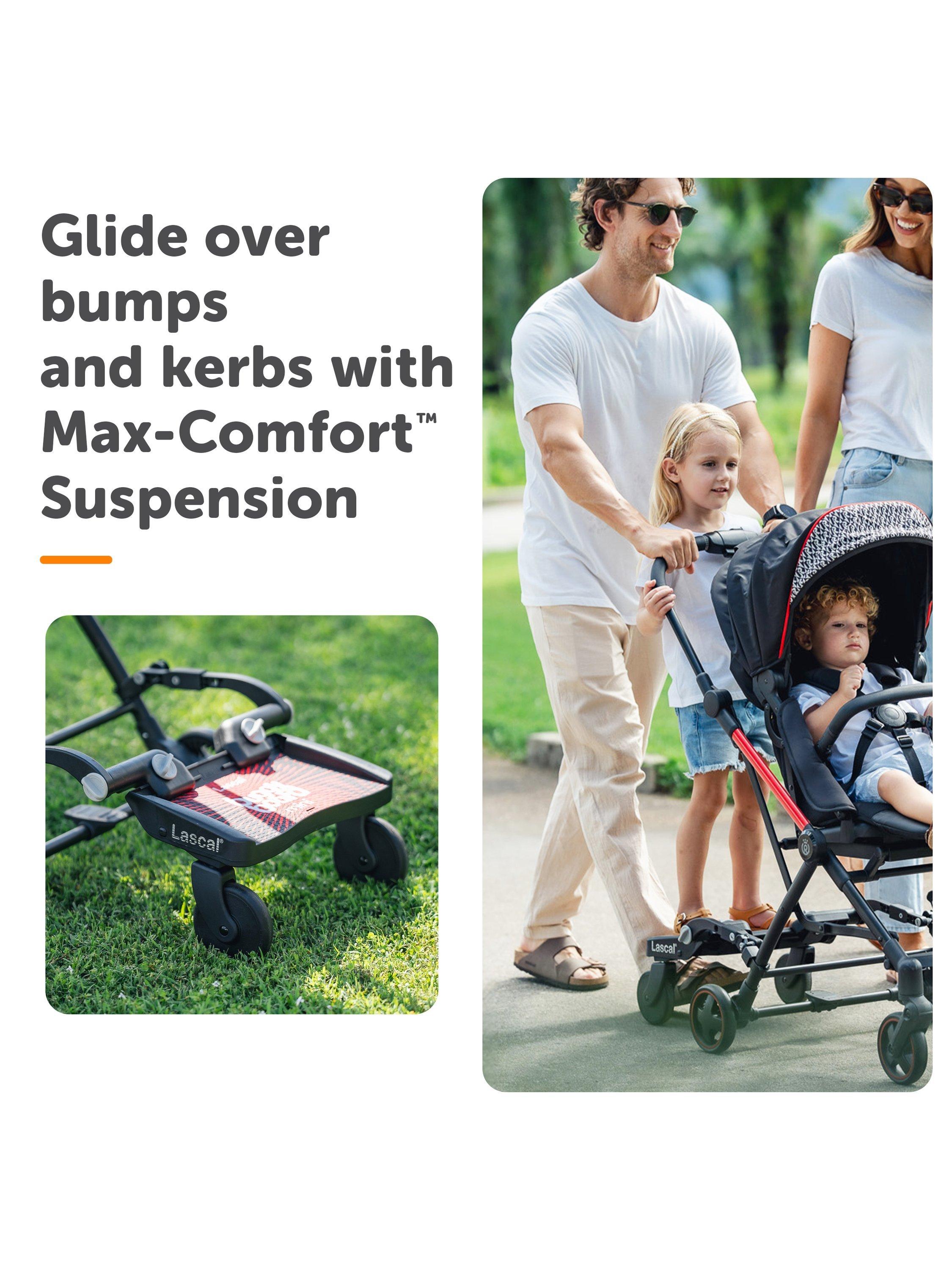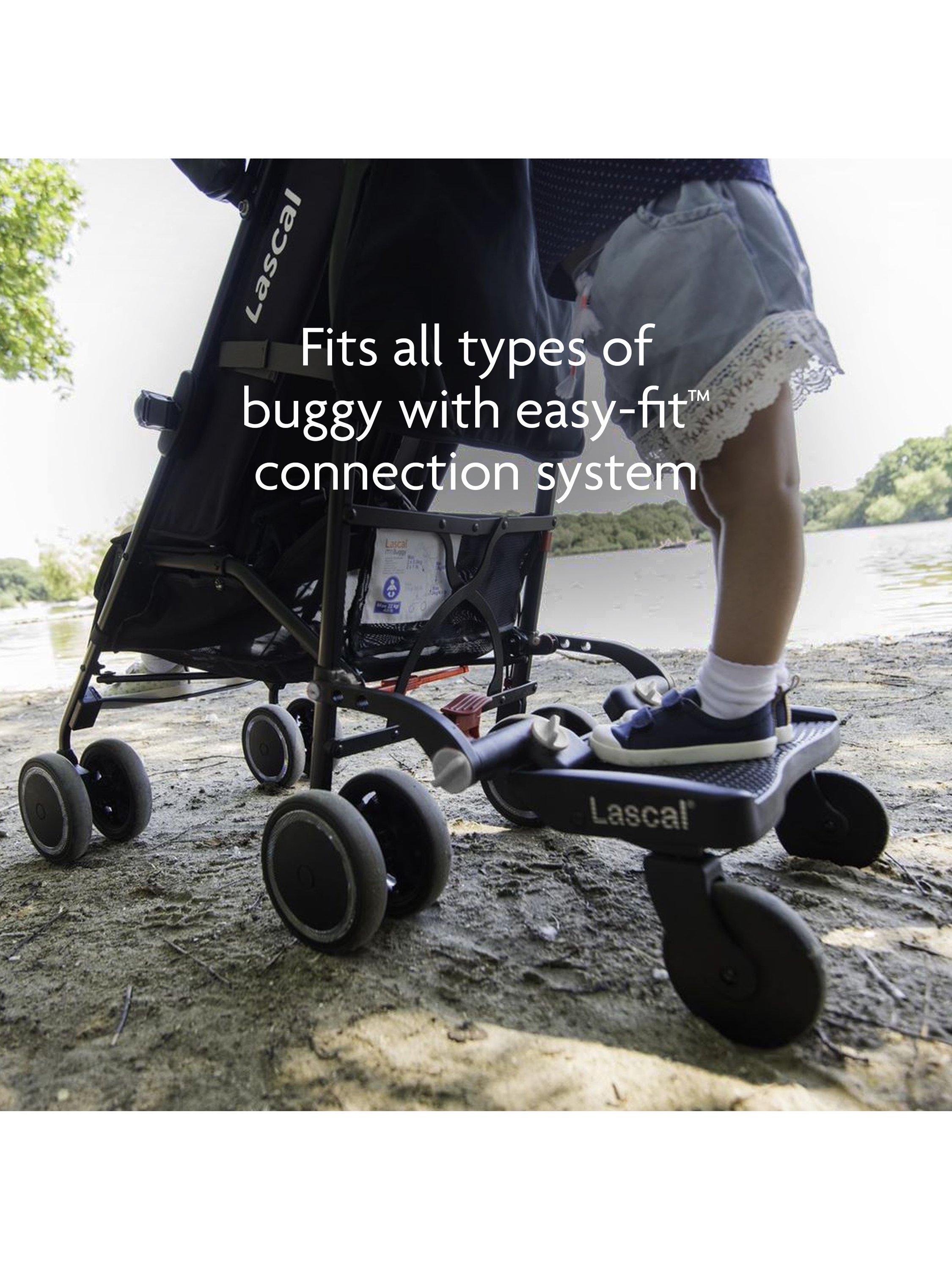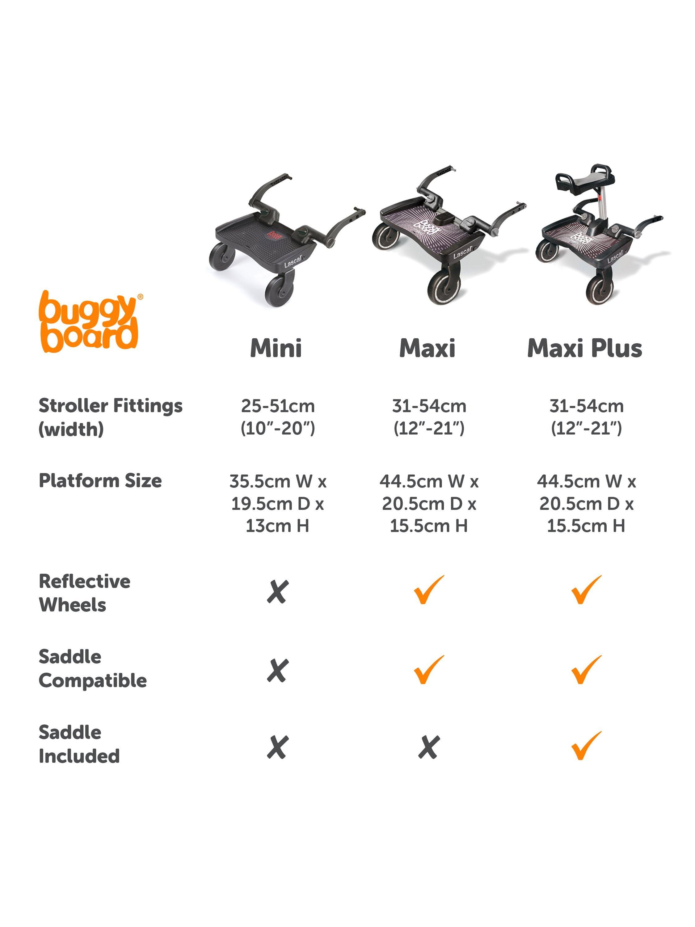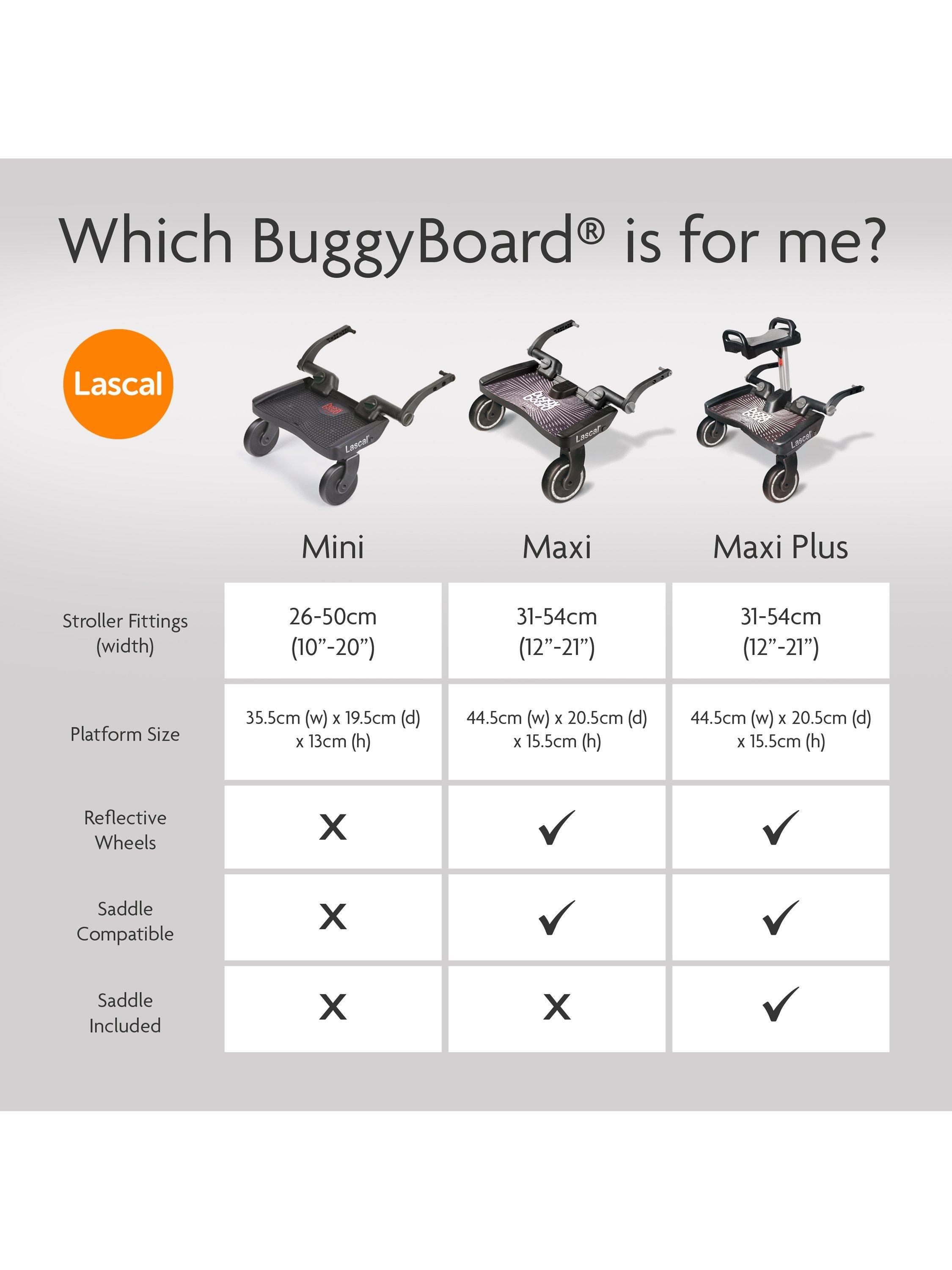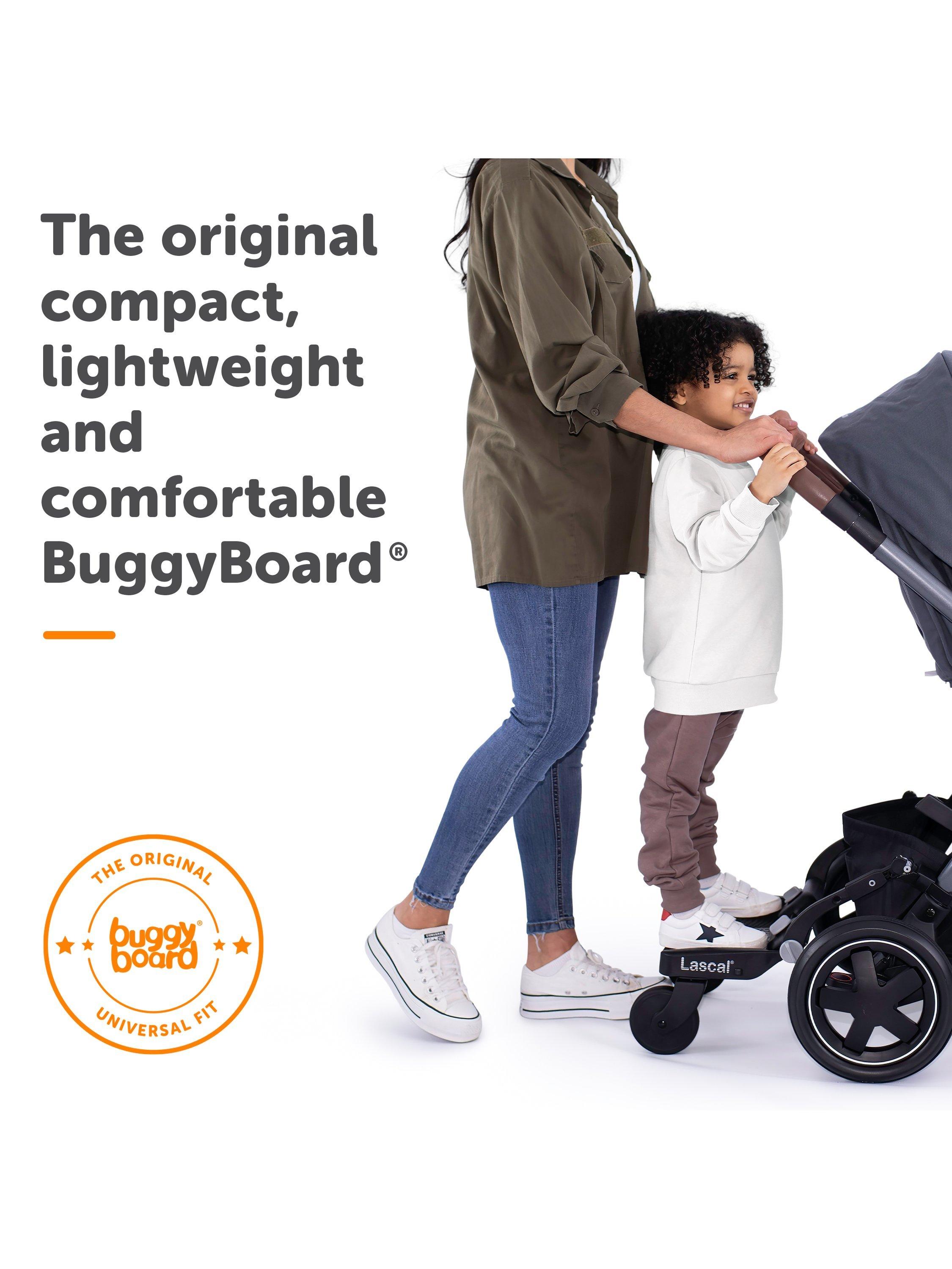 - Large wheels make it easy to manoeuvre the BuggyBoard over kerbs and around corners, and also allow plenty of space for parents feet when walking behind the BuggyBoard.