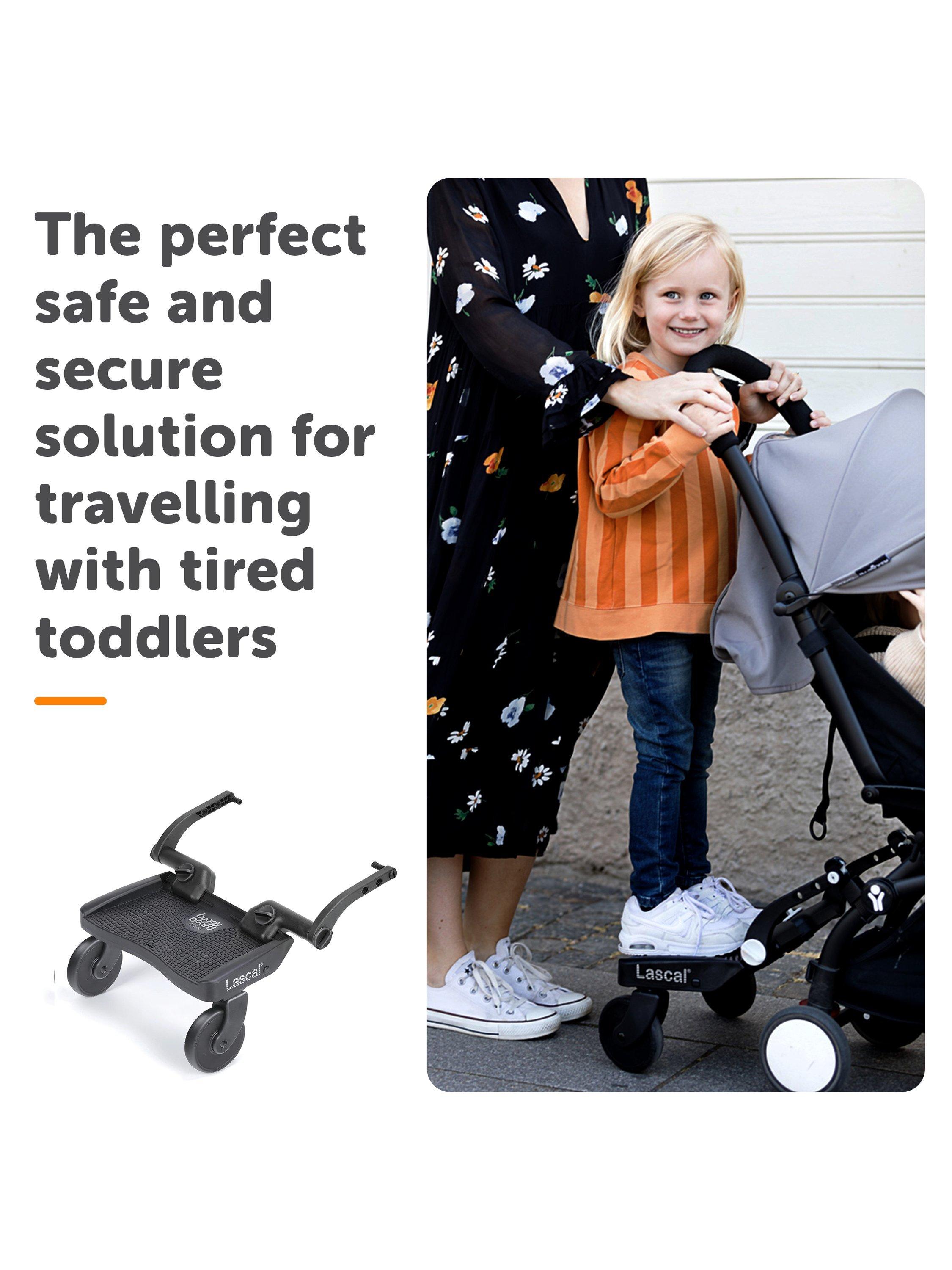 - Toddlers will be safely positioned in front of the pushchair handle (on some pushchair models they may stand behind the pushchair handle).