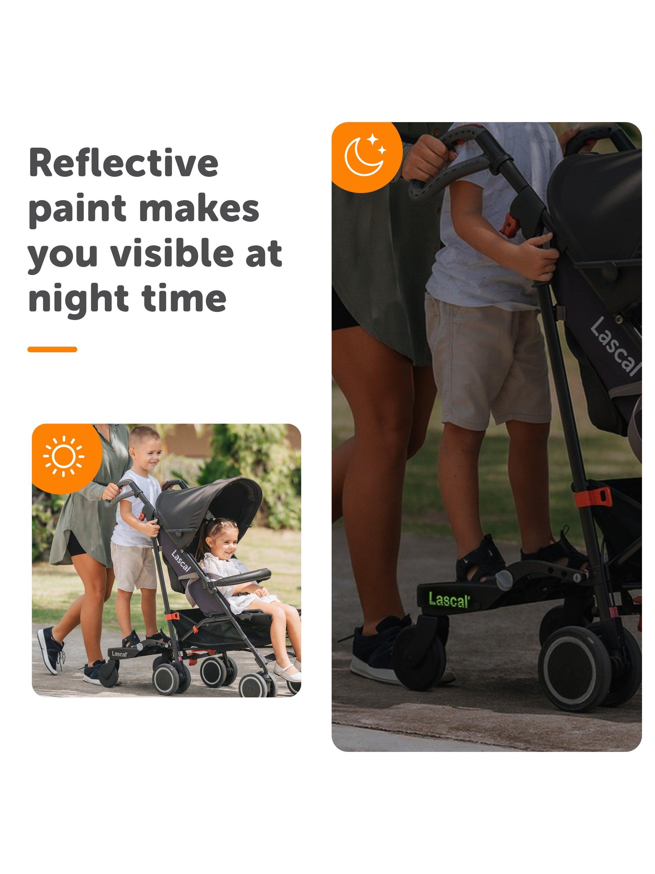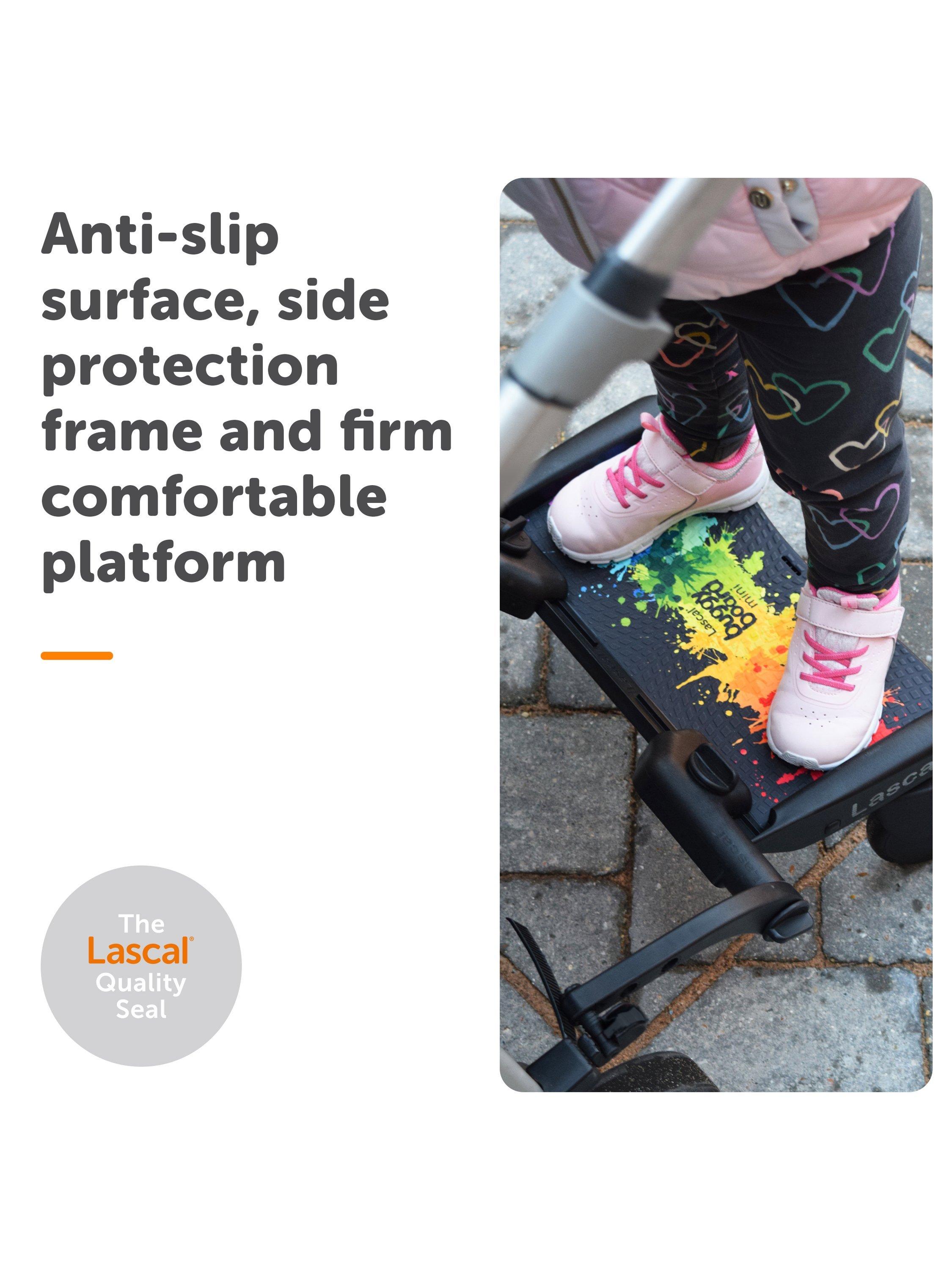 The Mini BuggyBoard is the perfect solution for getting around with more than one child. Packed full of ground-breaking design features, it is easy to fit to evolving pram and pushchair designs including almost all single and double buggies, 3-wheelers and combination travel systems. It is compatible with 99% of pushchairs.