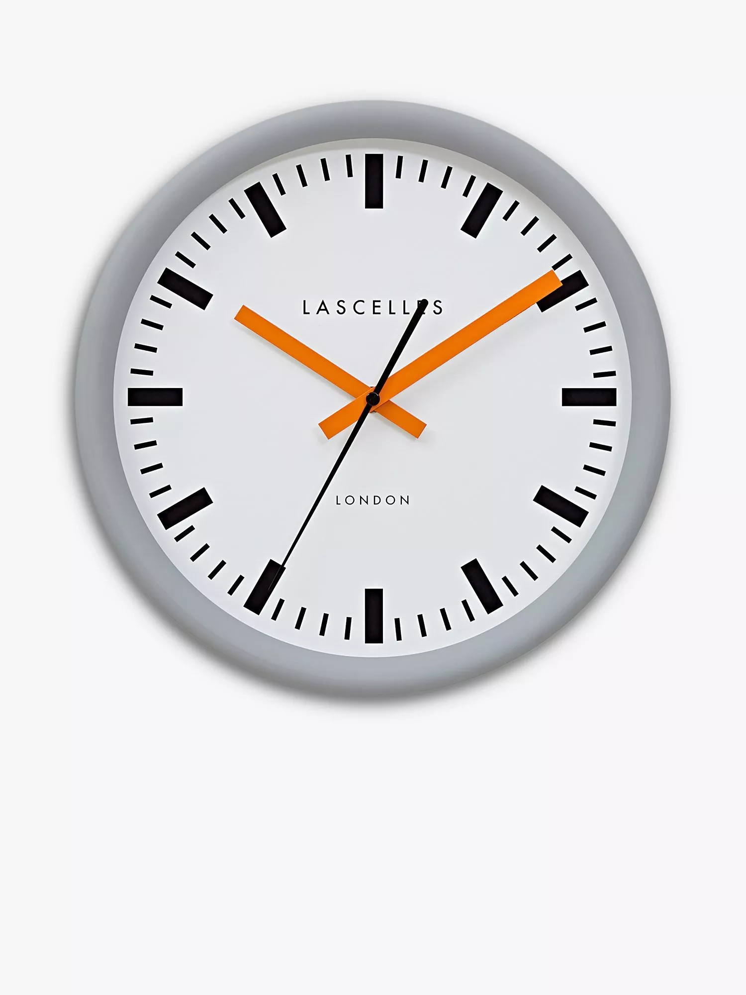 Inspired by Swiss railway station clock designs, this Lascelles wall clock has a simple casing and brightly coloured baton hands.