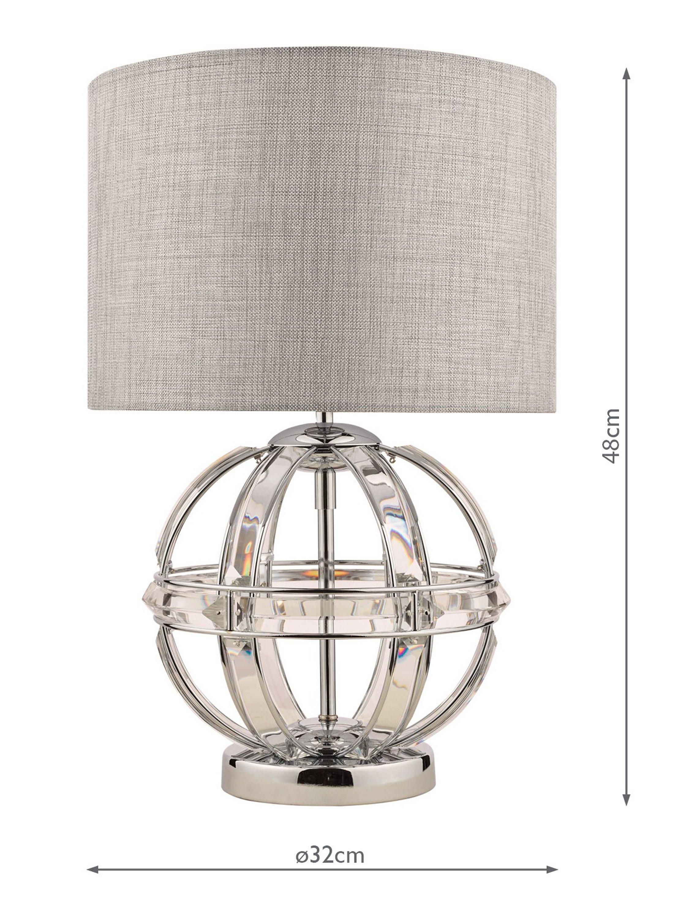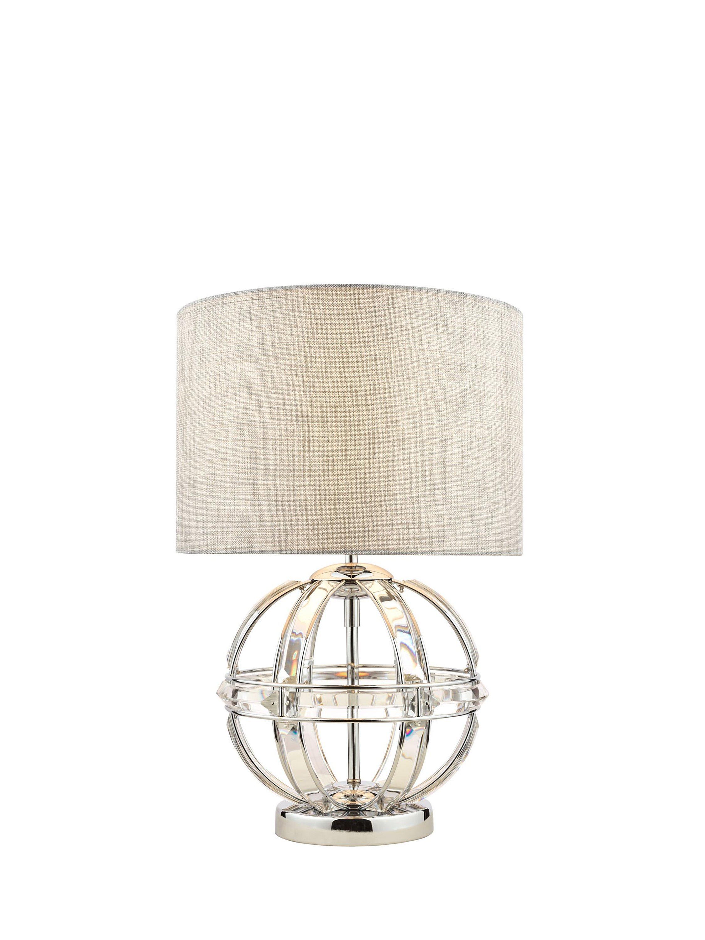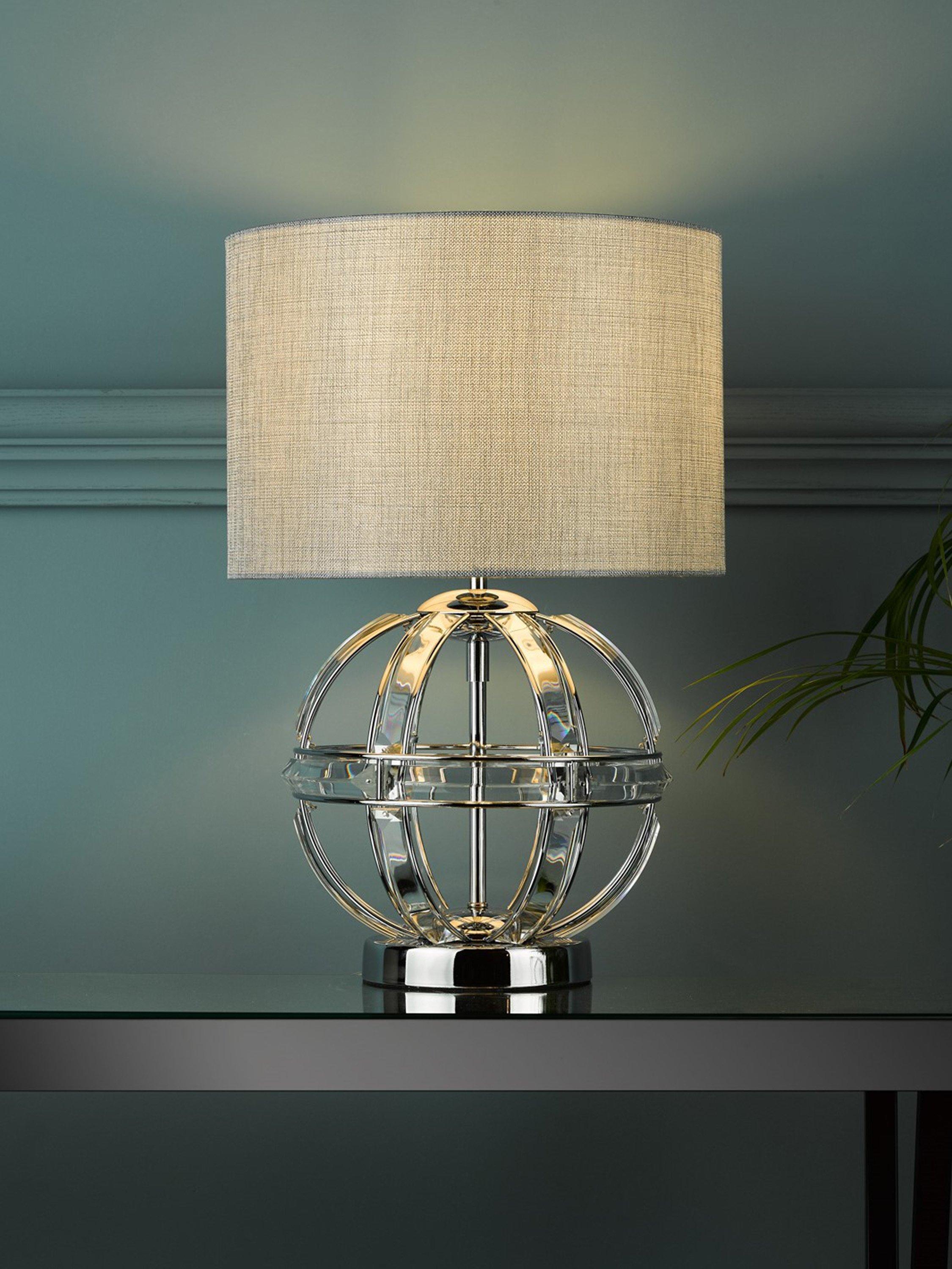 This decorative table lamp will sit neatly in any room of your home. The base is a pretty open globe, formed from faceted crystals and metal trims in a polished chrome finish. It's paired with a natural linen lampshade that enhances a warm, diffused glow of light.