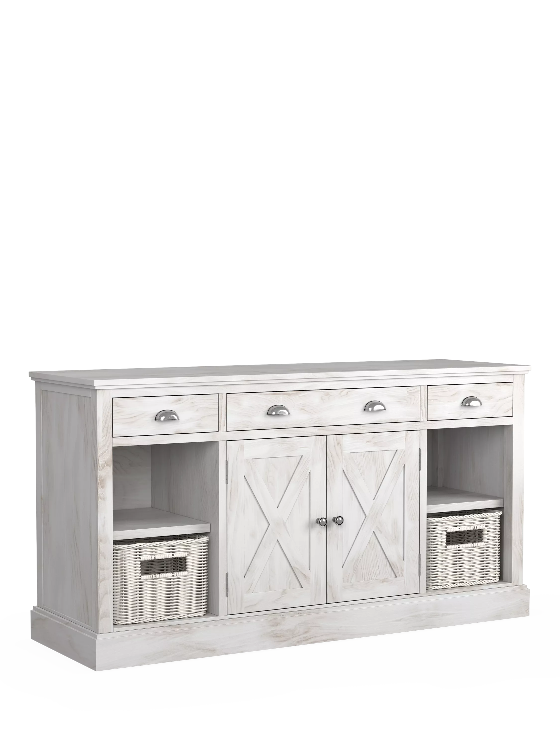 Three deep drawers run traditionally on the carcase and are furnished with pewter-effect cup handles. Adjustable shelves feature in both the open and enclosed spaces, allowing for the two rattan baskets to be placed in either location. Traditional butt hinges are used for the doors which are also finished with complementary pewter-effect knobs.