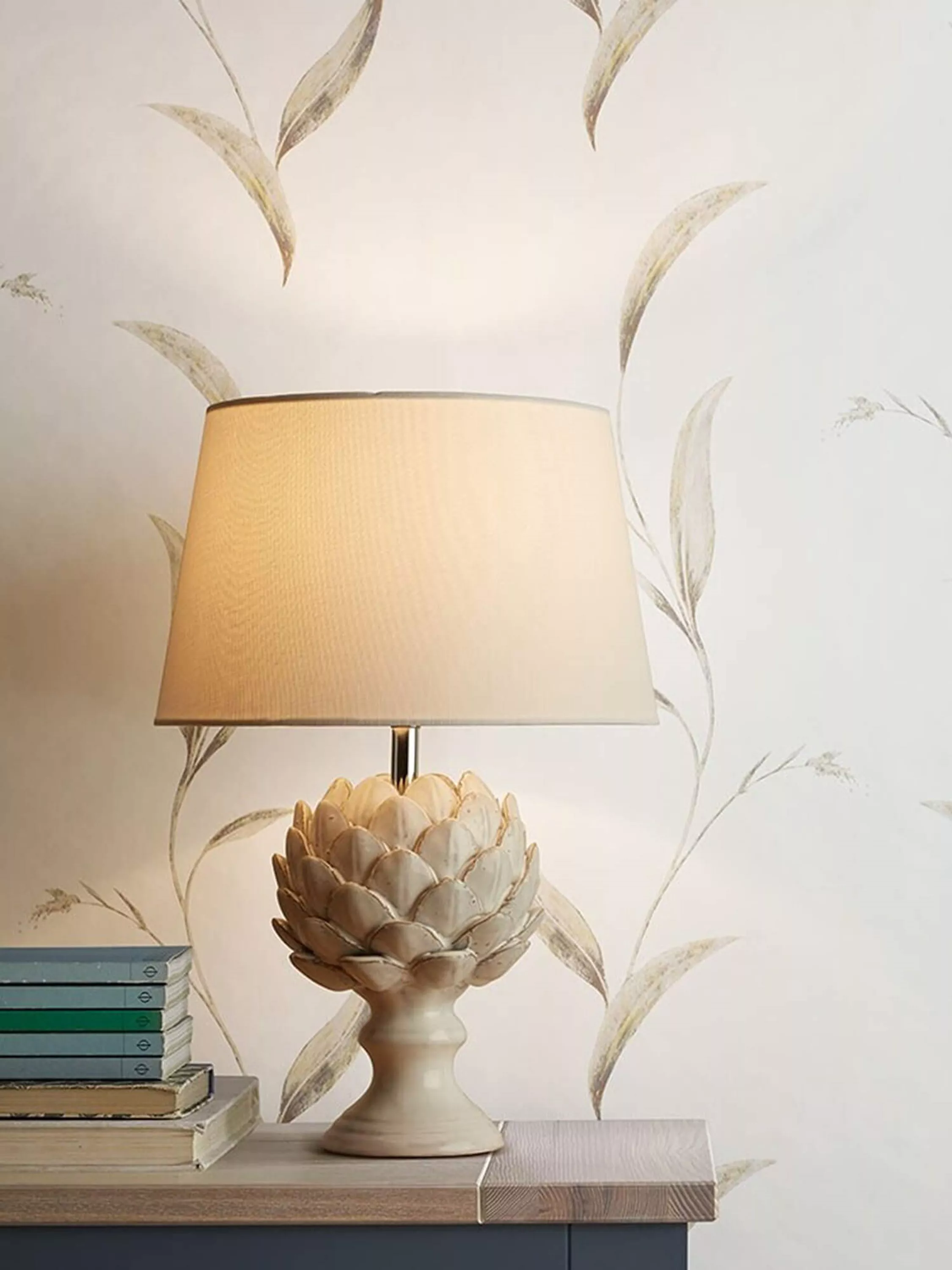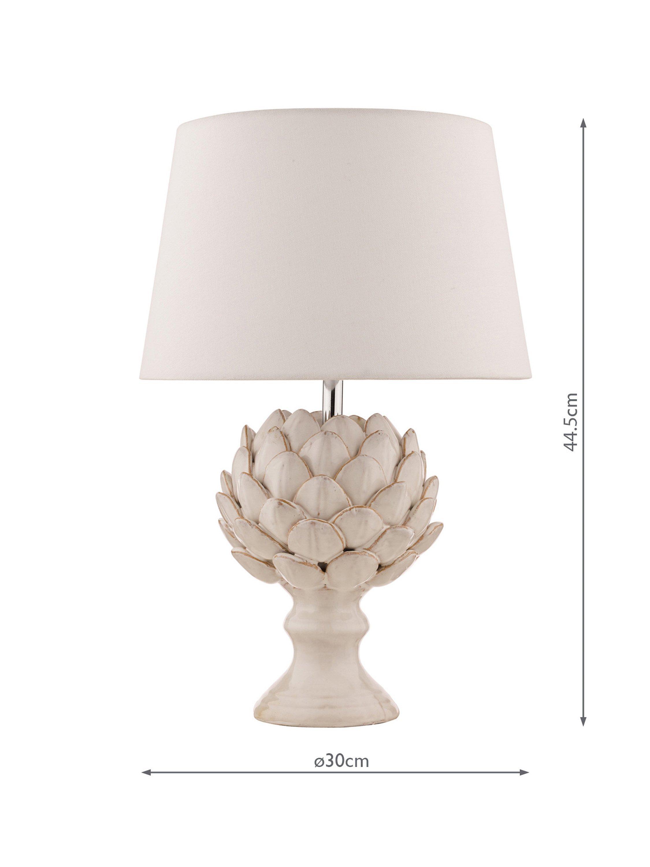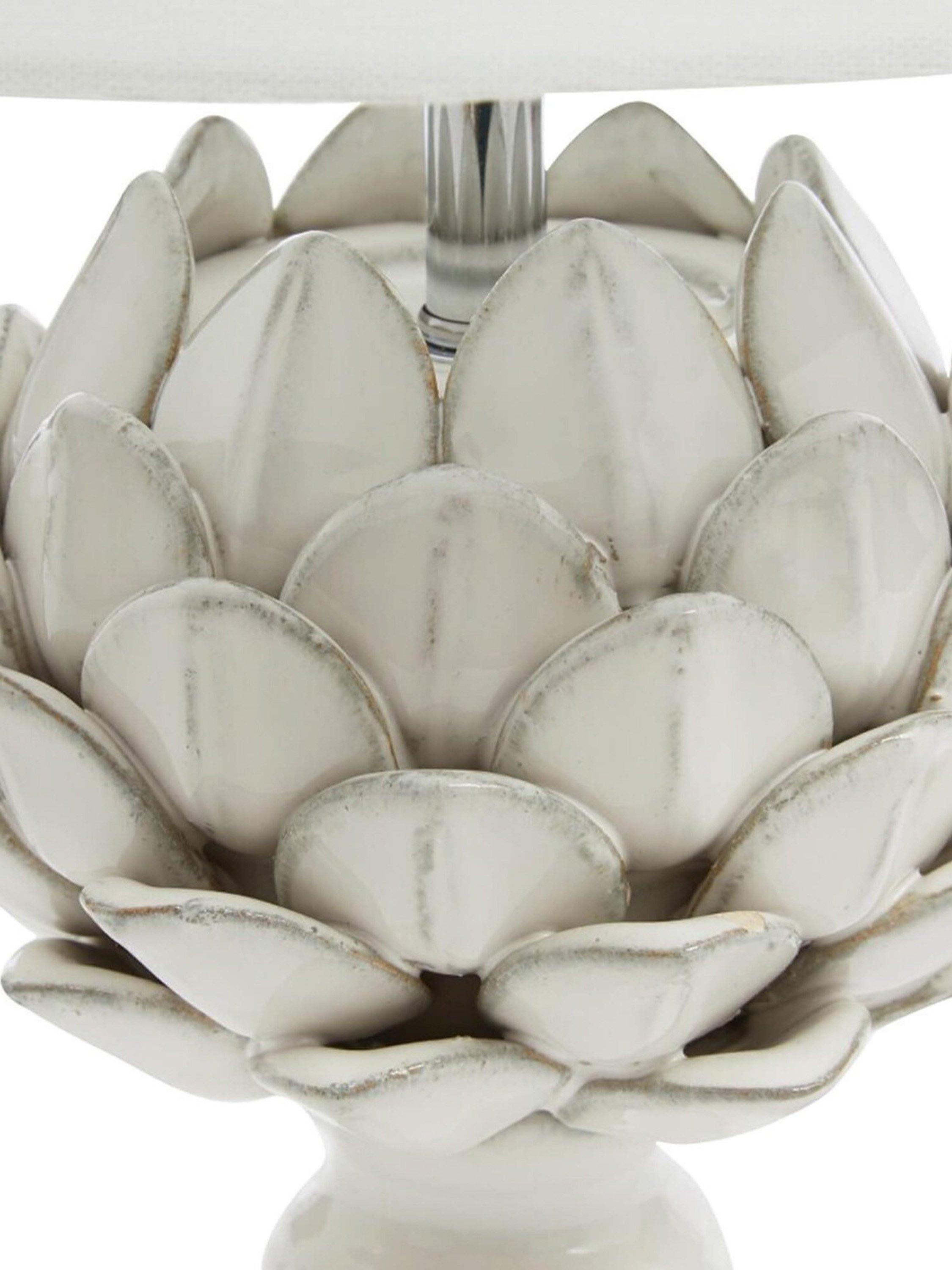 A ceramic table lamp with a quirky twist. Yes, inspired by the artichoke itself, this table lamp has a gloss-glazed finish that highlights the colour and shade variations of the curvy vegetable. It's teamed with a natural linen lampshade that enhances a warm glow of light and it will draw the eye wherever you style it in your home. One LED bulb is required.
