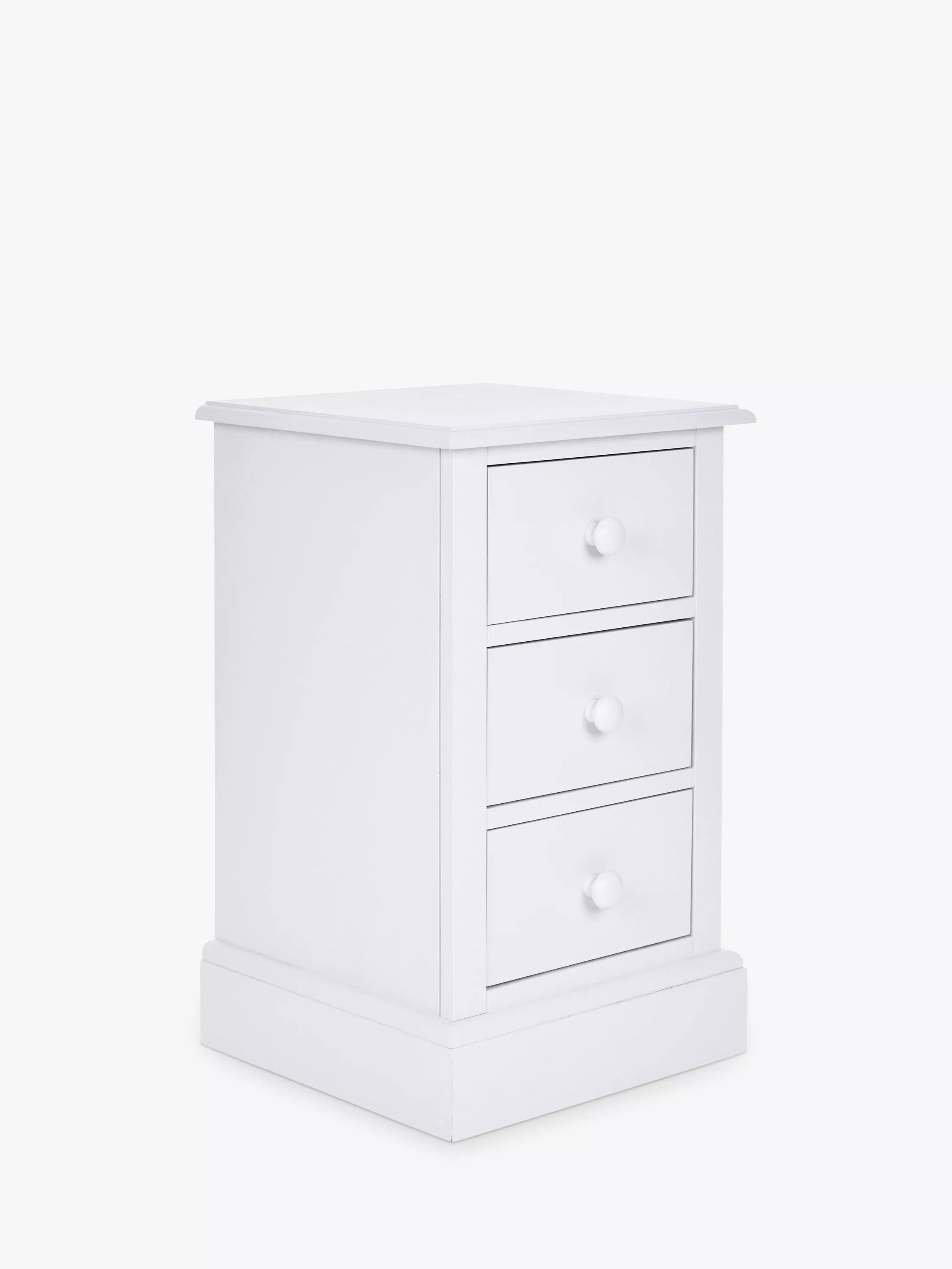 Bedside storage is a novelty and this bedside table is designed with three spacious drawers. Traditionally designed with a profiled top and bottom plinth, it's made from sturdy wood and hand-painted both inside and out. Visible brush strokes in the paintwork add extra charm and character. Relatively narrow, don't worry about it taking up too much space in your bedroom. It's the perfect size for all your bedside essentials.
