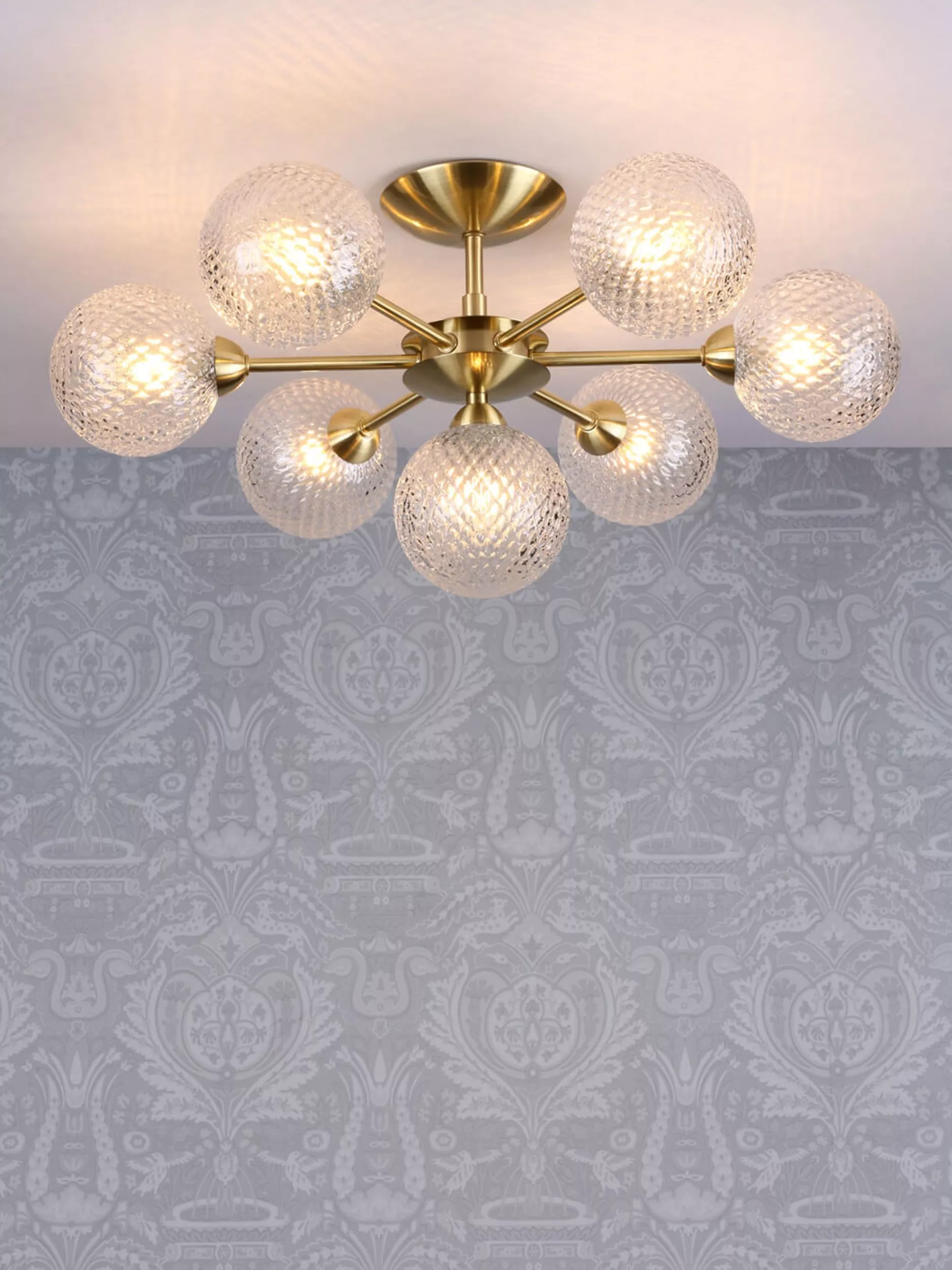 Thanks to its seven arms, this bold semi-flush ceiling fitting will spread light around your room. It has textured glass globe shades that offer a sparkly accent when illuminated and it's available in a choice of metal finishes. Seven LED bulbs are required.