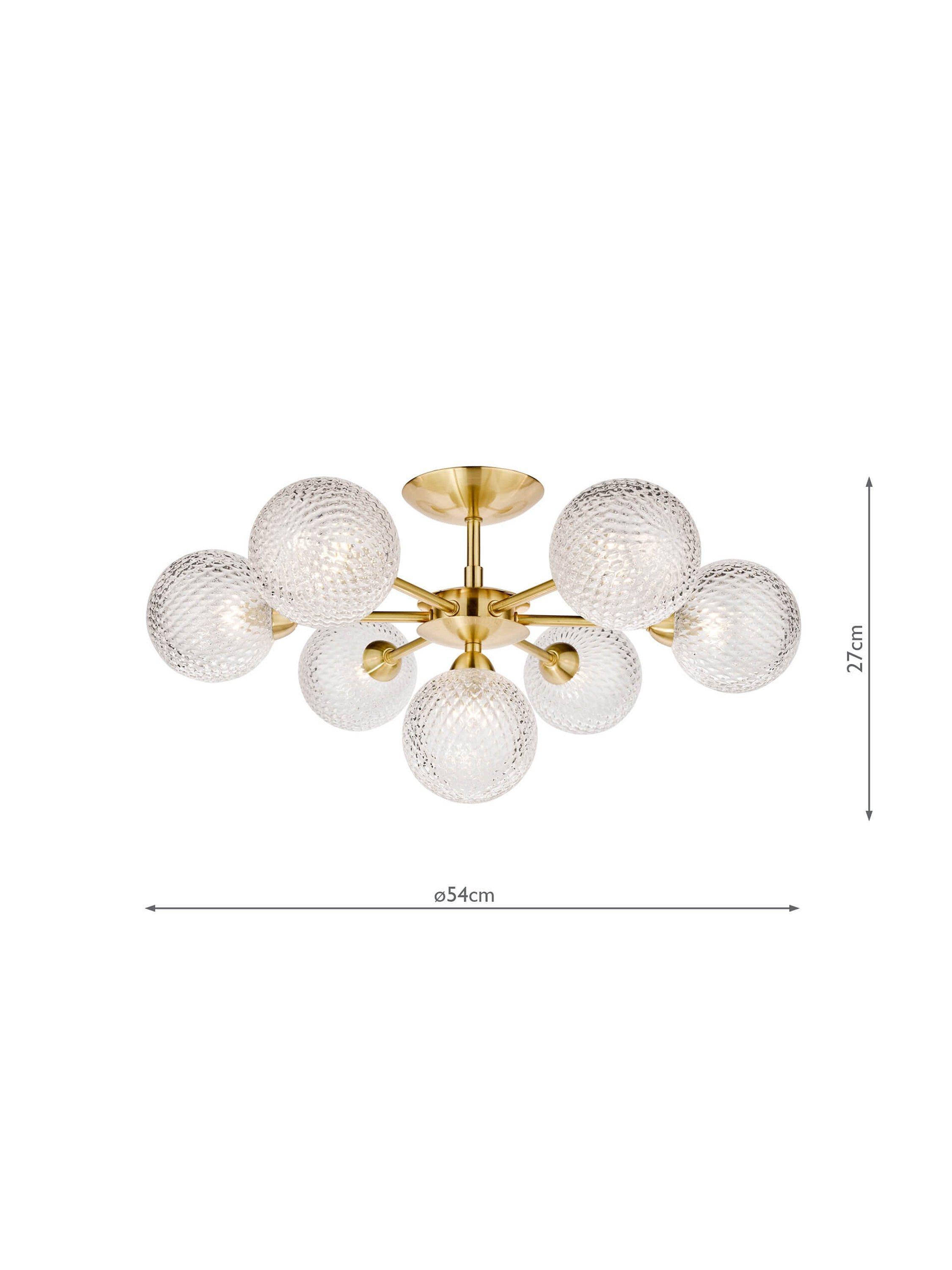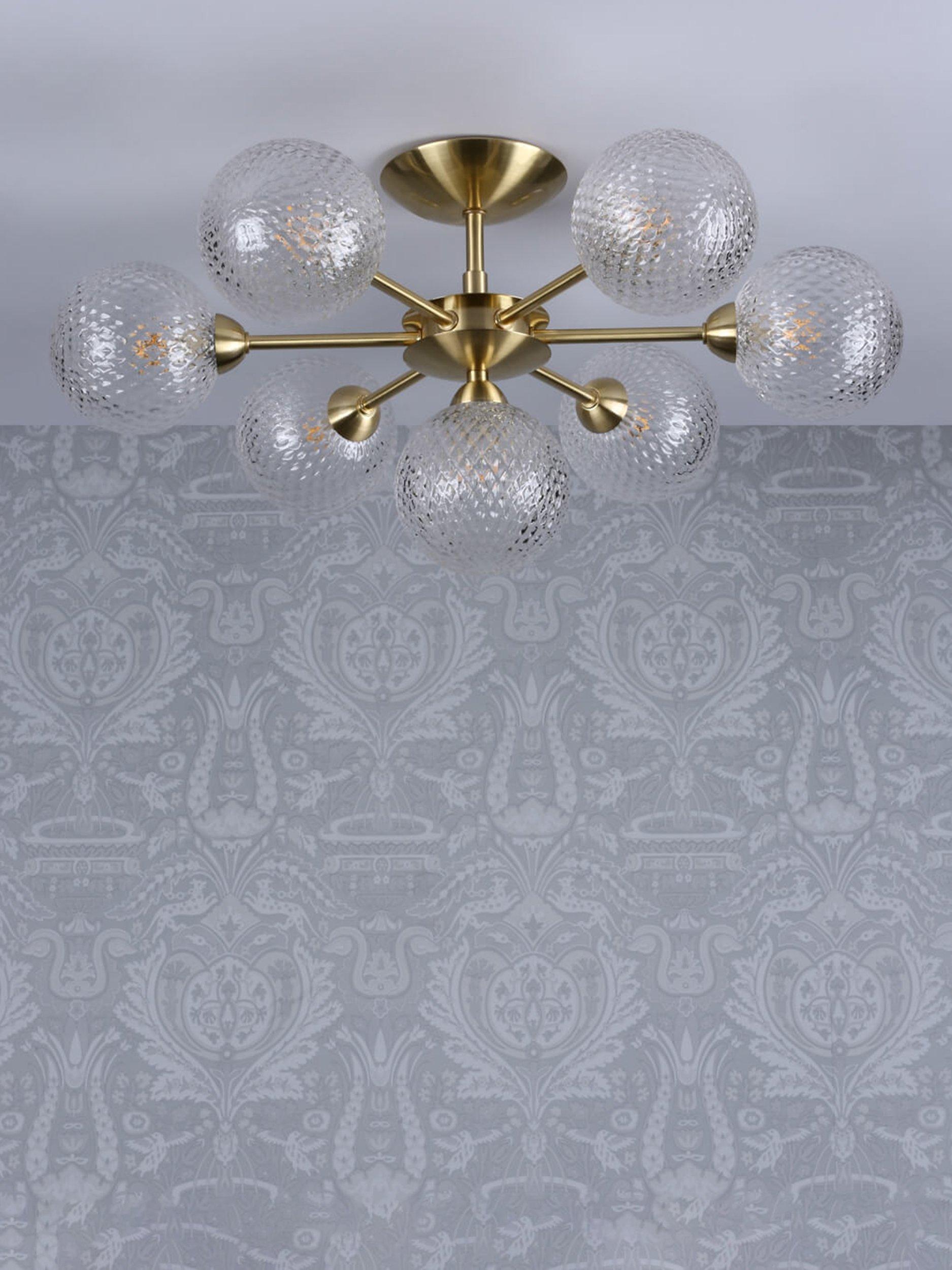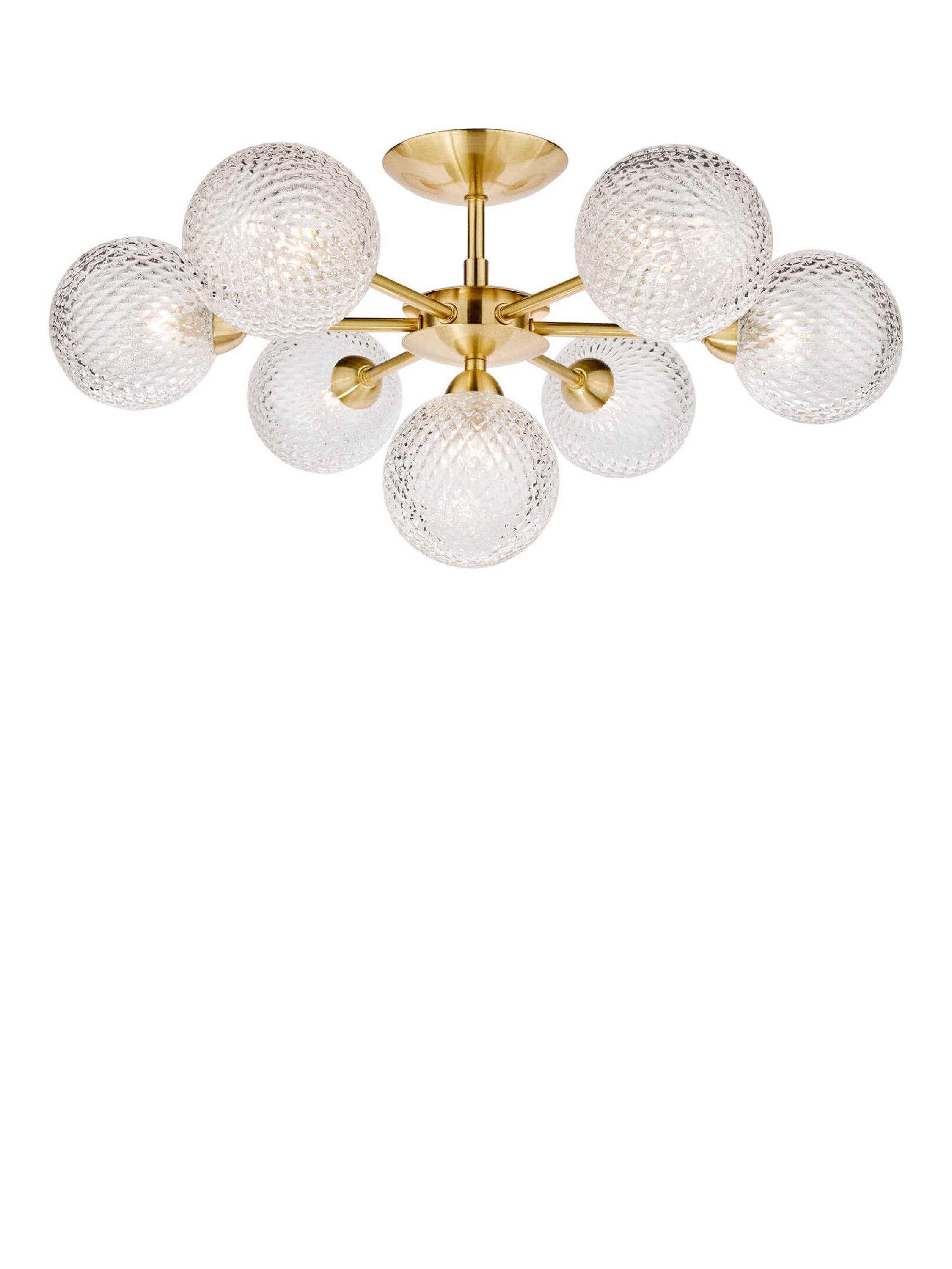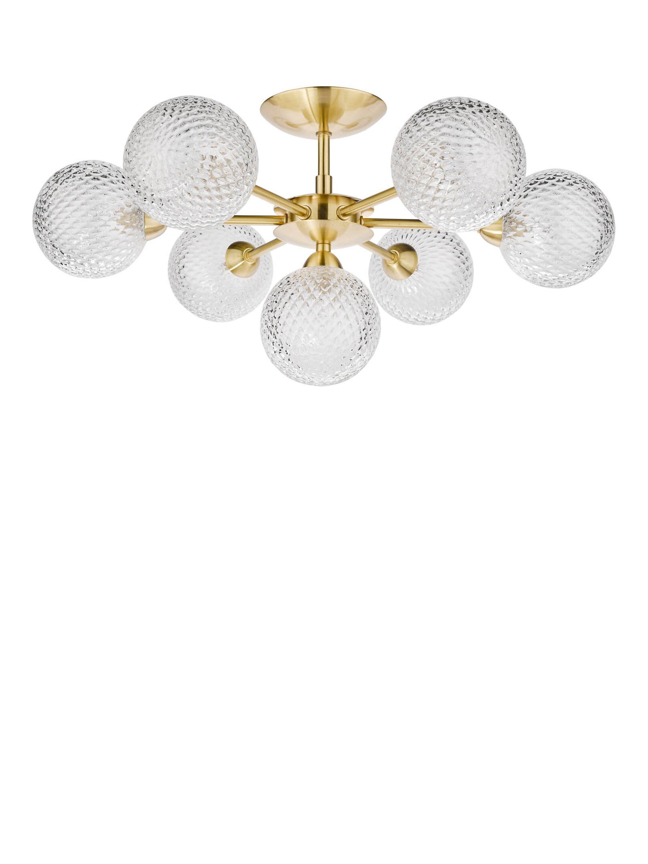 Thanks to its seven arms, this bold semi-flush ceiling fitting will spread light around your room. It has textured glass globe shades that offer a sparkly accent when illuminated and it's available in a choice of metal finishes. Seven LED bulbs are required.