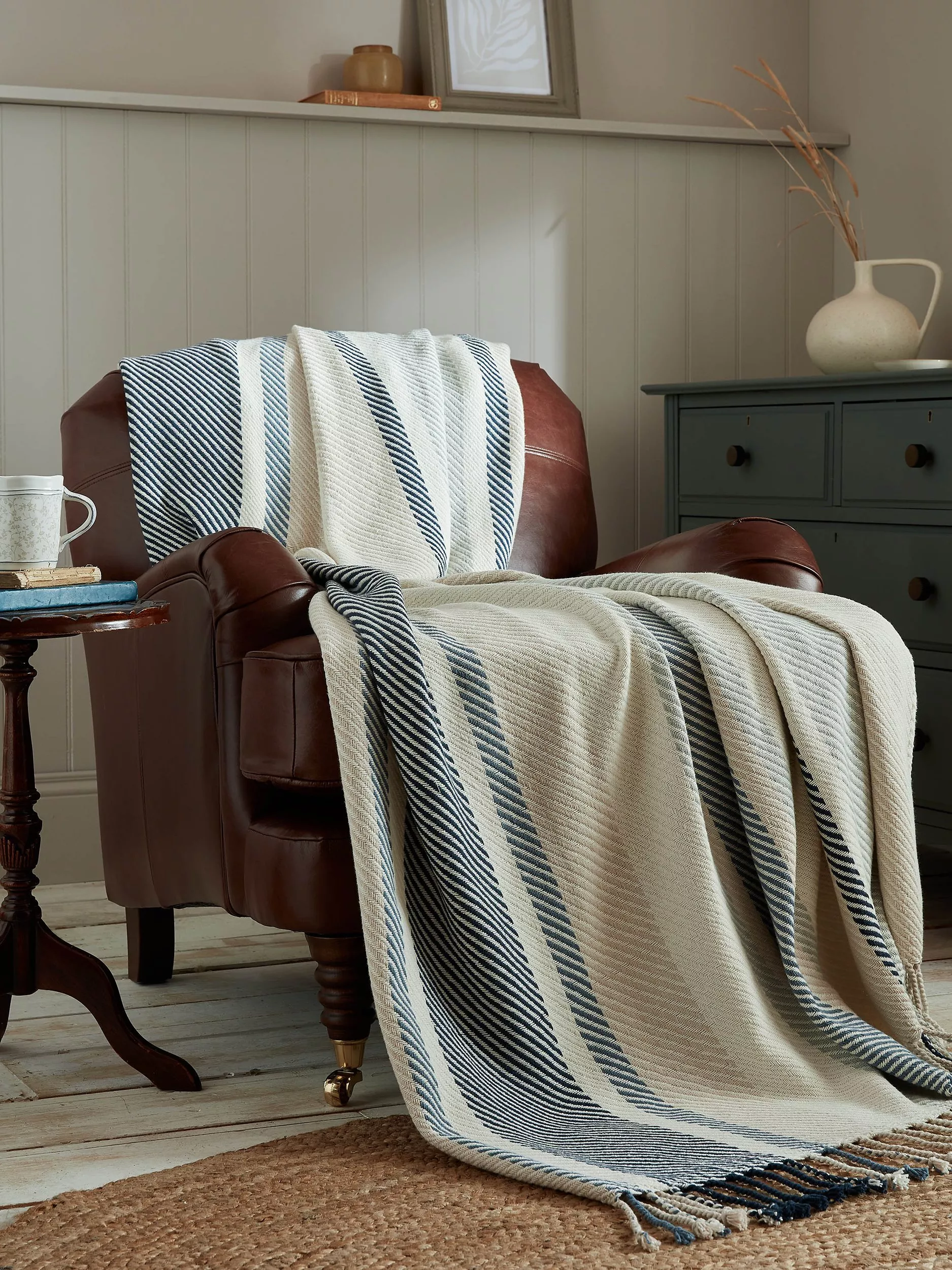 Laura Ashley's Awning stripe throw is a timeless design in a fresh seaspray blue colourway. Woven from 100% cotton with tassel edge detailing, this classic design will freshen up any bedroom.