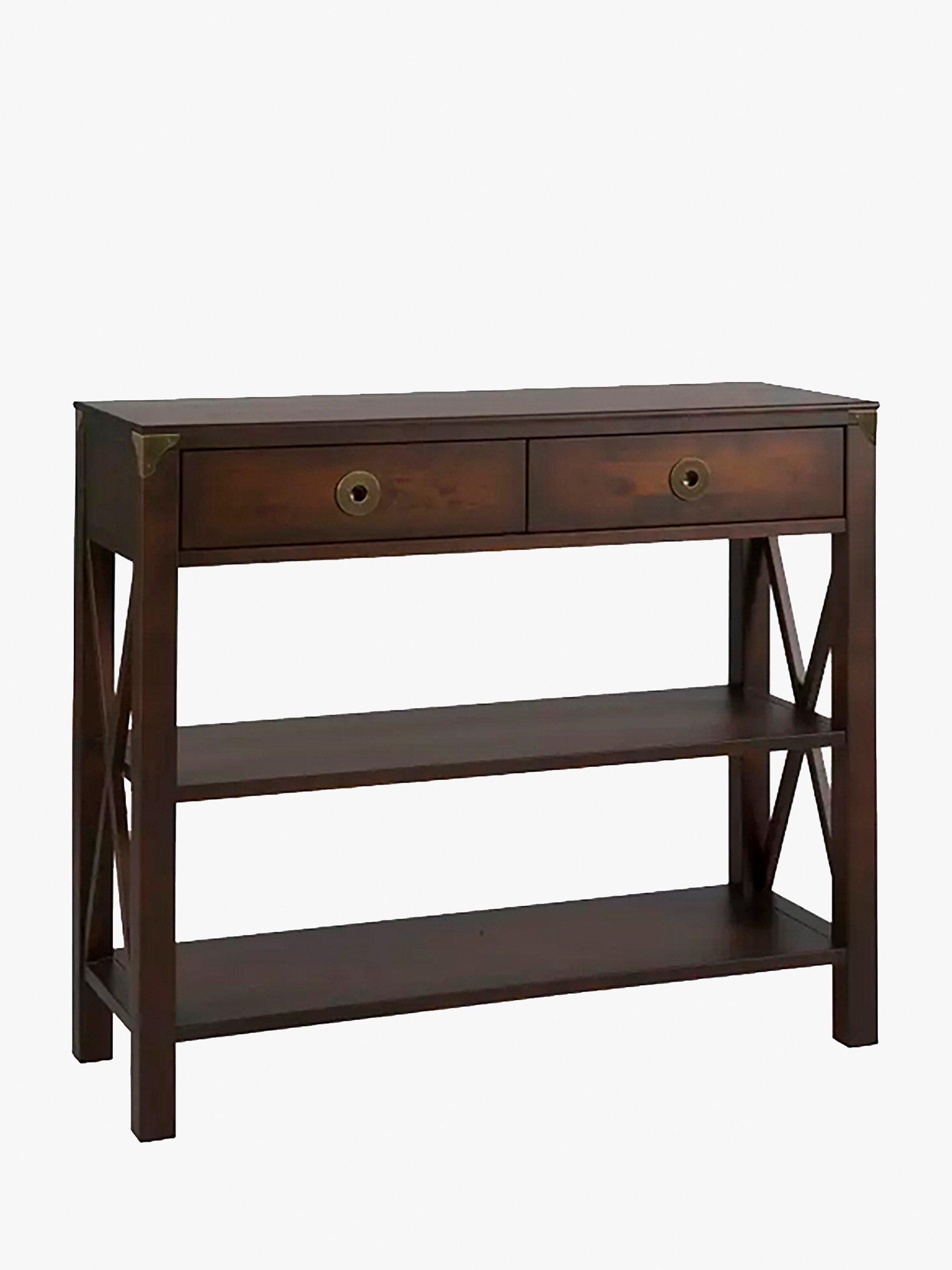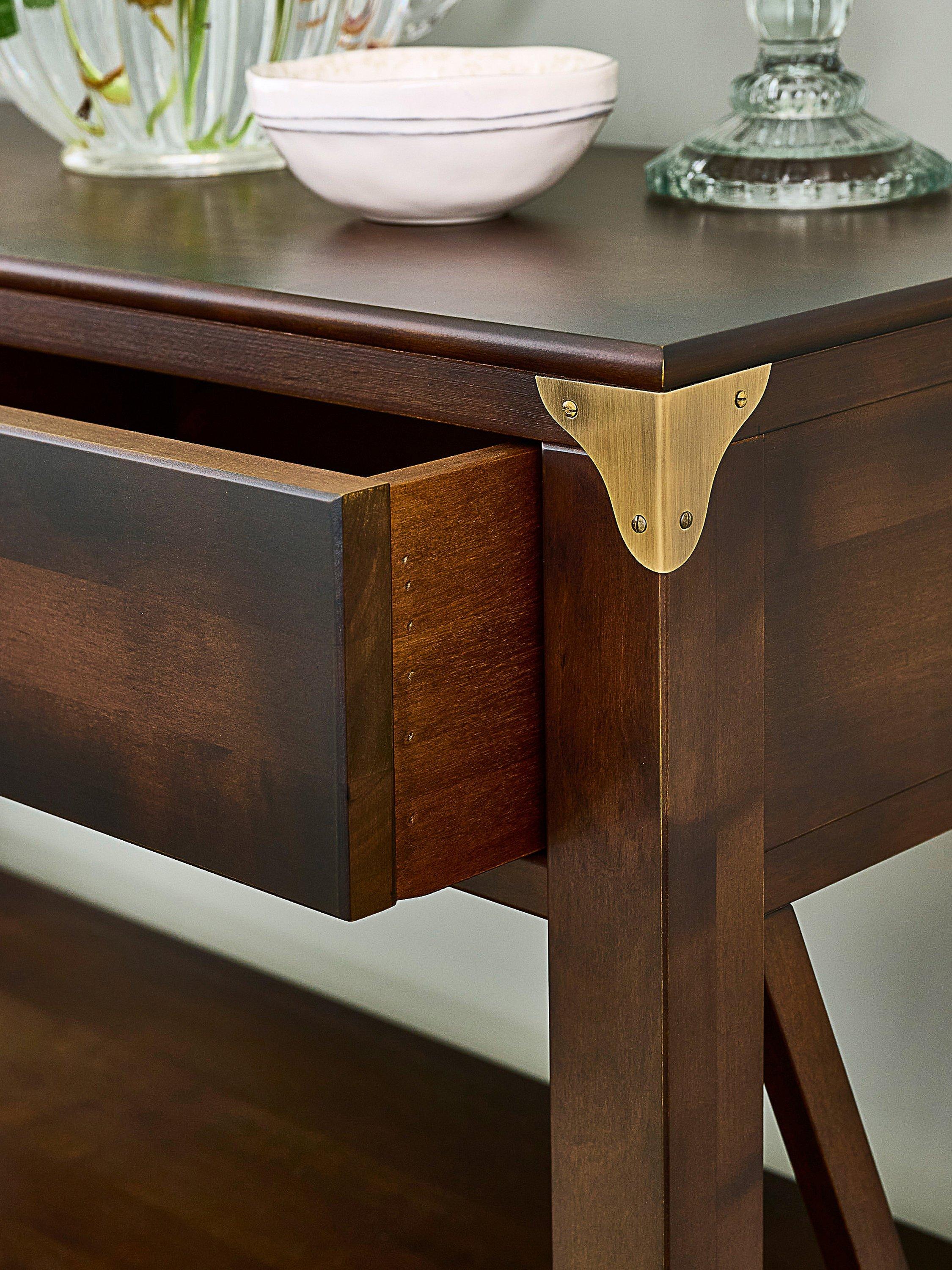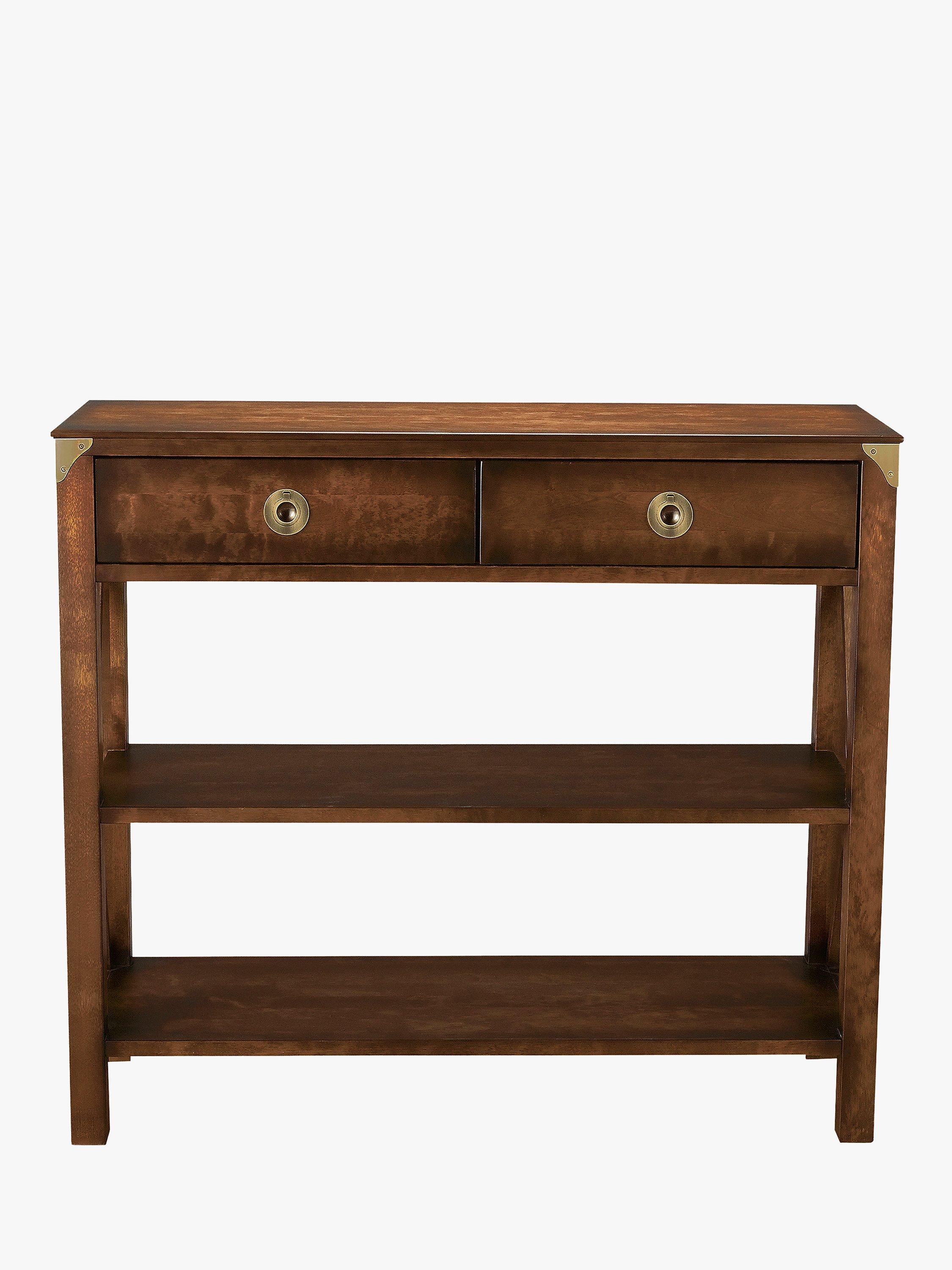 Made from solid birch wood with a hand-applied patina to enhance a warm finish, this console table is designed with two handy drawers and two fixed shelves. While its design may suit traditional interiors, note the cross-over detail on either side of the frame and the accents of antique-brass hardware. These design points give it a retro, Art Deco edge, making it both a distinctive and practical storage option for your home.
