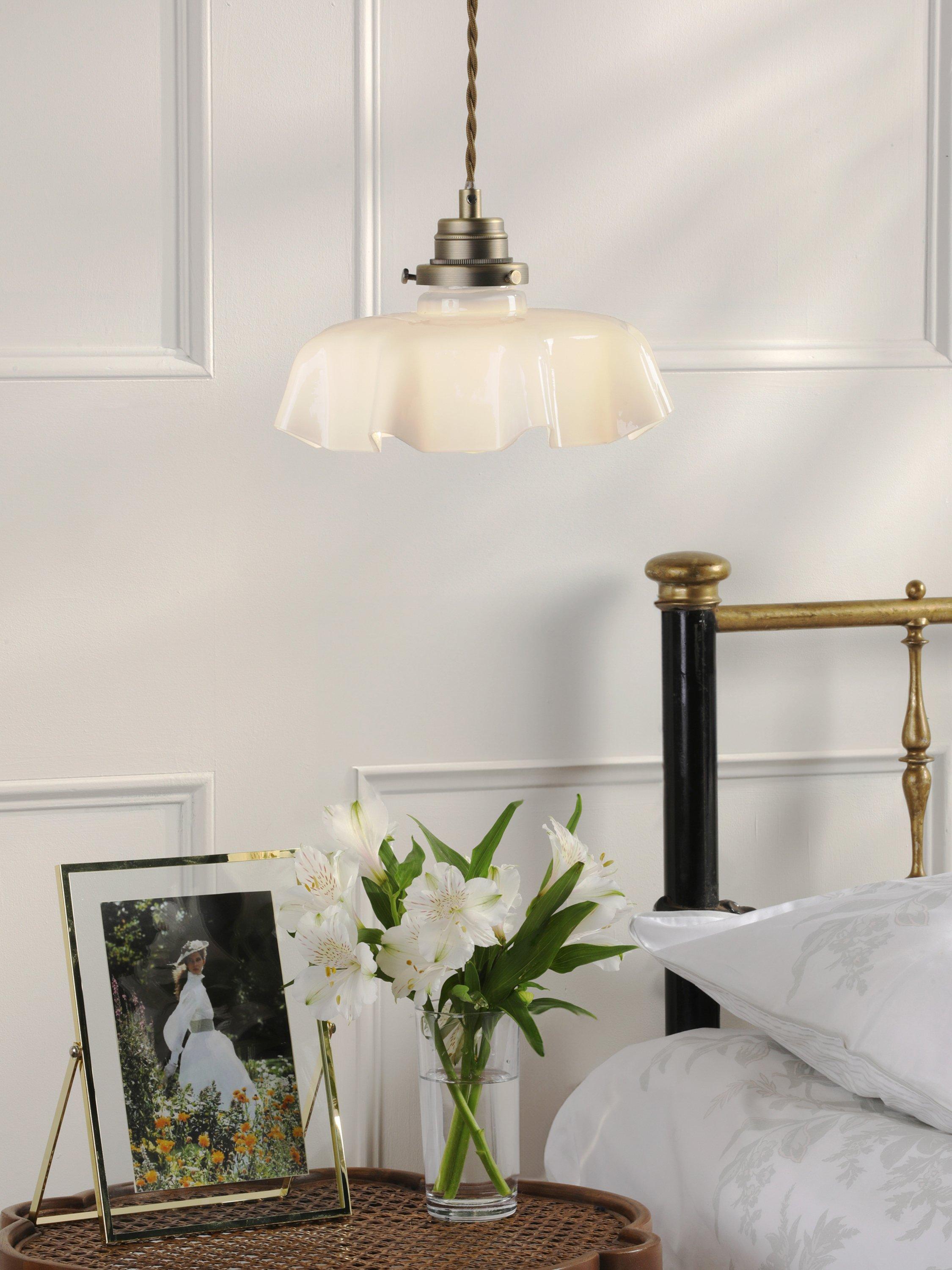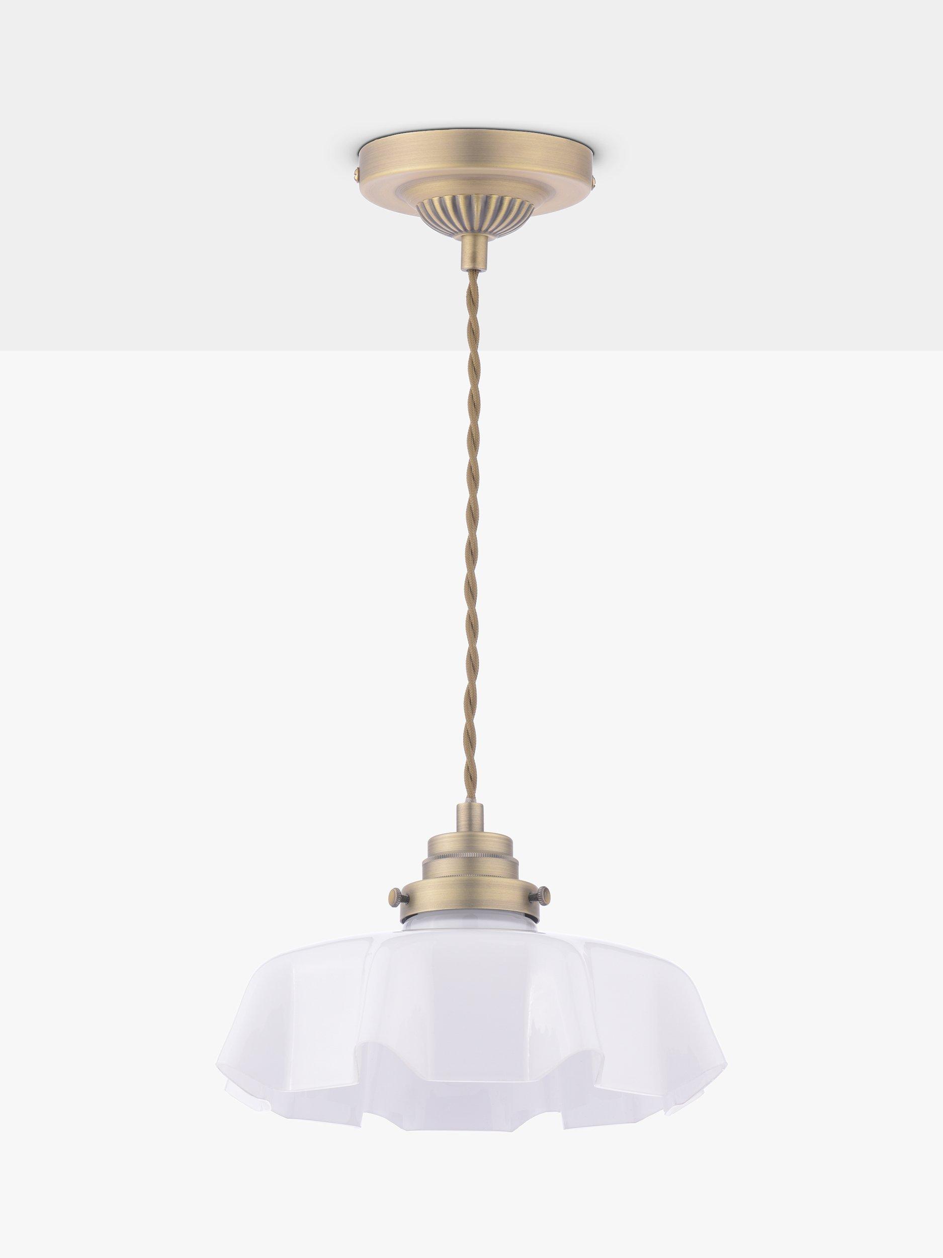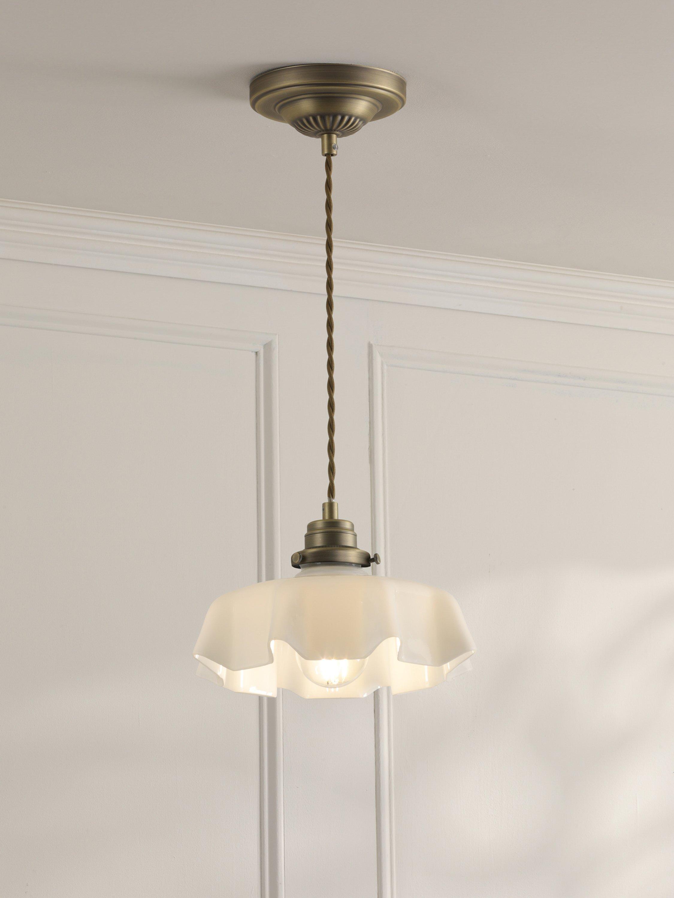 This timeless ceiling light in white fluted glass and antique brass suits most rooms in the house. The Banham pendant light is height-adjustable upon installation and is supported by a twisted cord suspended from a detailed ceiling rose.