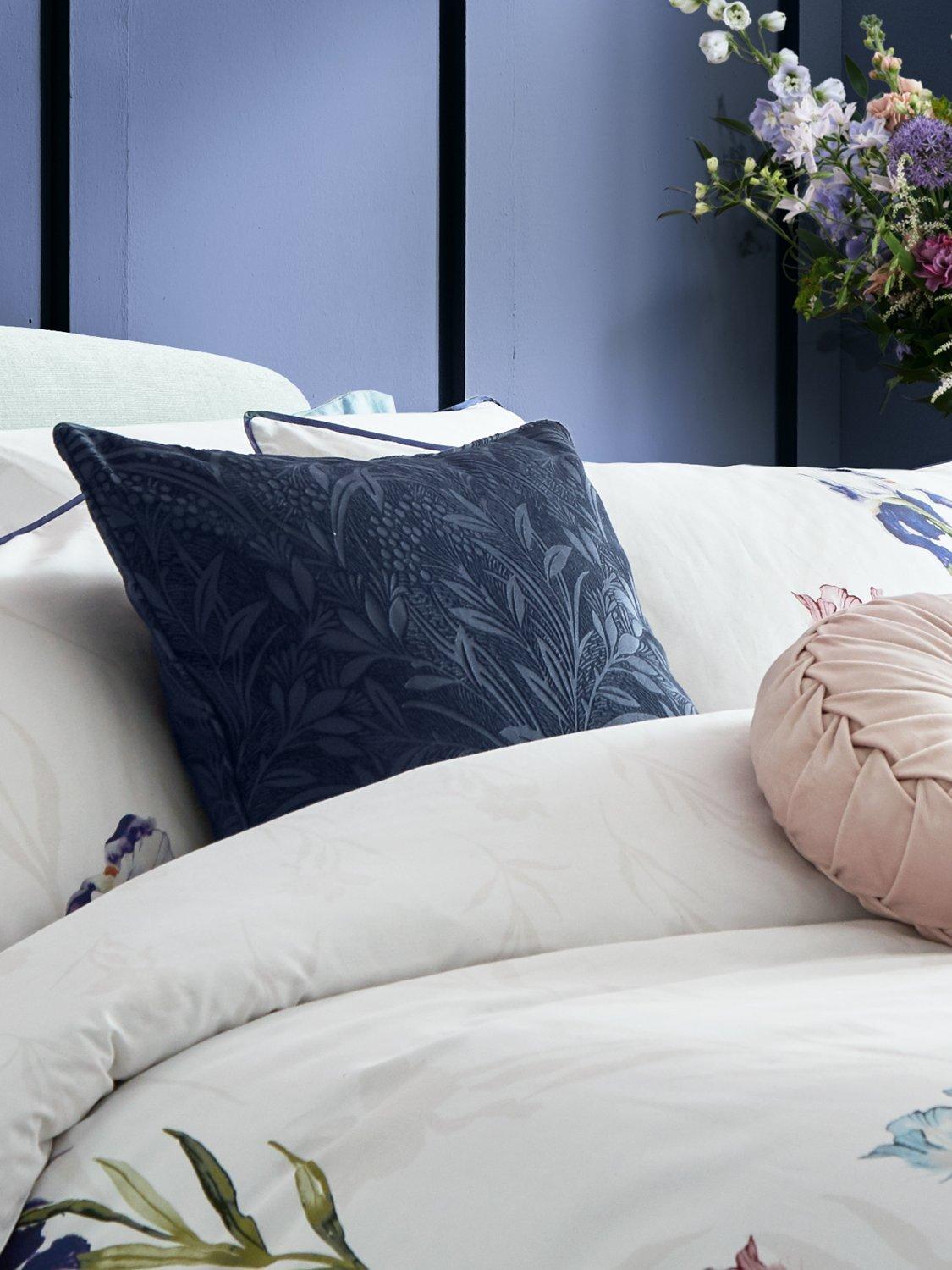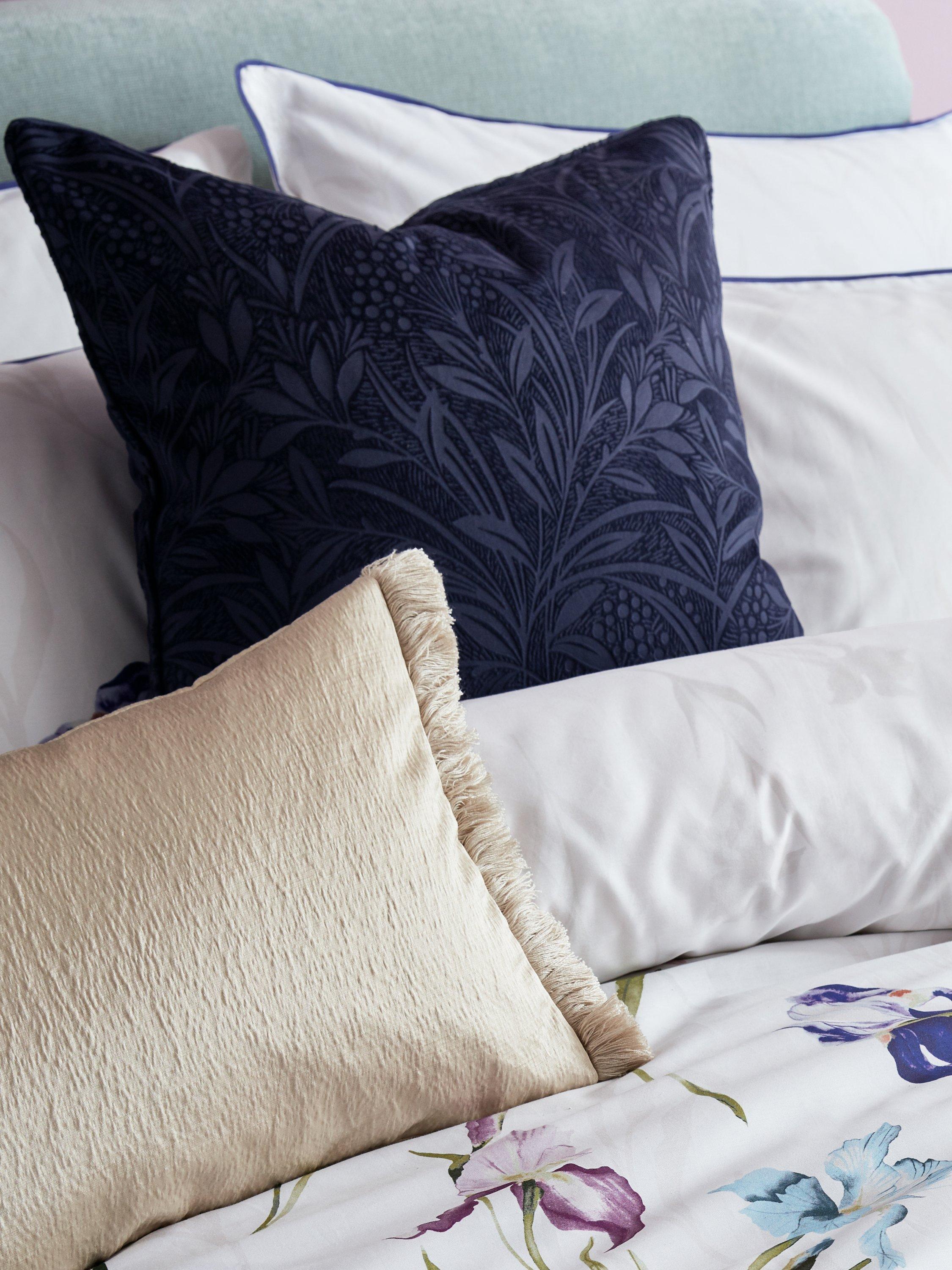 A beautifully embossed velvet cushion featuring delicate sprigs, leaves and foliage on a soft velvet base. Finished with a smart, velvet piping detail.