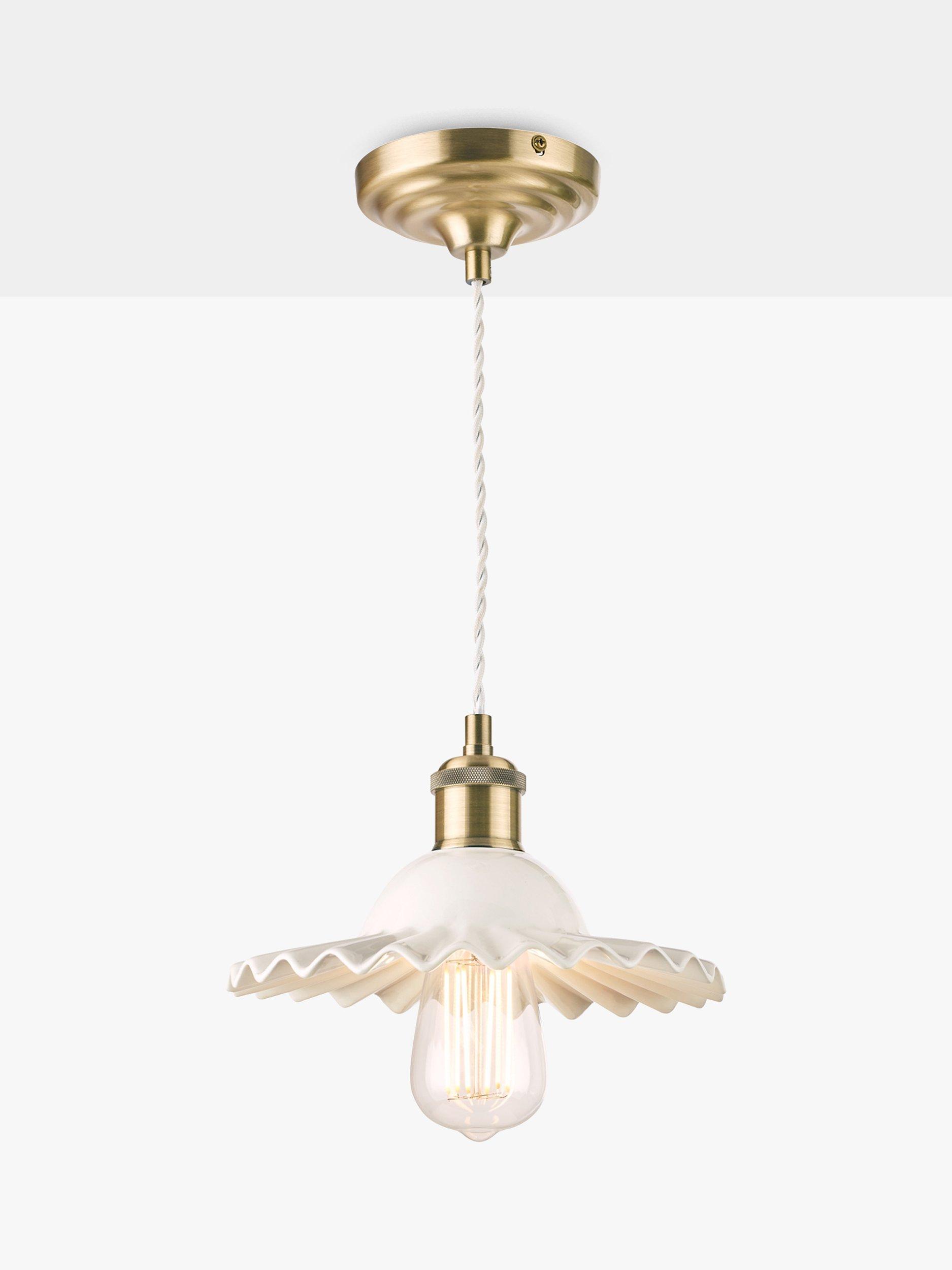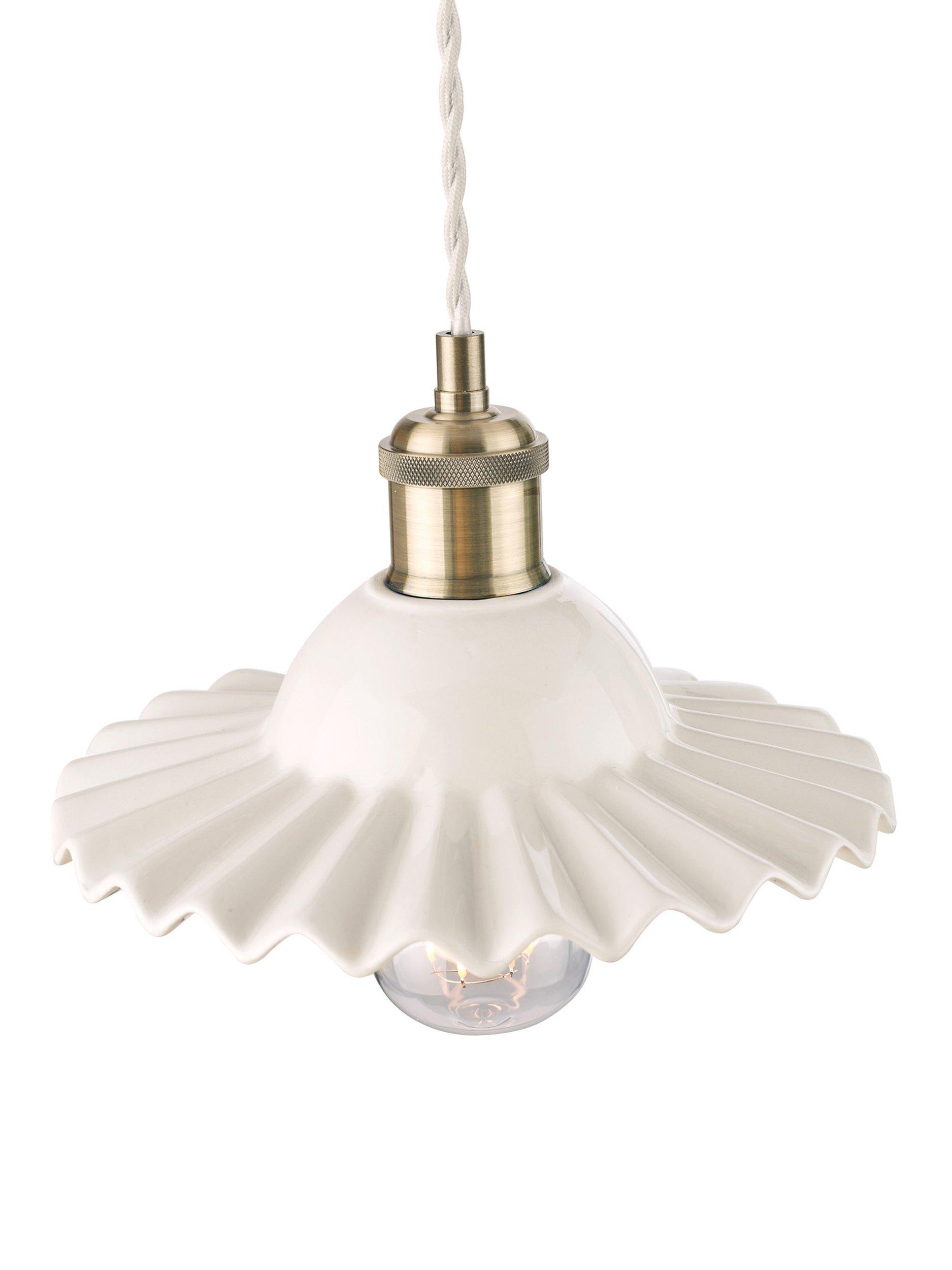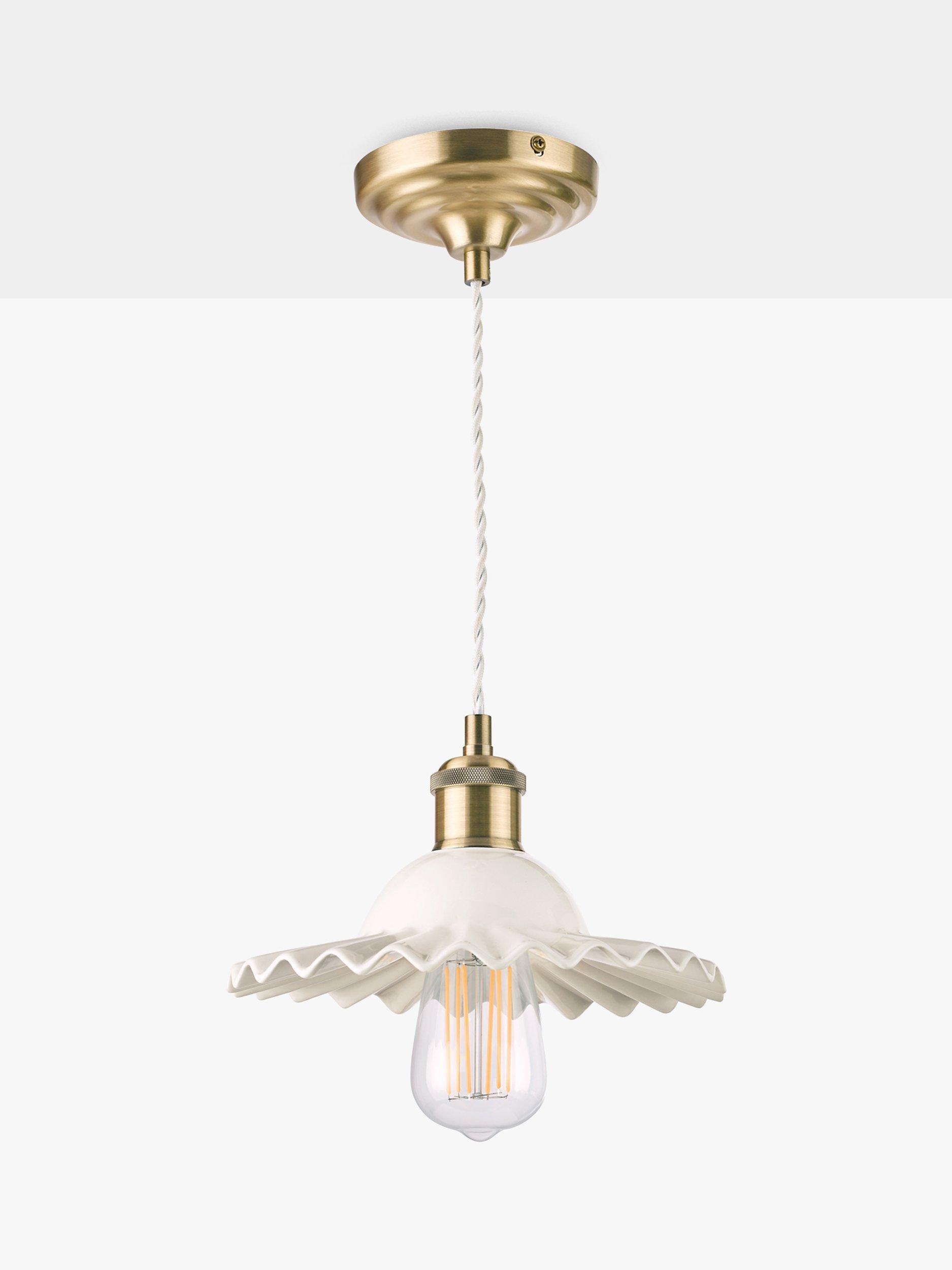 A pretty ceiling light, made from thick ceramic in a gloss-glaze finish. Its shape is reminiscent of a clam shell, with pretty undulations creating light and shadows, and it's accented with antique brass-finished metal fittings. It's height-adjustable at the point of installation and one LED bulb is required. Choose a vintage or rustic bulb with a decorative filament to make it even more eye-catching in your space. Also available in a larger size.