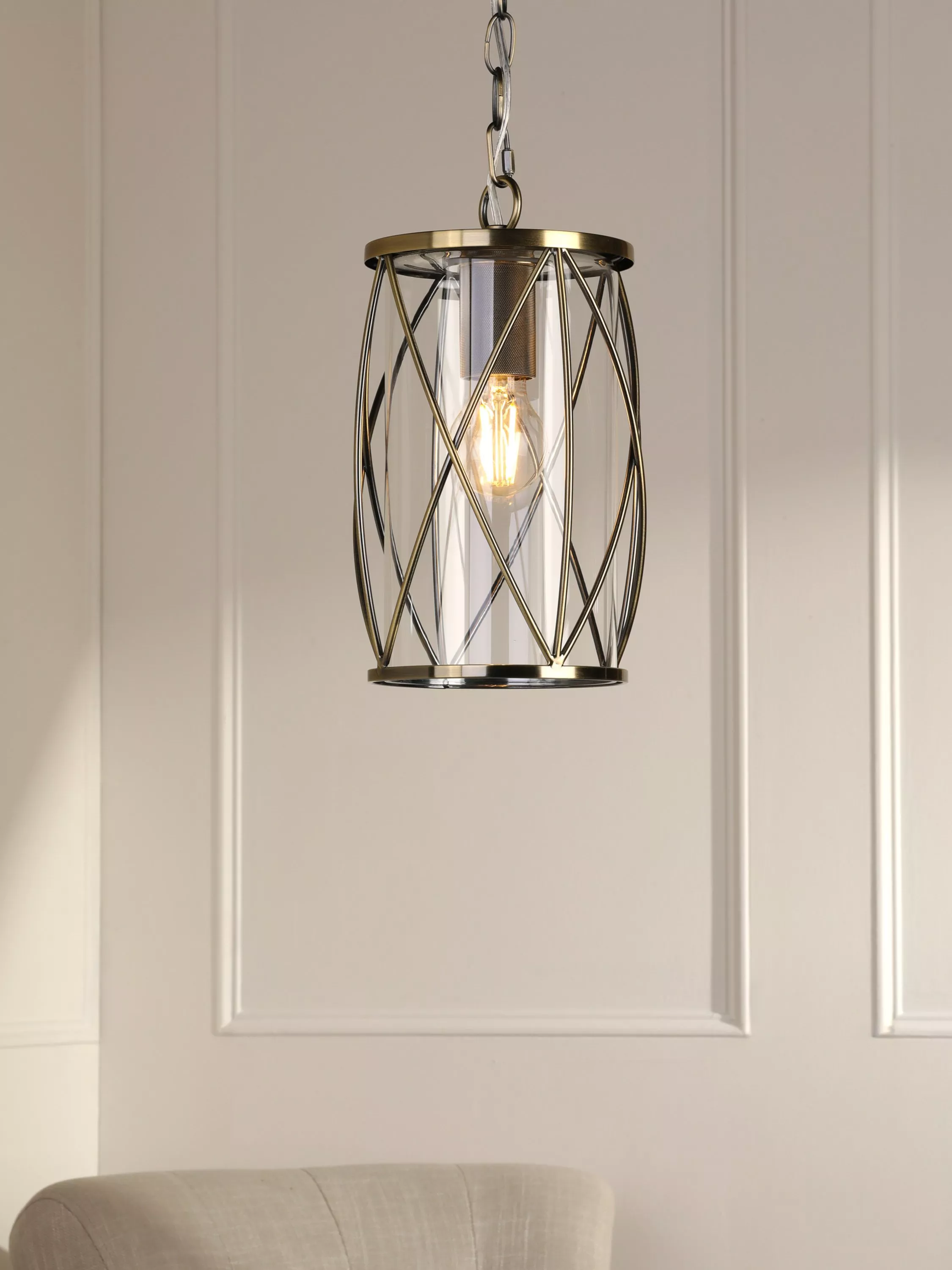 The Laura Ashley Beckworth ceiling light is a large modern pendant in a gorgeous lantern style. A slick, curved lattice in vintage metallic encasing a clear glass cylinder gives this hanging ceiling light a contemporary style that enhances any interior theme.