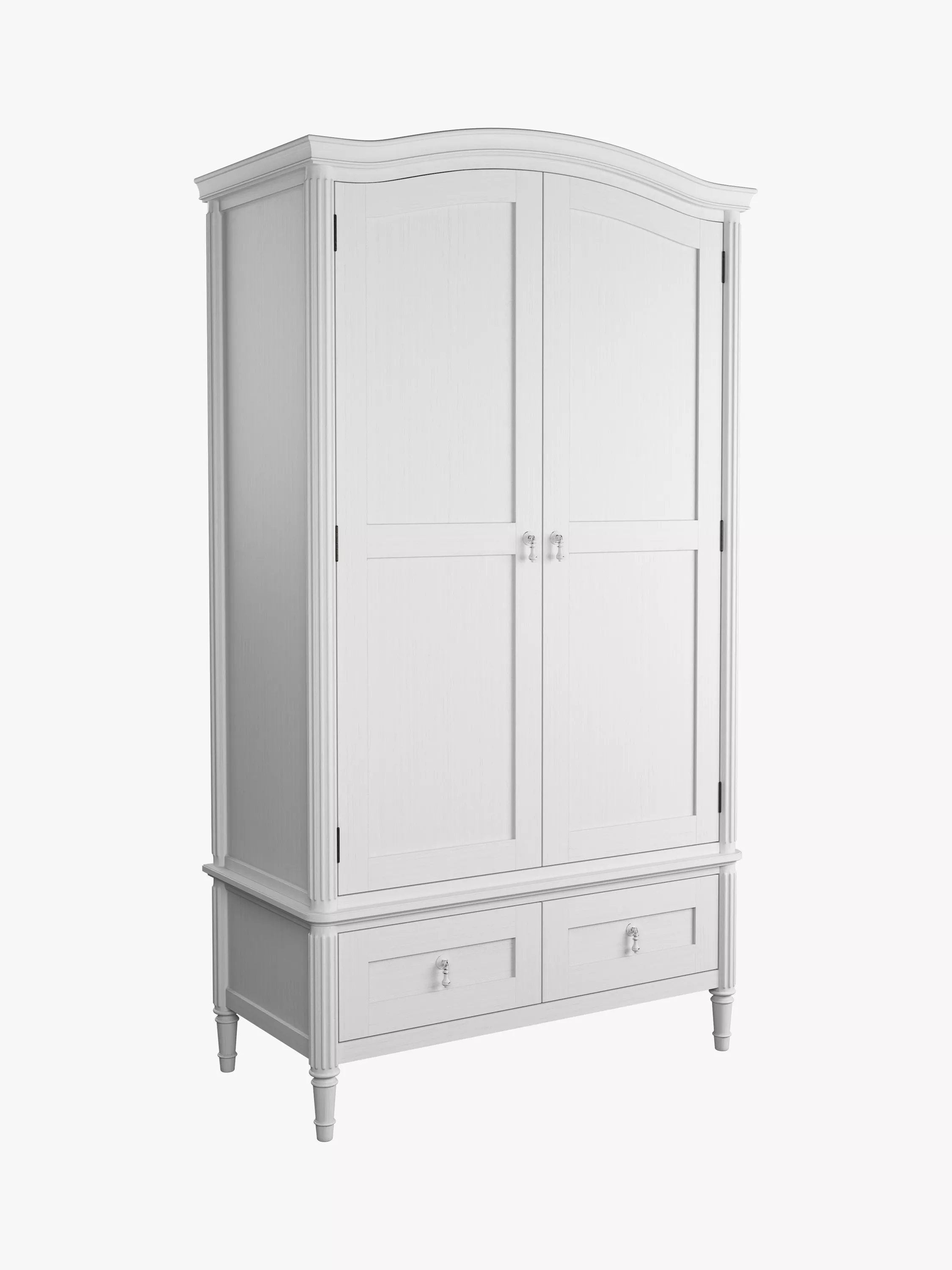 This wardrobe will hold a grand presence in your bedroom. There's plenty of storage space available: behind the panelled doors there's an adjustable hanging rail and shelf, and there's also two separate deep drawers. Design details include distinctive reeding, a curved and ornately moulded cornice and a washed painted finish that subtly reveals the grain of the hardwood beneath. Plus, the distressed droplet handles complete the illusion of an heirloom piece from an earlier time.