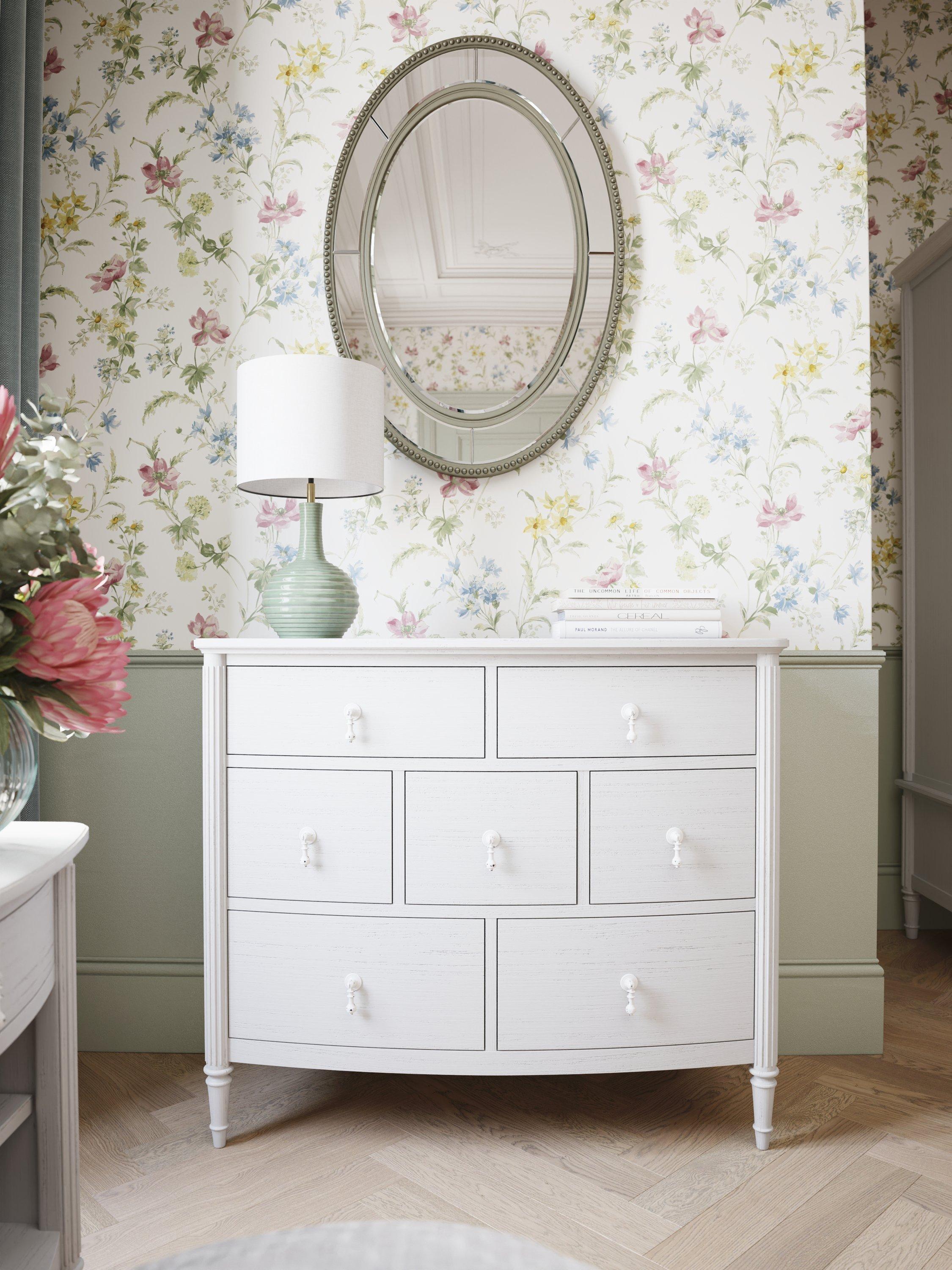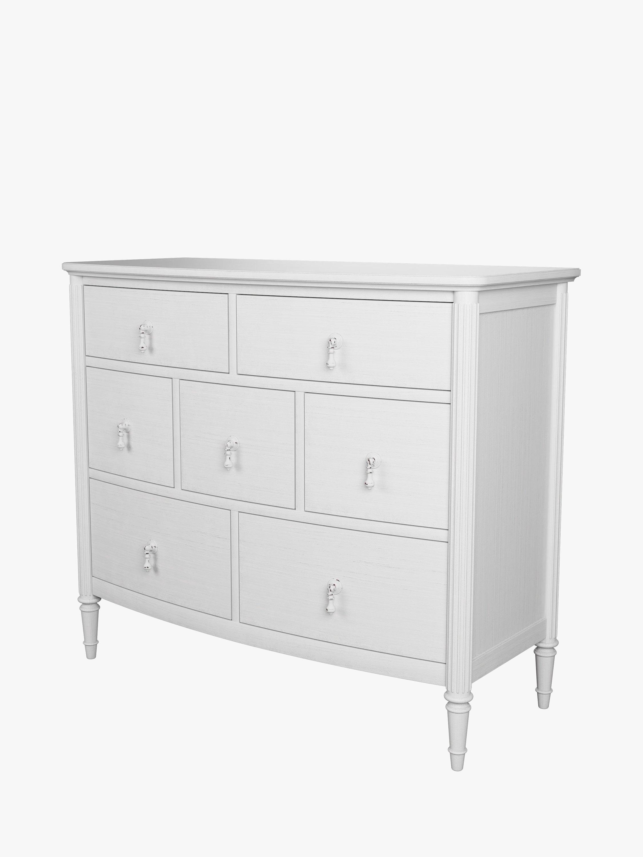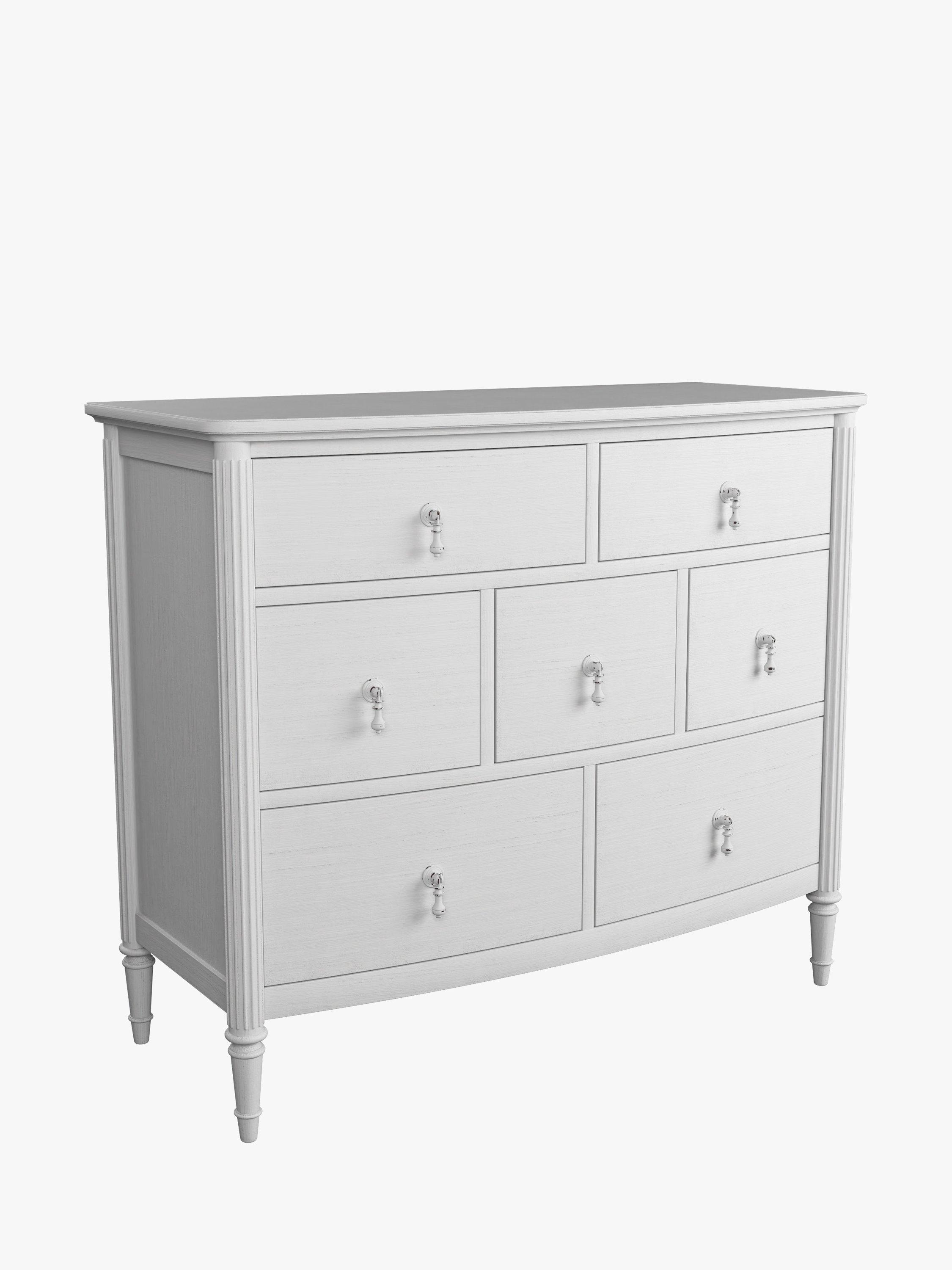 Designed with a slightly bowed front and plenty of storage space thanks to seven drawers in total, this chest will hold an elegant place in your bedroom. Design details include: decorative reeding on the frame and turned legs, and its washed painted finish subtly reveals the grain of the hardwood beneath. Plus, the distressed droplet handles complete the illusion of an heirloom piece from an earlier time.