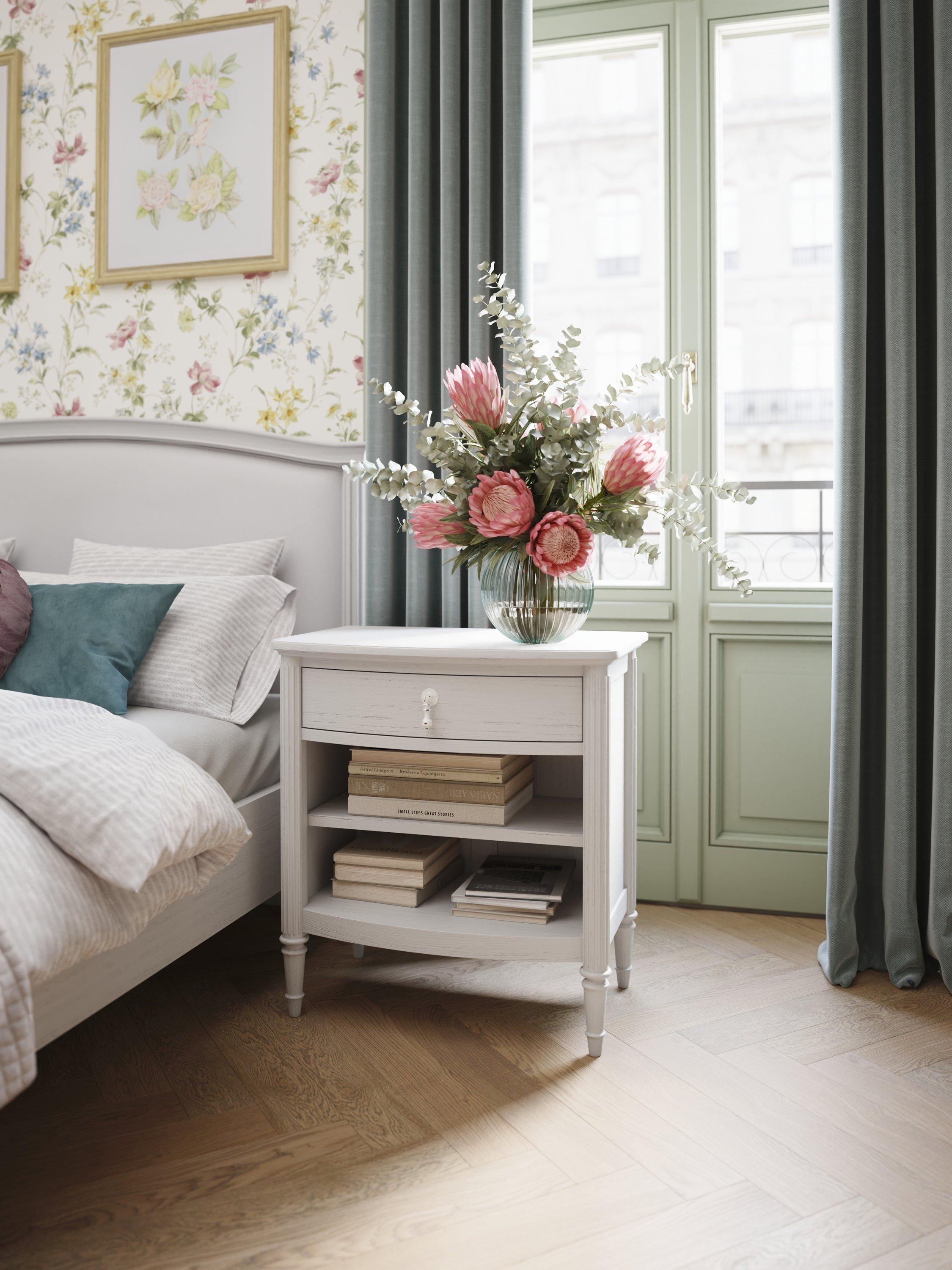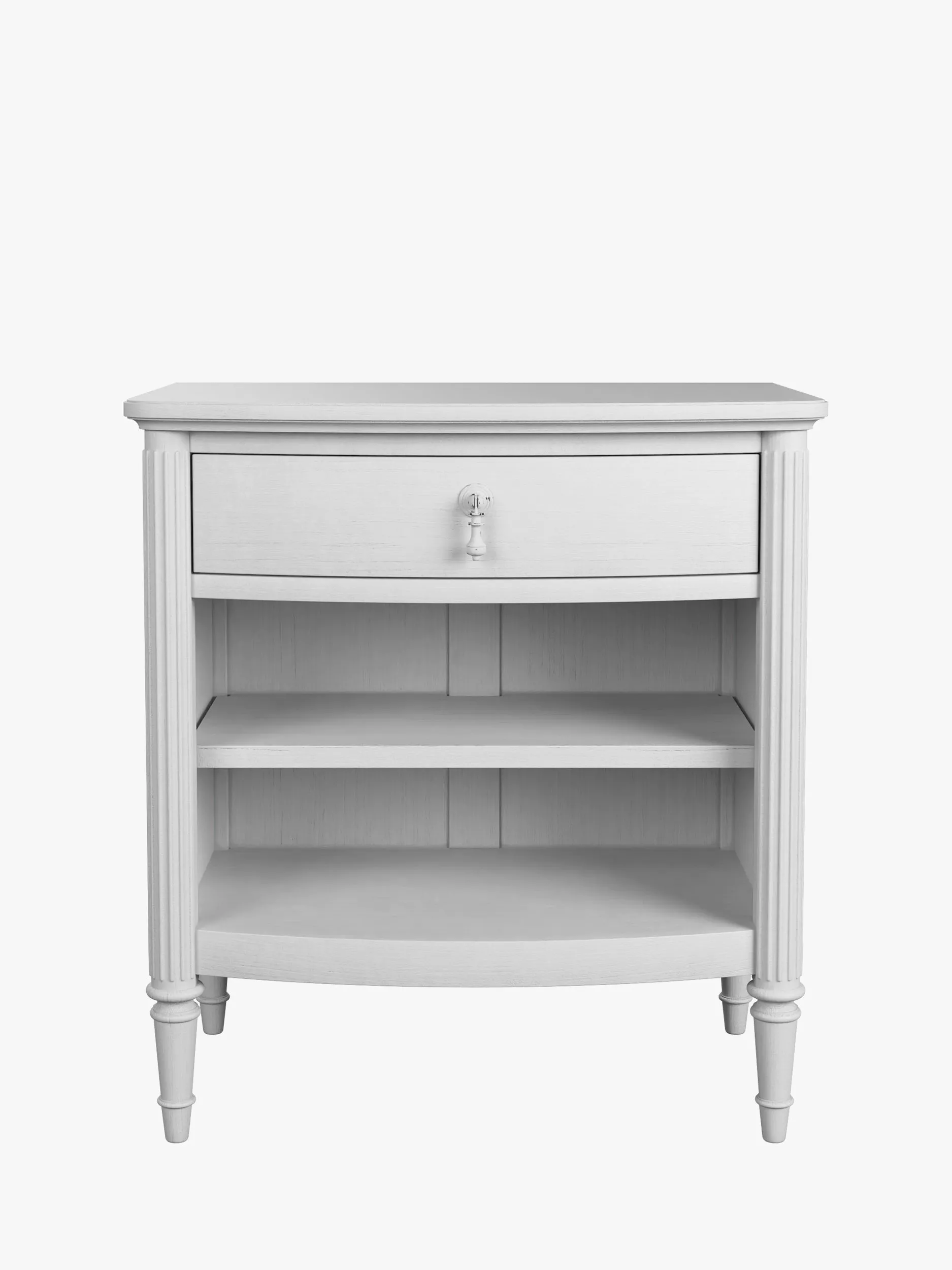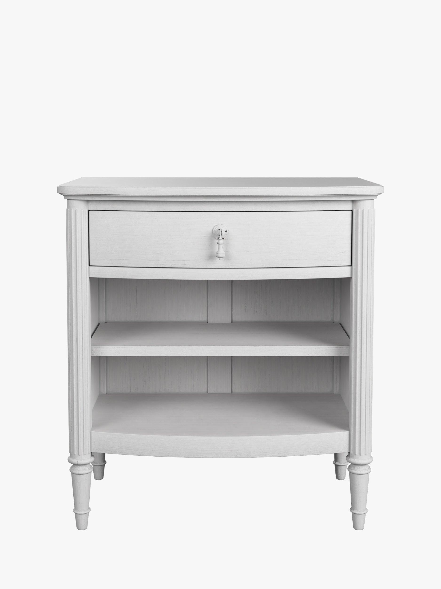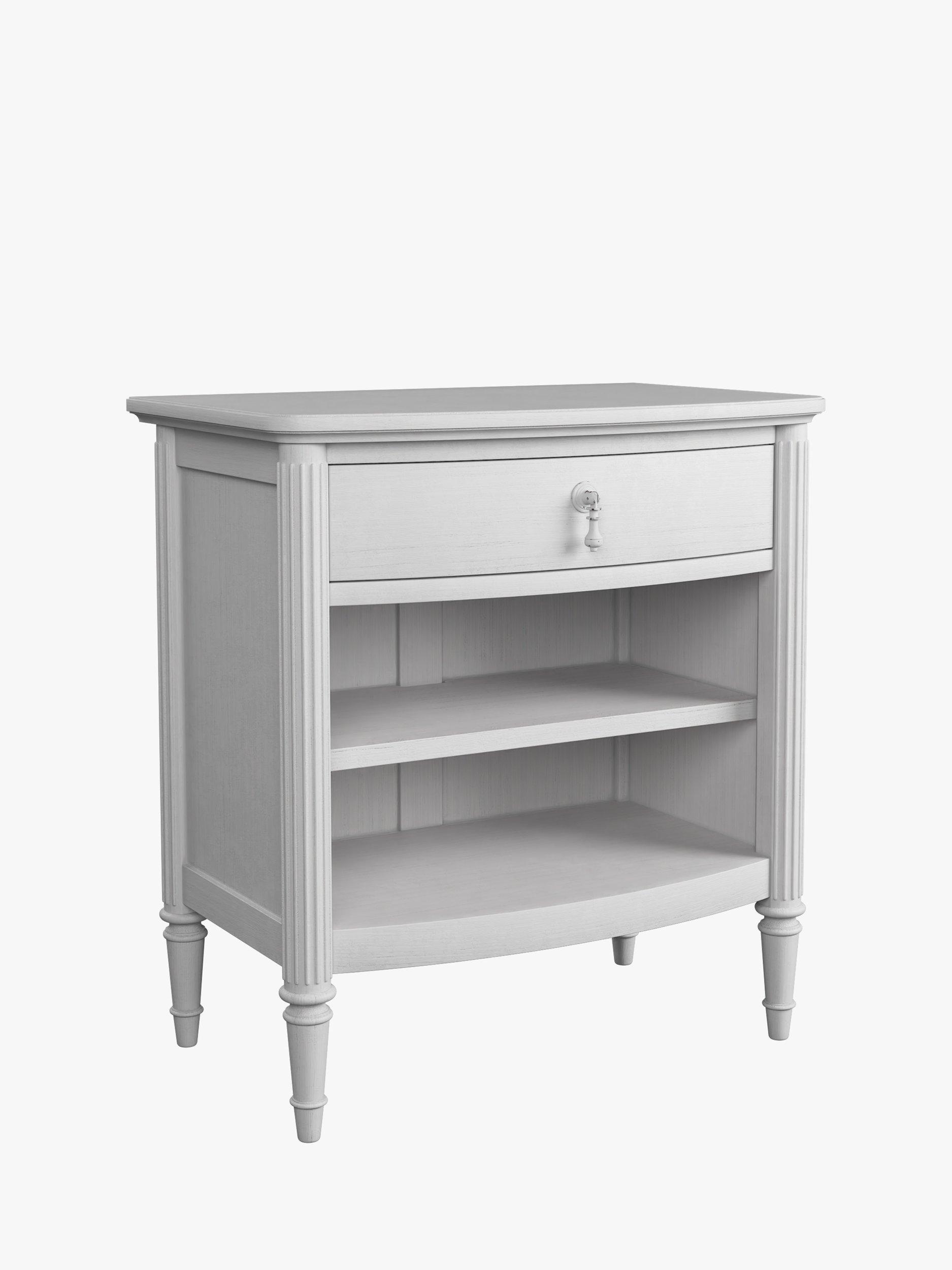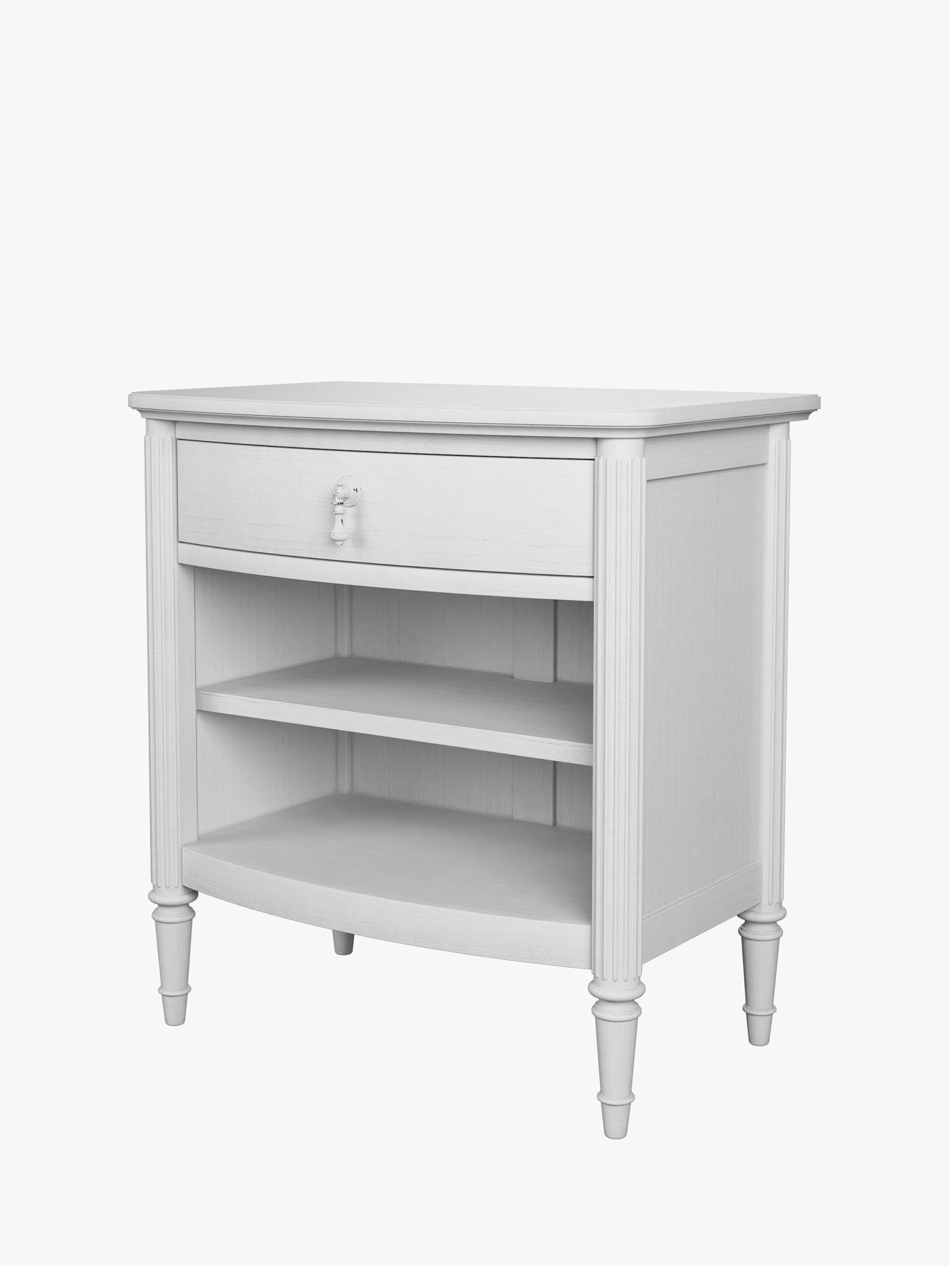 Designed with a slightly bowed front and useful storage options thanks to a drawer and open shelving, this is a distinctive and practical bedside table. Design details include: decorative reeding on the frame and turned legs, and its washed painted finish subtly reveals the grain of the hardwood beneath. Plus, the distressed droplet handle completes the illusion of an heirloom piece from an earlier time.
