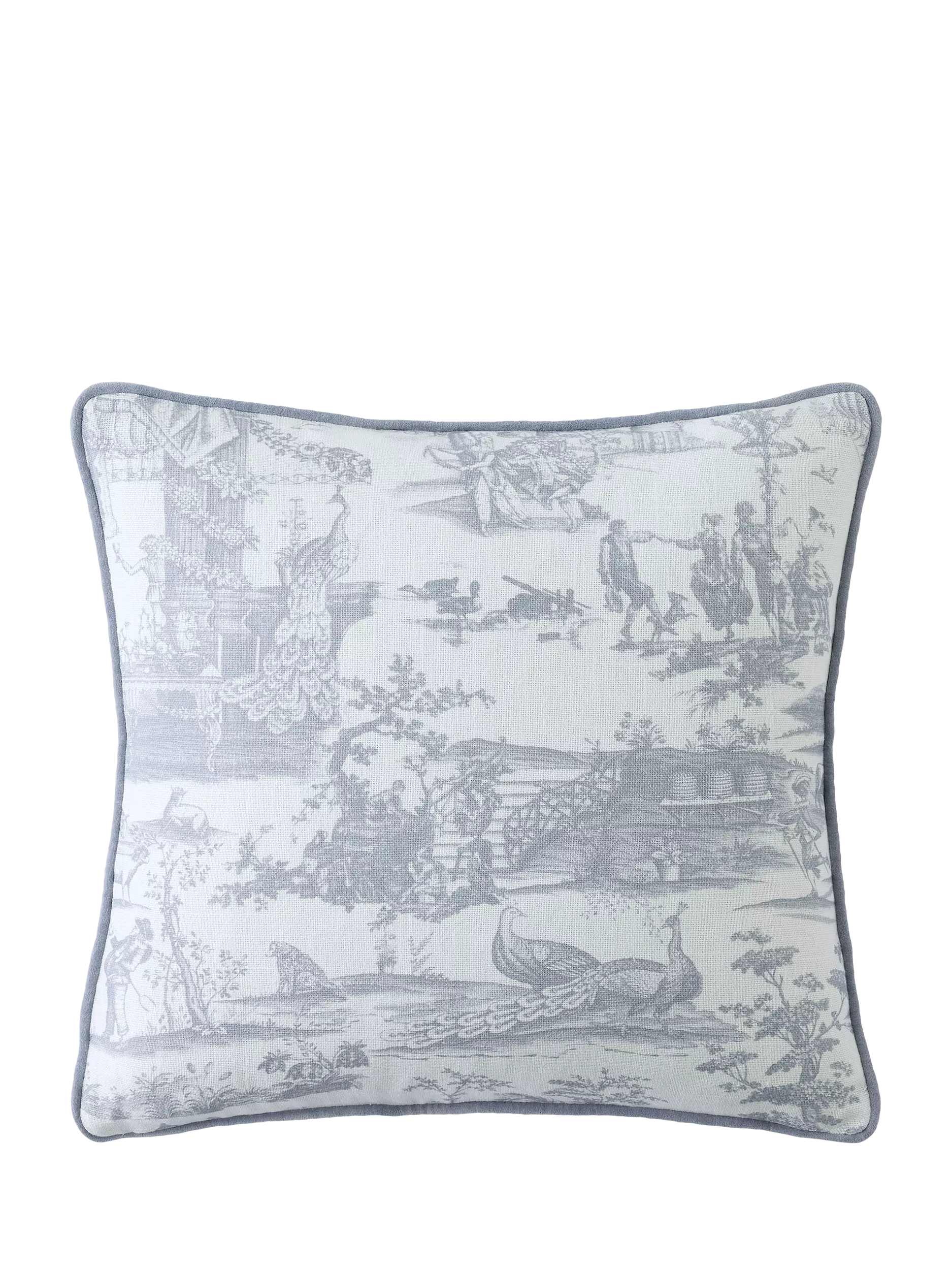 Inspired by various toiles from 1994, in the Laura Ashley archive, this typical late 18th century French landscape print depicts a beautiful country scene with dancers and wandering peacocks and sheep.