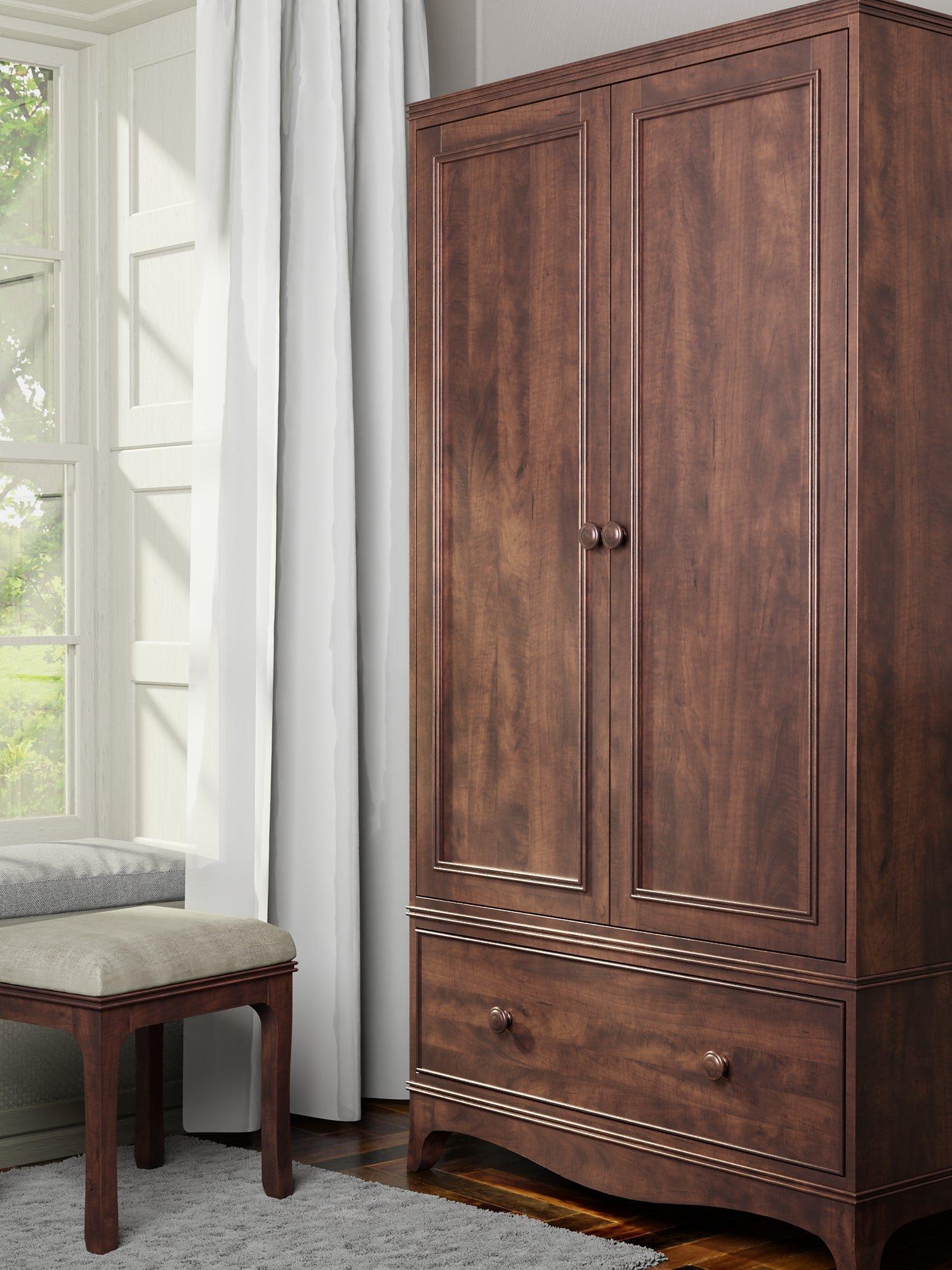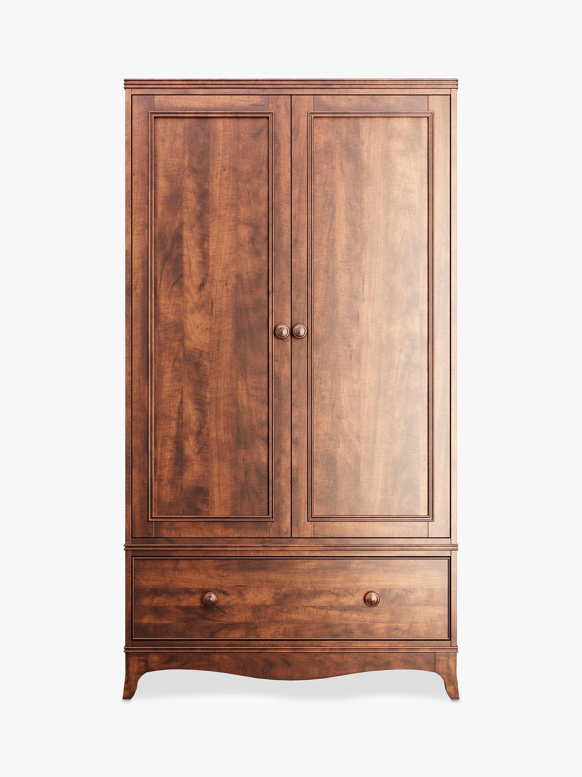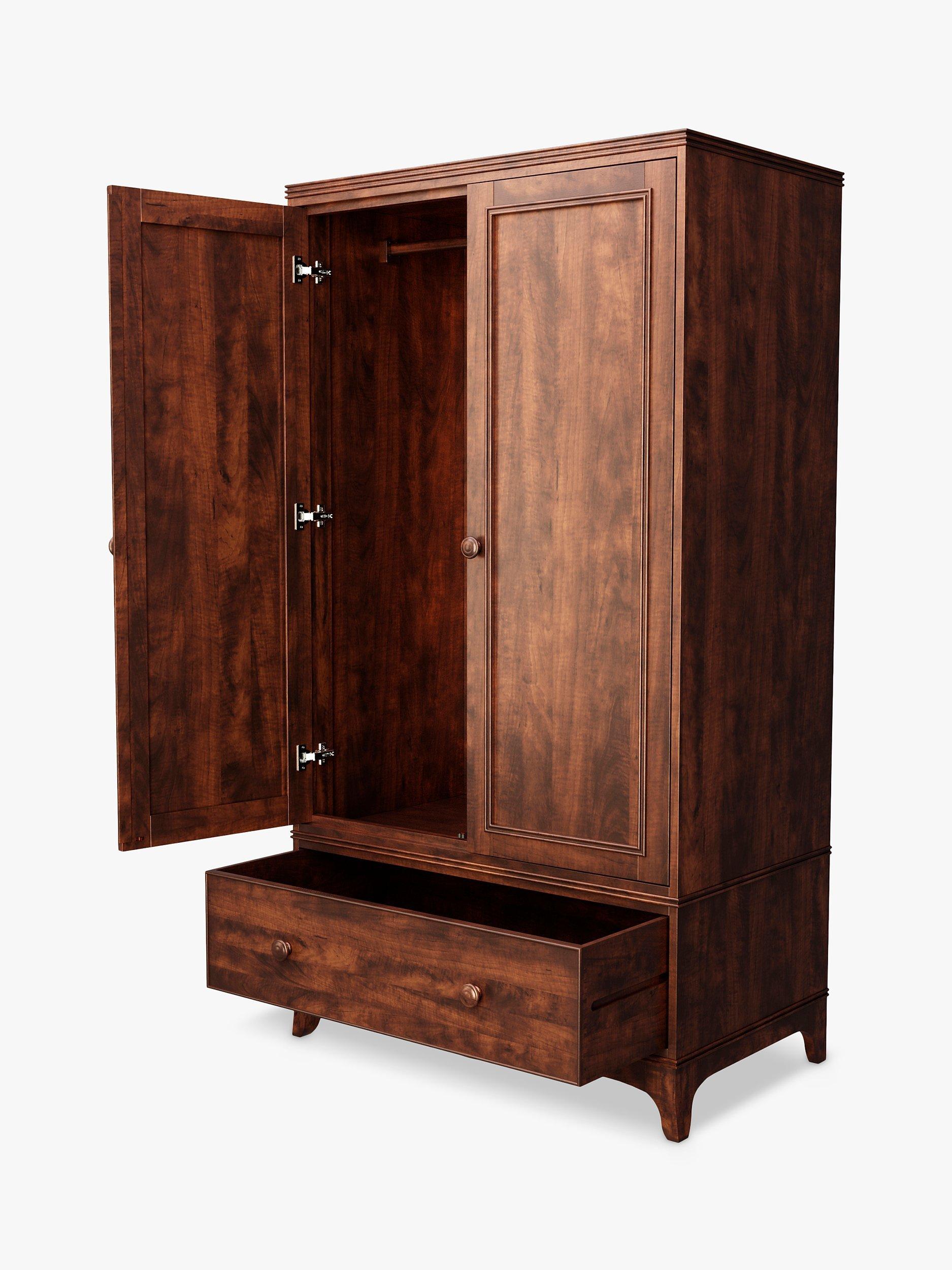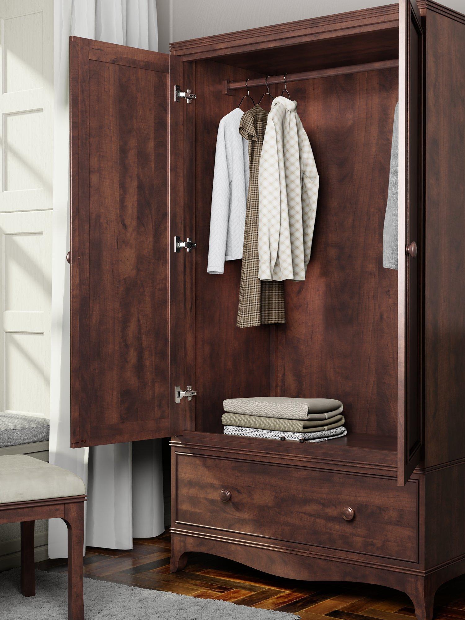 Bedroom storage with a stately edge. Crafted from solid birch wood with high-quality birch veneers, this double wardrobe is made with strong dovetail joints and earns design points for Georgian curves, turned wood details and panelling on front of the doors and drawer. It's finished in a low maintenance lacquer and there's a hanging rail inside, as well as a deep storage drawer.