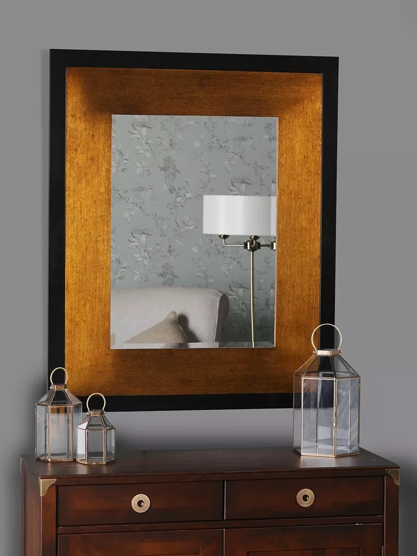 Large, contemporary rectangular mirror from Laura Ashley. Cara has a deep, smooth frame with a mottled bronze-effect painted finish, edged in black. This striking wall mirror is mounted on a sturdy board backing, painted black.