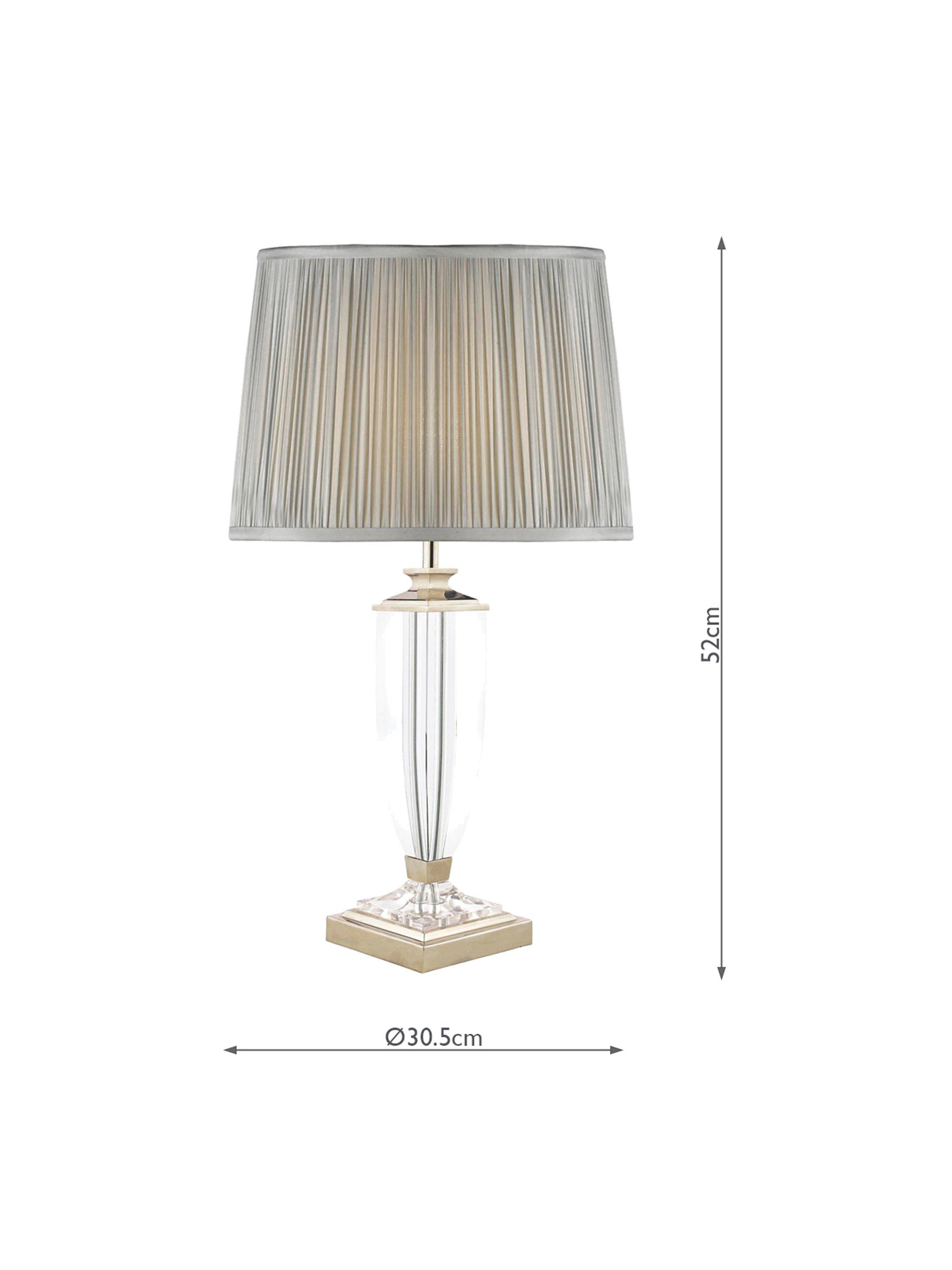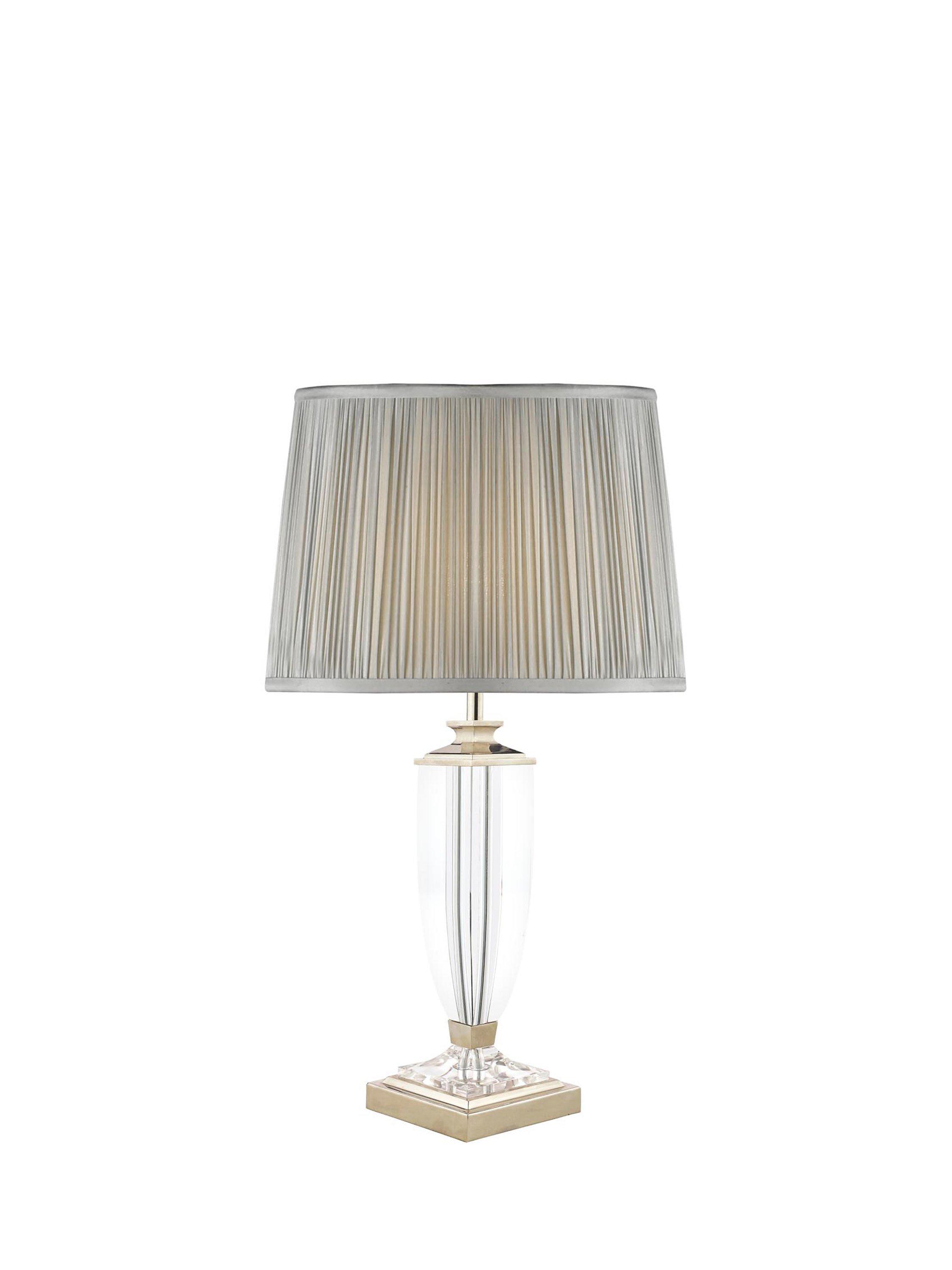 The Laura Ashley Carson table lamp is grand in design but delicate in style, this tall table lamp features a clear, cut crystal base which has been hand-polished to create a smooth surface. Supported by a sturdy square metal base that supports the column-shaped frame, it honours the design of a slender, classical vase. This handsome table lamp features a warm polished nickel finish and is paired with the Laura Ashley Hemsley pleated silk shade, finished in sage green and creates a warm glow of light