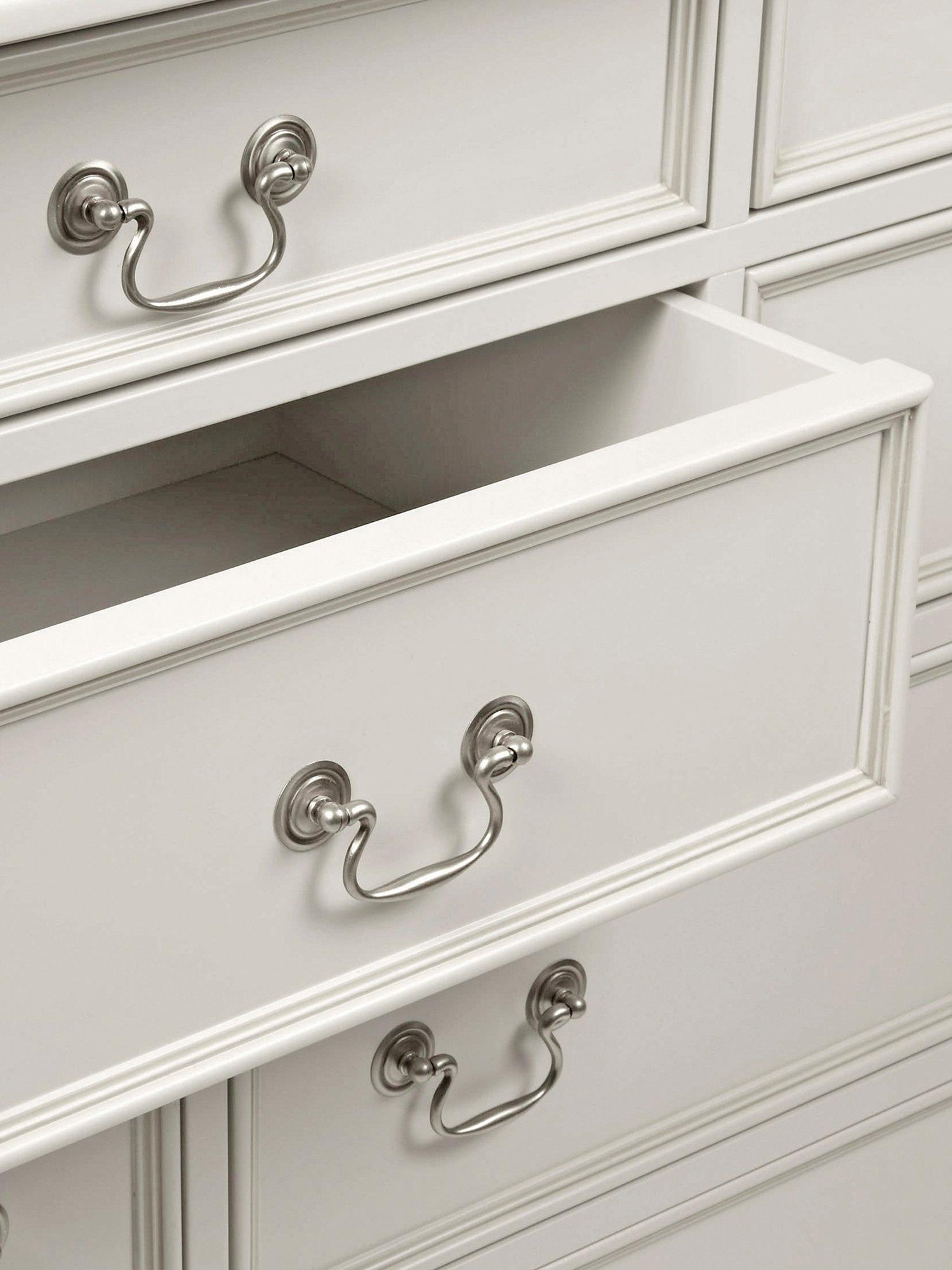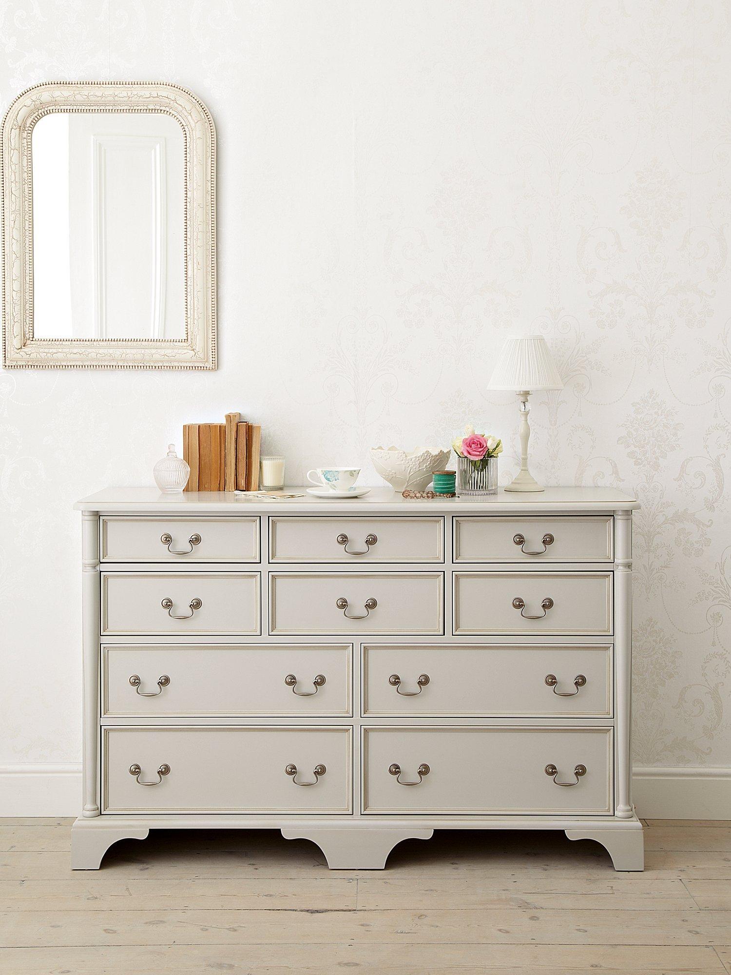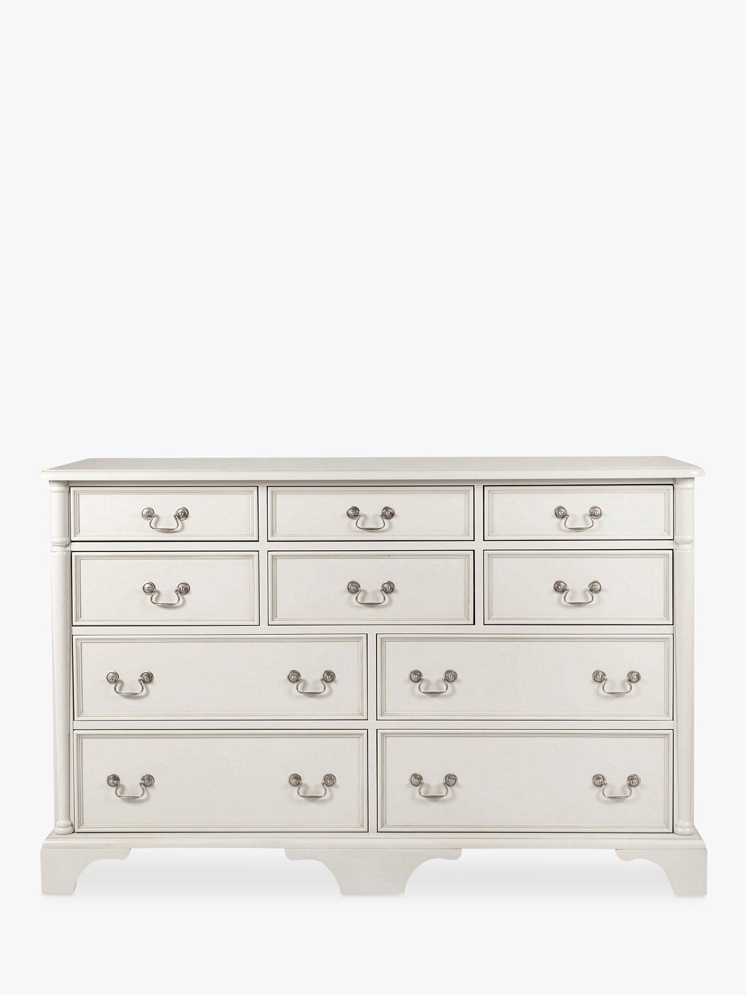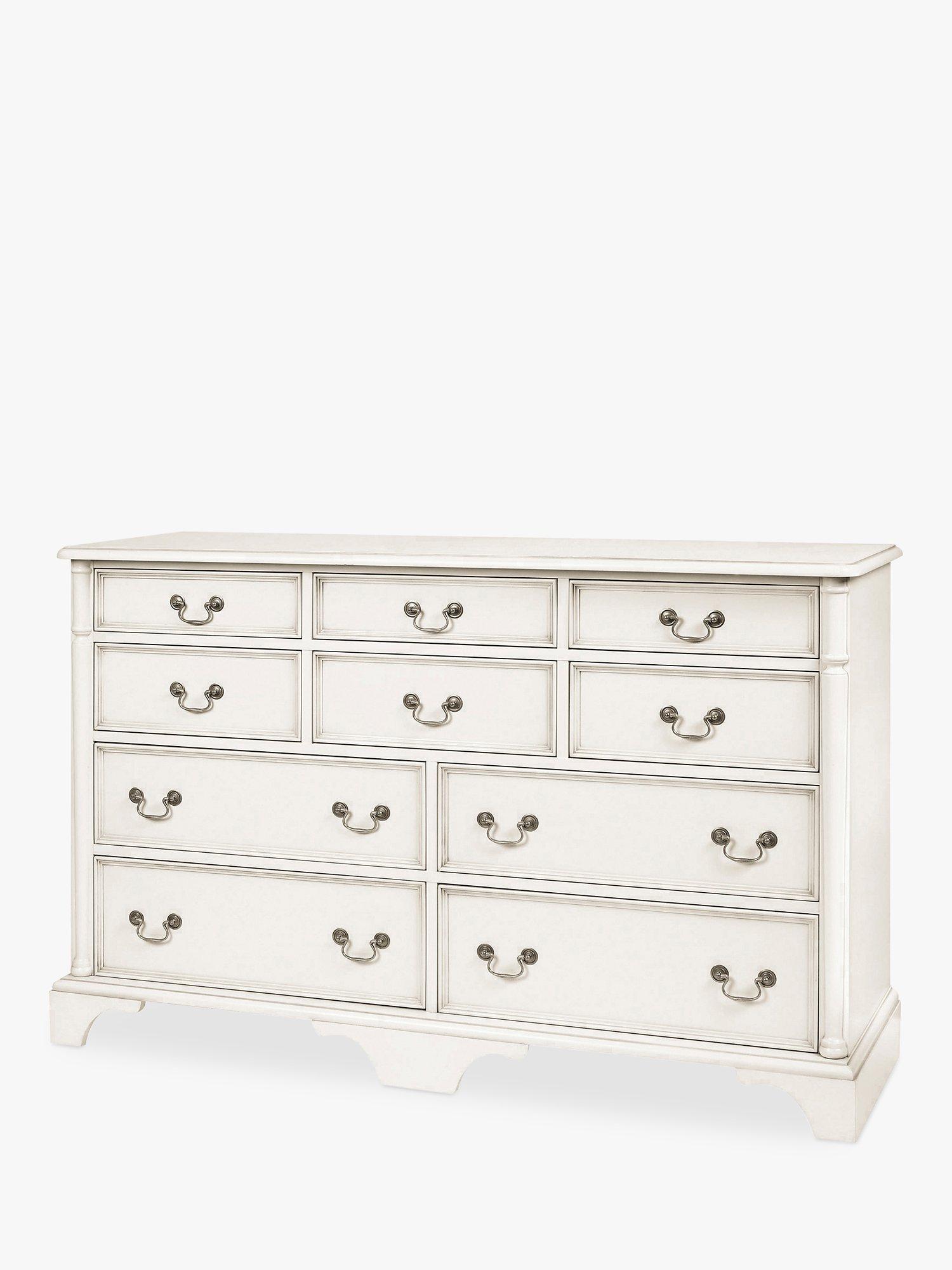 Turned wooden legs and panelling detail honours the timeless aesthetic of this chest of drawers, which is made from sturdy timbers. There's plenty of storage space thanks to a total of 10 drawers and its antique-style handles enhances its traditional look. It's painted and finished with a hand-applied patina to create an aged effect, as well as a protective lacquer.
