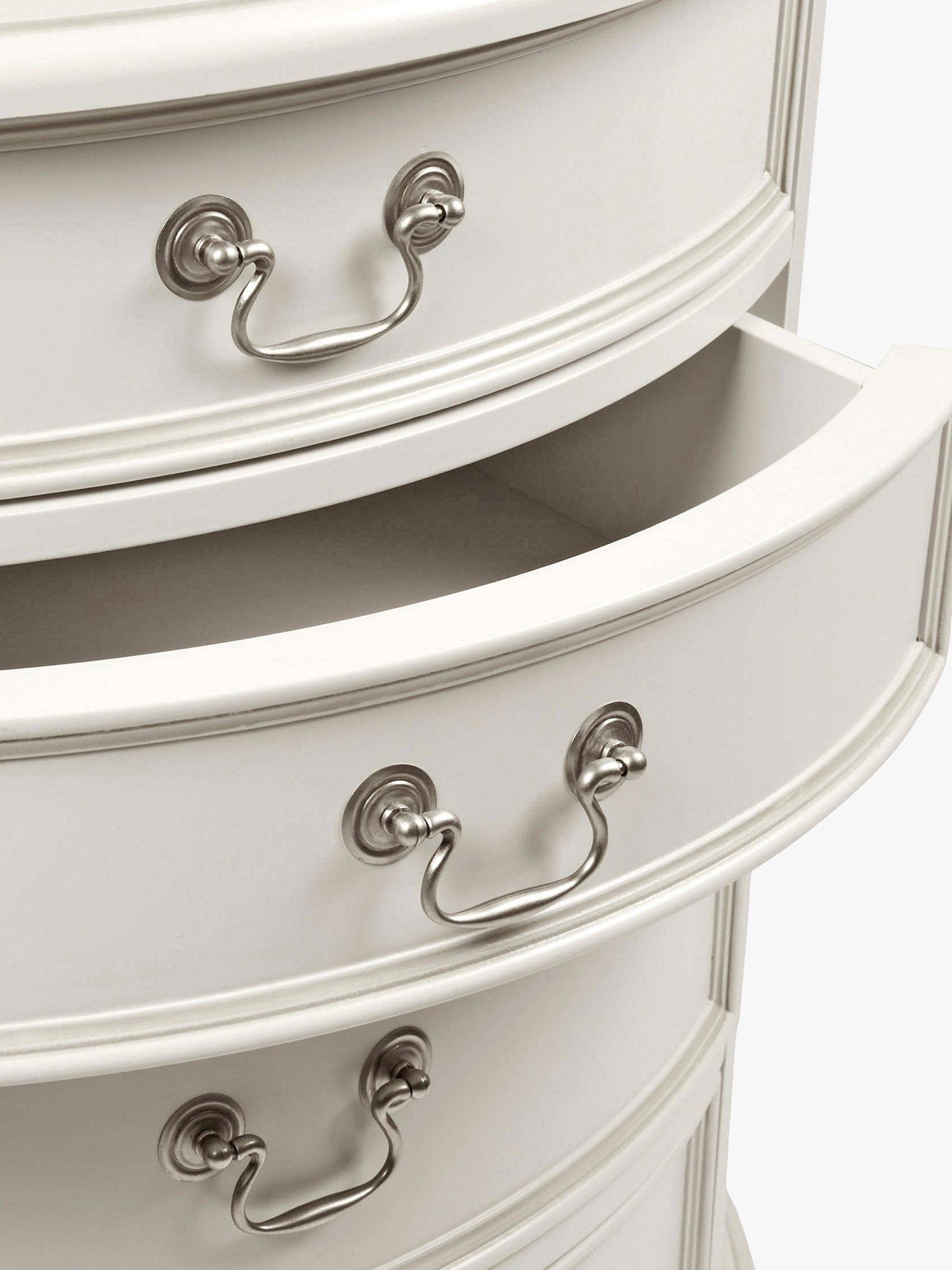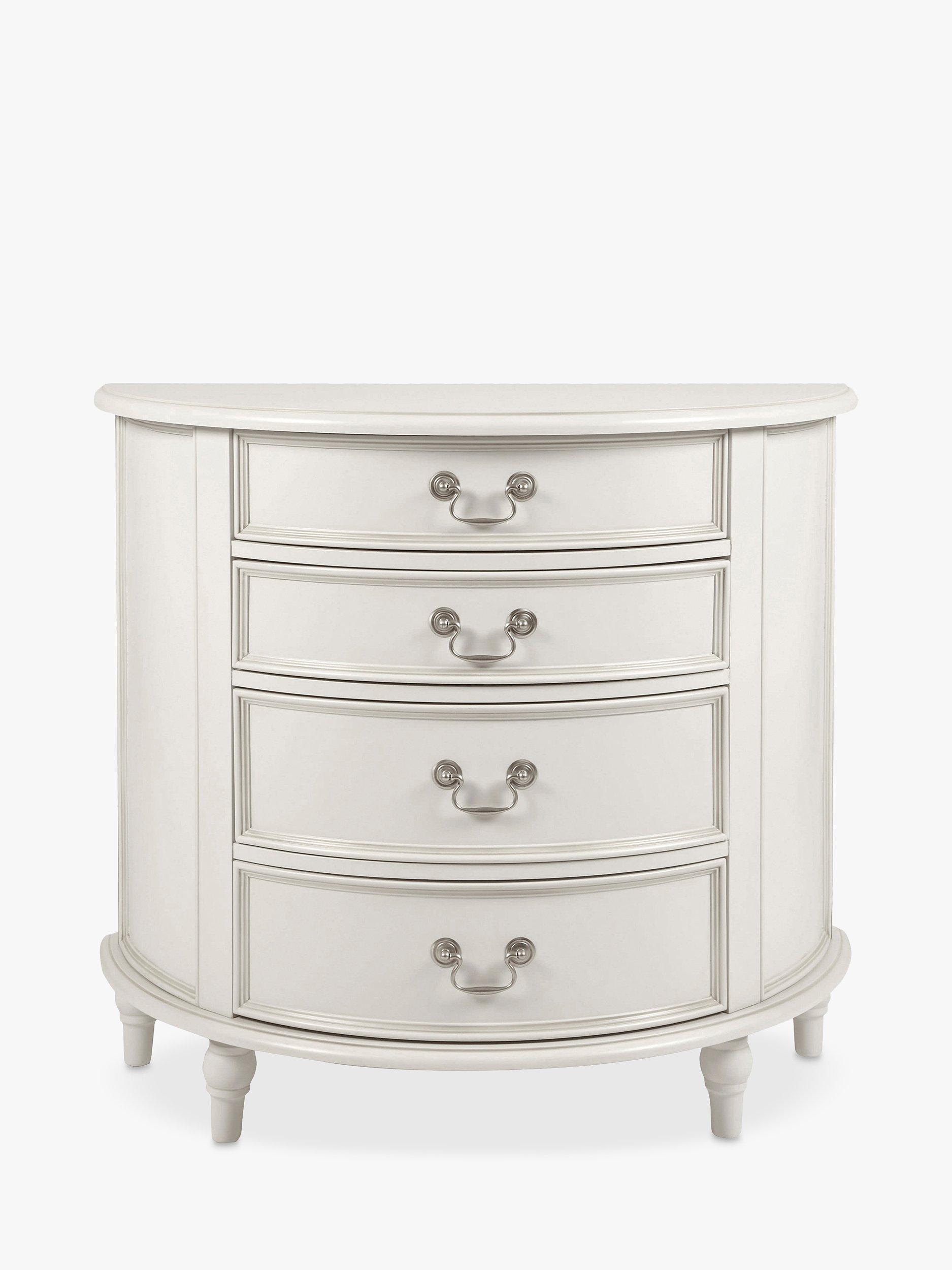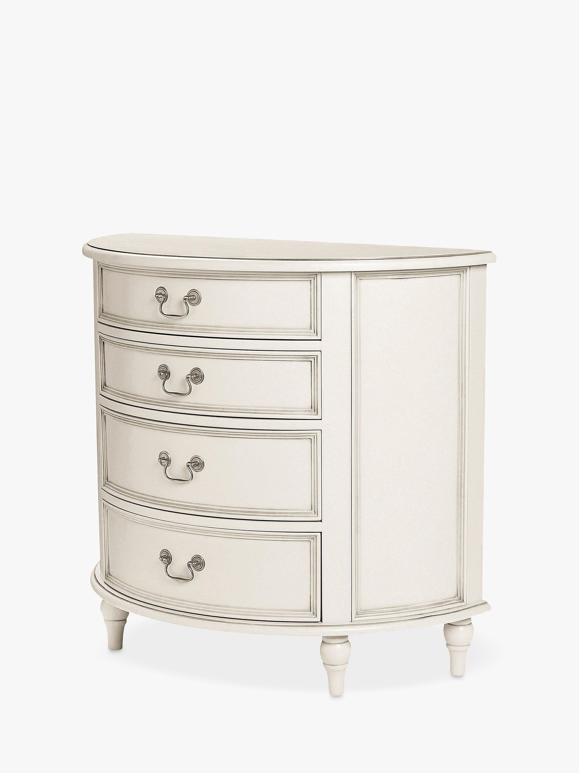 Turned wooden legs and panelling detail honours the timeless aesthetic of this chest of drawers, which is made from sturdy timbers and can also double up as a bedside table. Painted and finished with a hand-applied patina to create an aged effect, its curved, semi-circle shape and four drawers makes it well-suited in rooms which are tight on space and there's plenty of storage for your bits and bobs. The drawers gradually increase in depth and they're accented with antique-style handles for a traditional finish.
