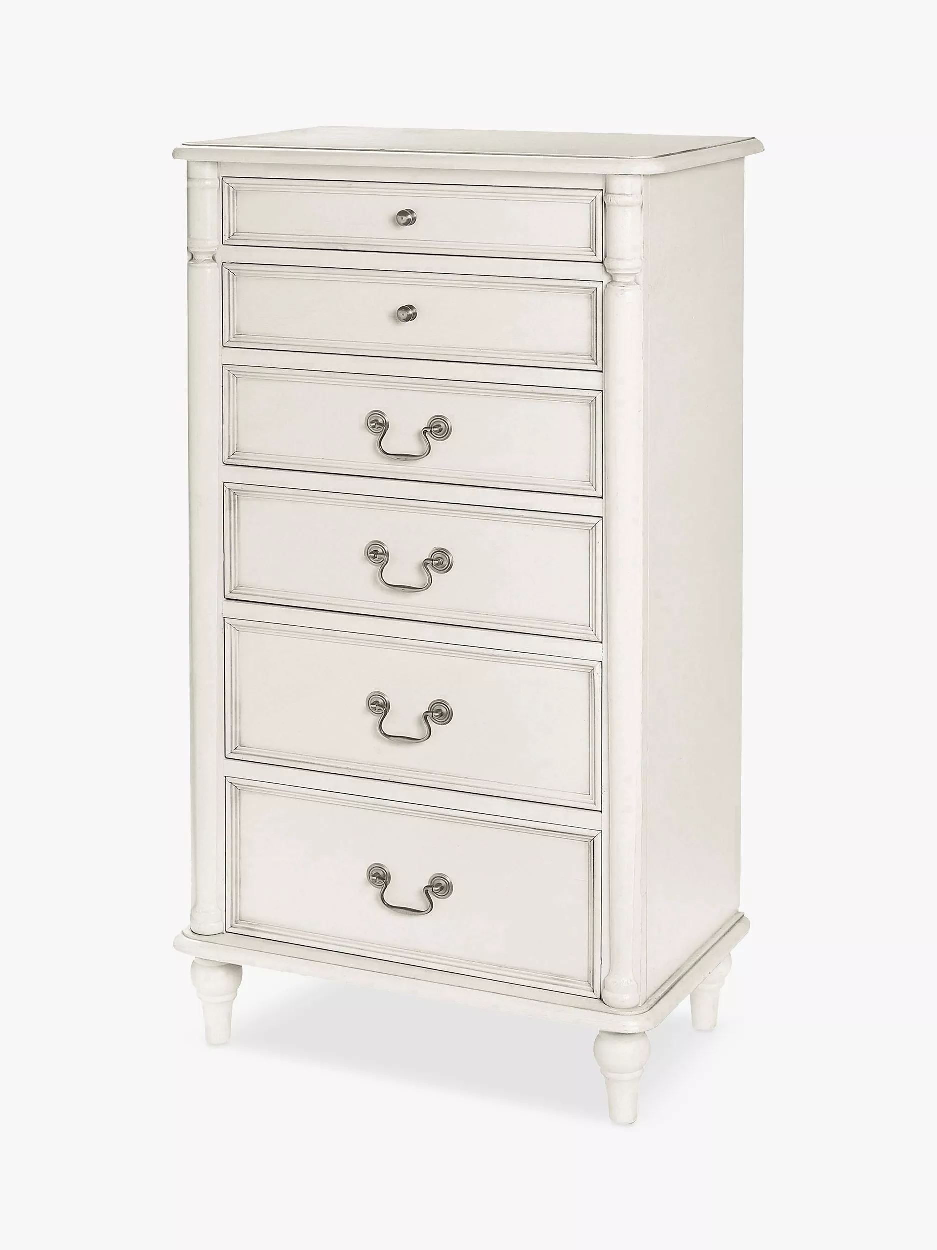 Turned wooden legs and panelling detail honours the timeless aesthetic of this chest of drawers, which is made from sturdy timbers. With a tall and narrow profile, it's well-suited in rooms which have limited floor space and six drawers in total provide a helpful amount of storage space. Antique-style handles complement its aged-effect finish which has been created from a hand-applied patina.